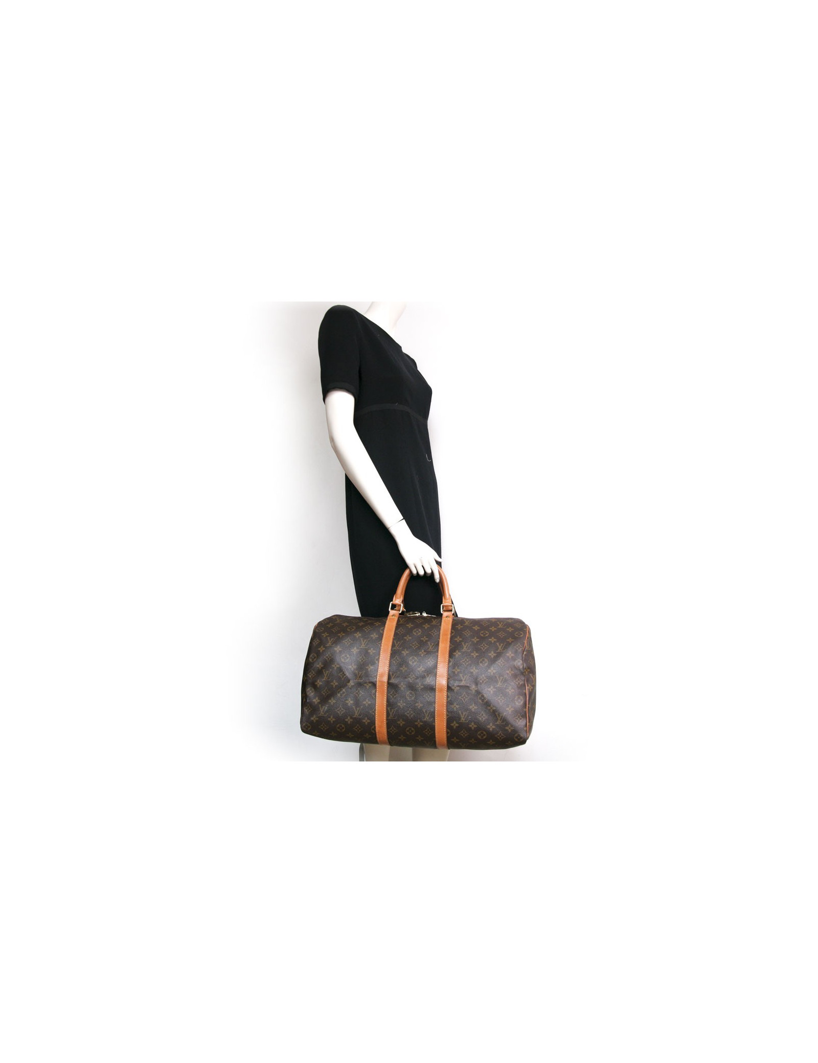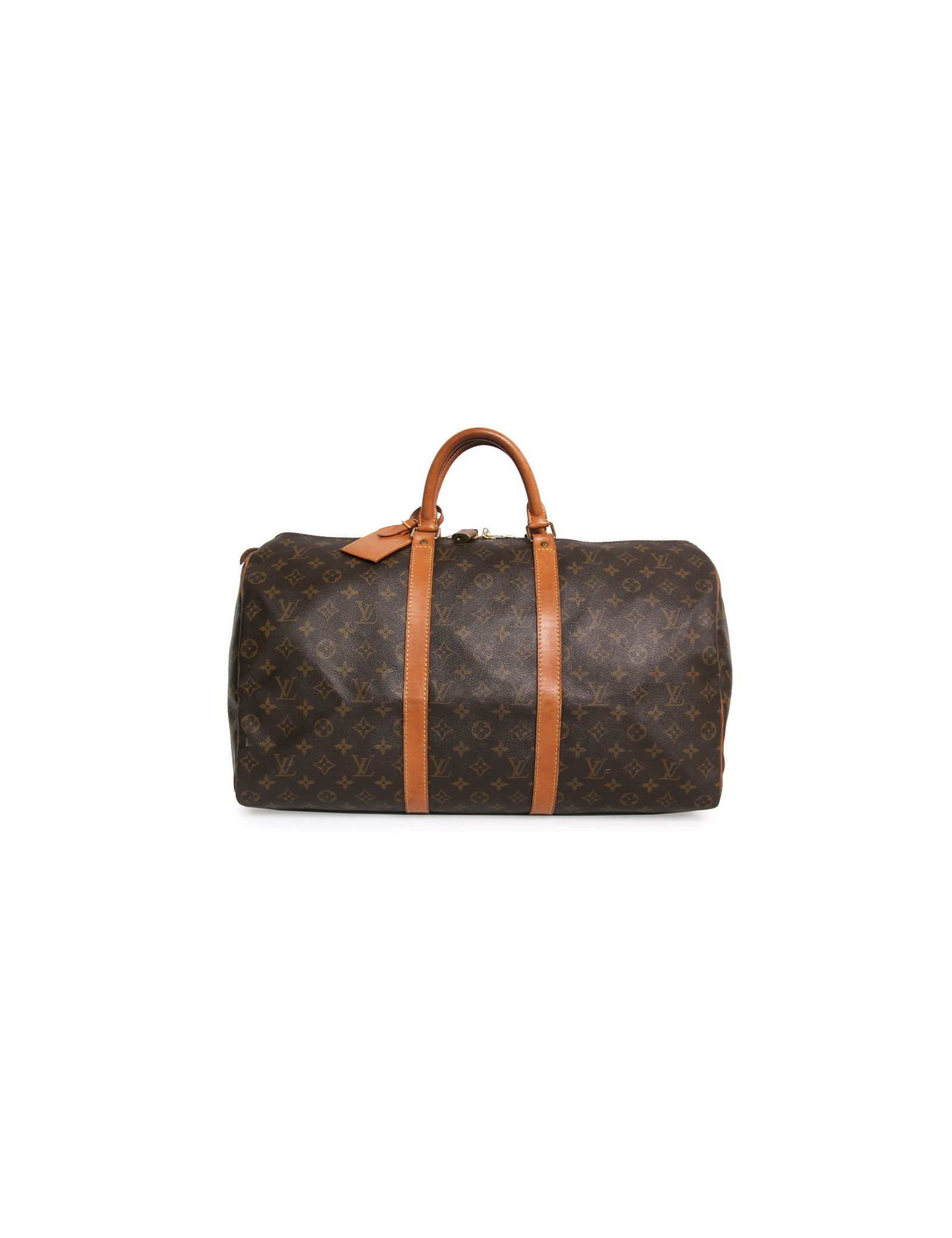 Sac "keepall 50" de la Maison Louis Vuitton en toile monogram. Une icône depuis sa création en 1930. Léger, souple et toujours prêt pour un départ imminent mais surtout pratique de par sa taille cabine. Les pièces métalliques sont en laiton doré. Fermeture zippée. Porté main à l'aide de deux poignées. Porte nom et cadenas. La doublure est en toile marron. Les parements sont en cuir de vache naturel. En très bon état. Très légère patine du cuir.