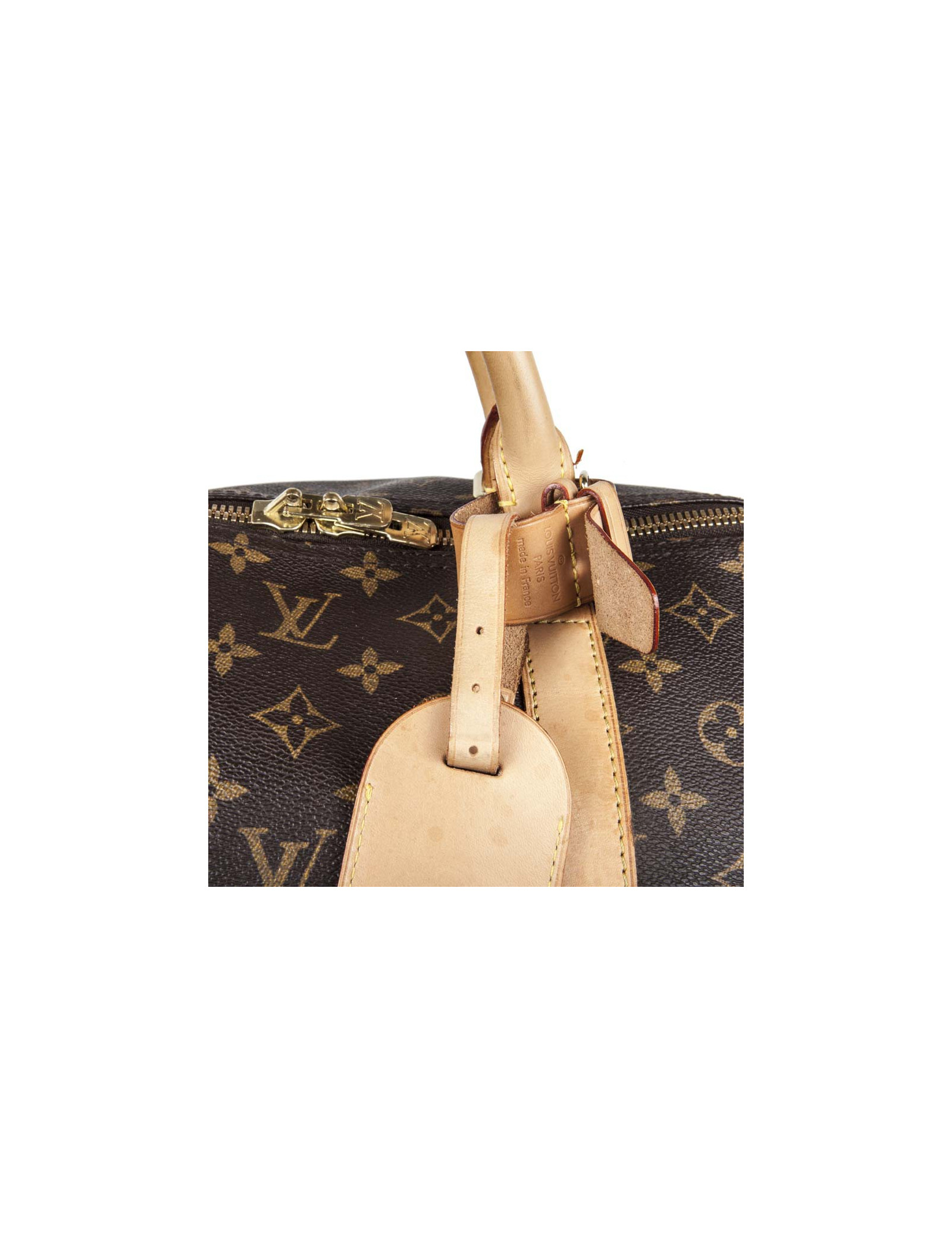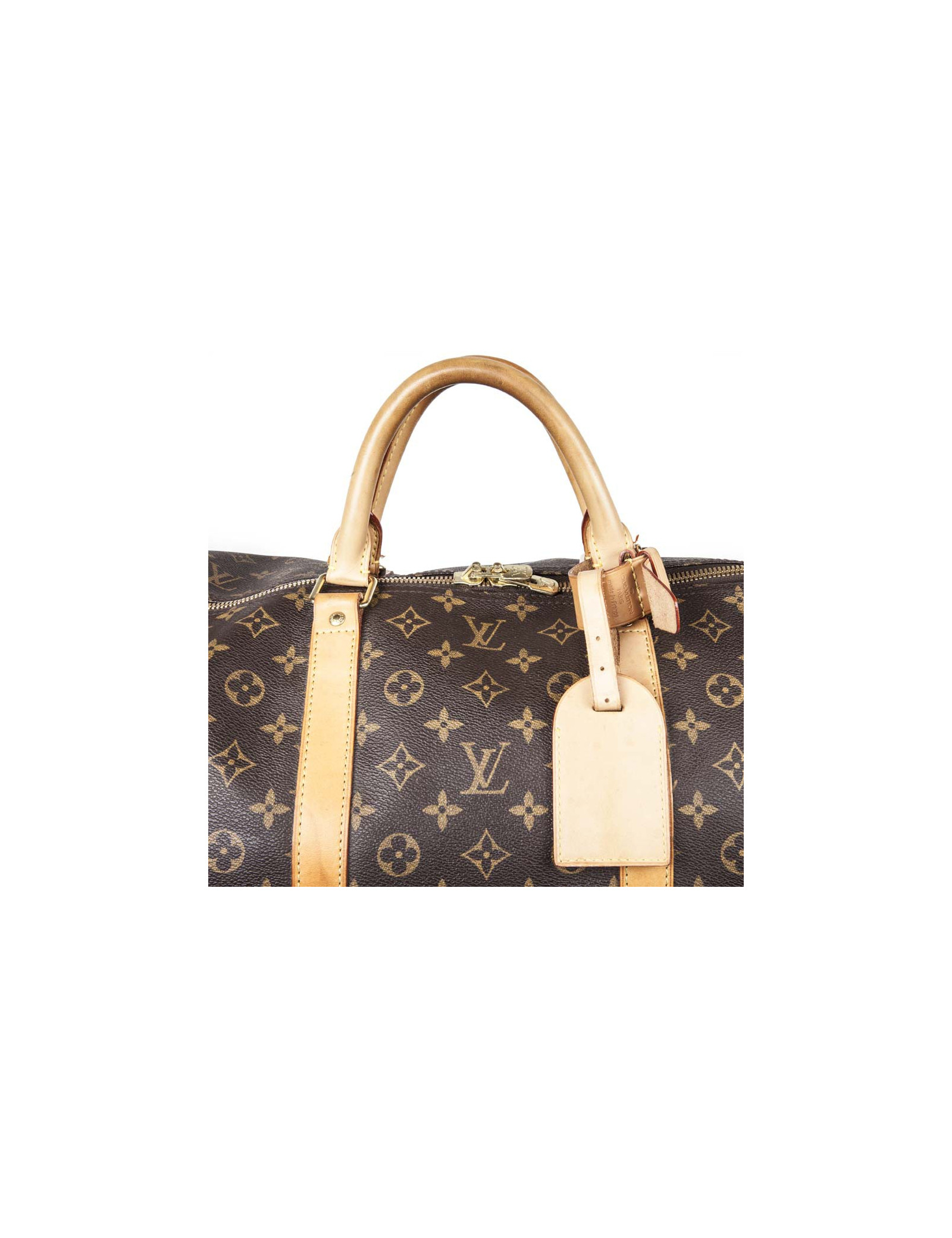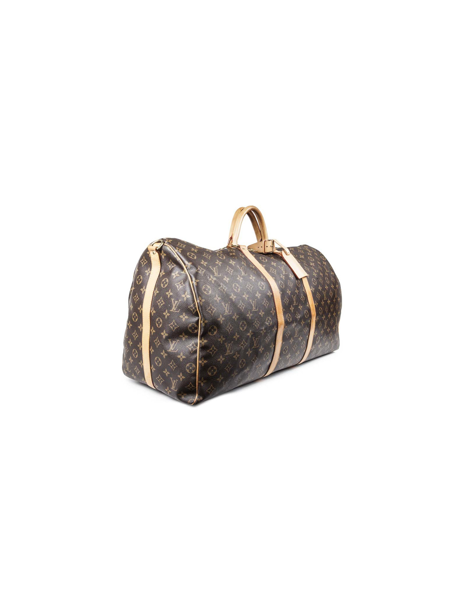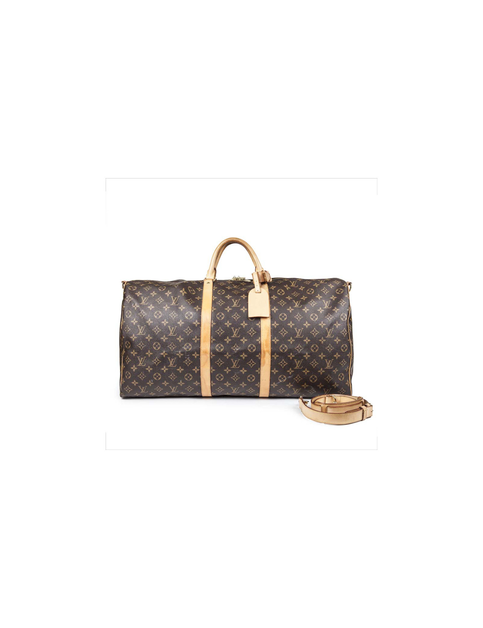 Sac de voyage keepall 60 en toile monogram, livré avec sa bandoulière, son porte étiquette, son attache poignées. Accastillage doré.