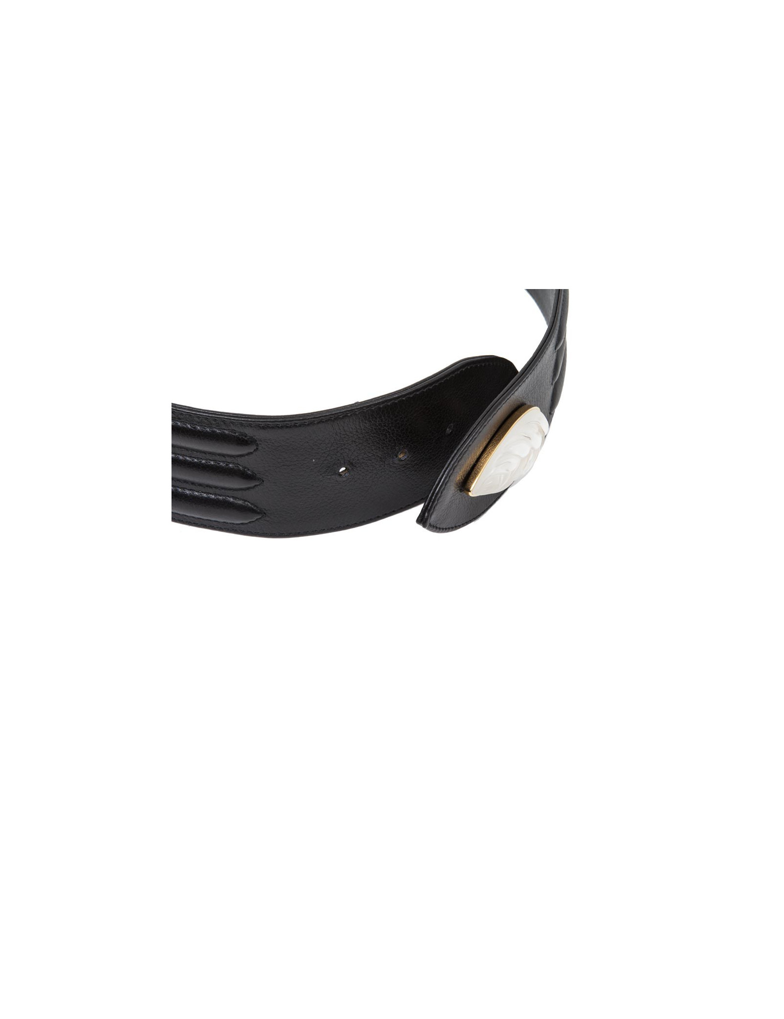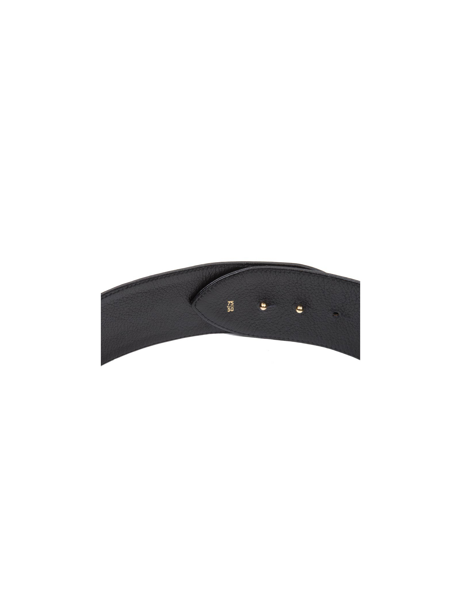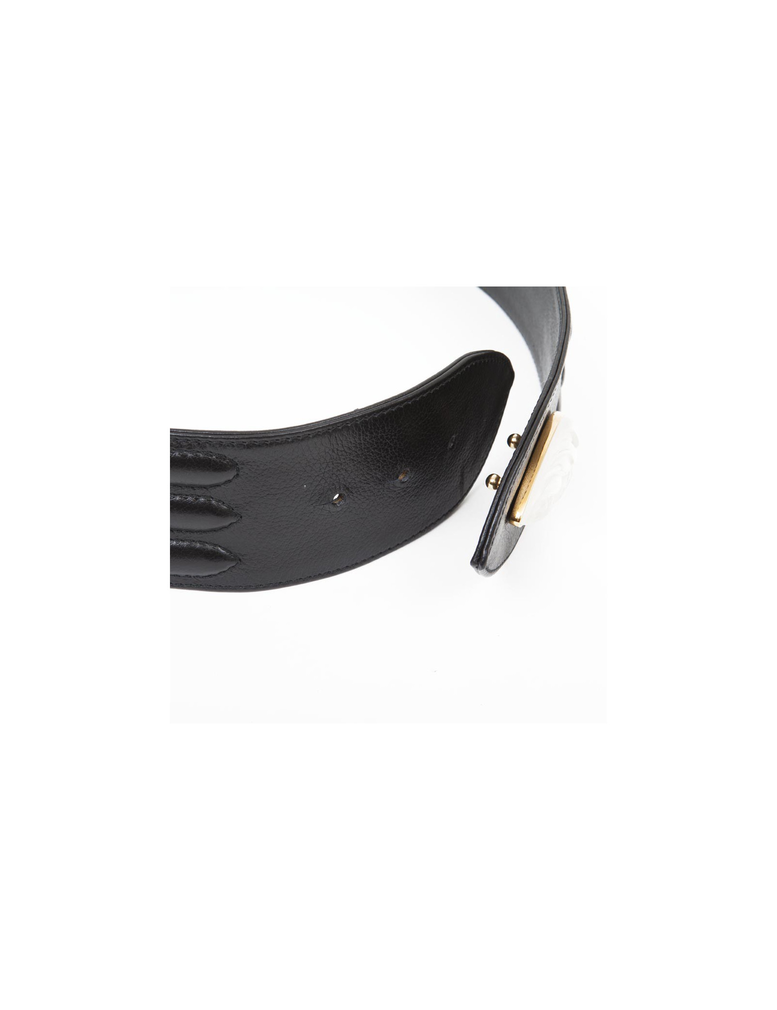 Ceinture Lalique T 75 en cuir grainé noir. Le bijou sur la ceinture est serti d'un cristal taillé en feuille sur une partie dorée.