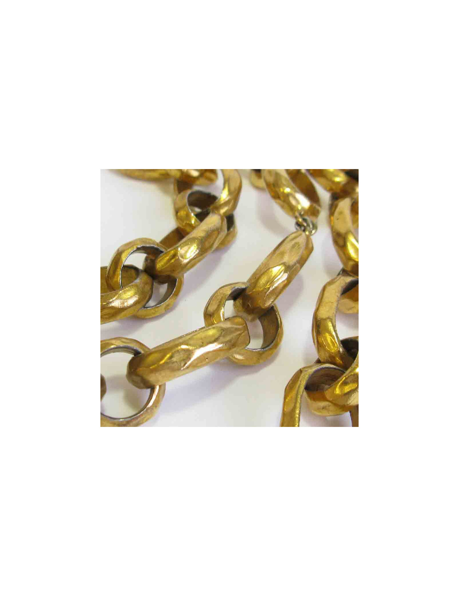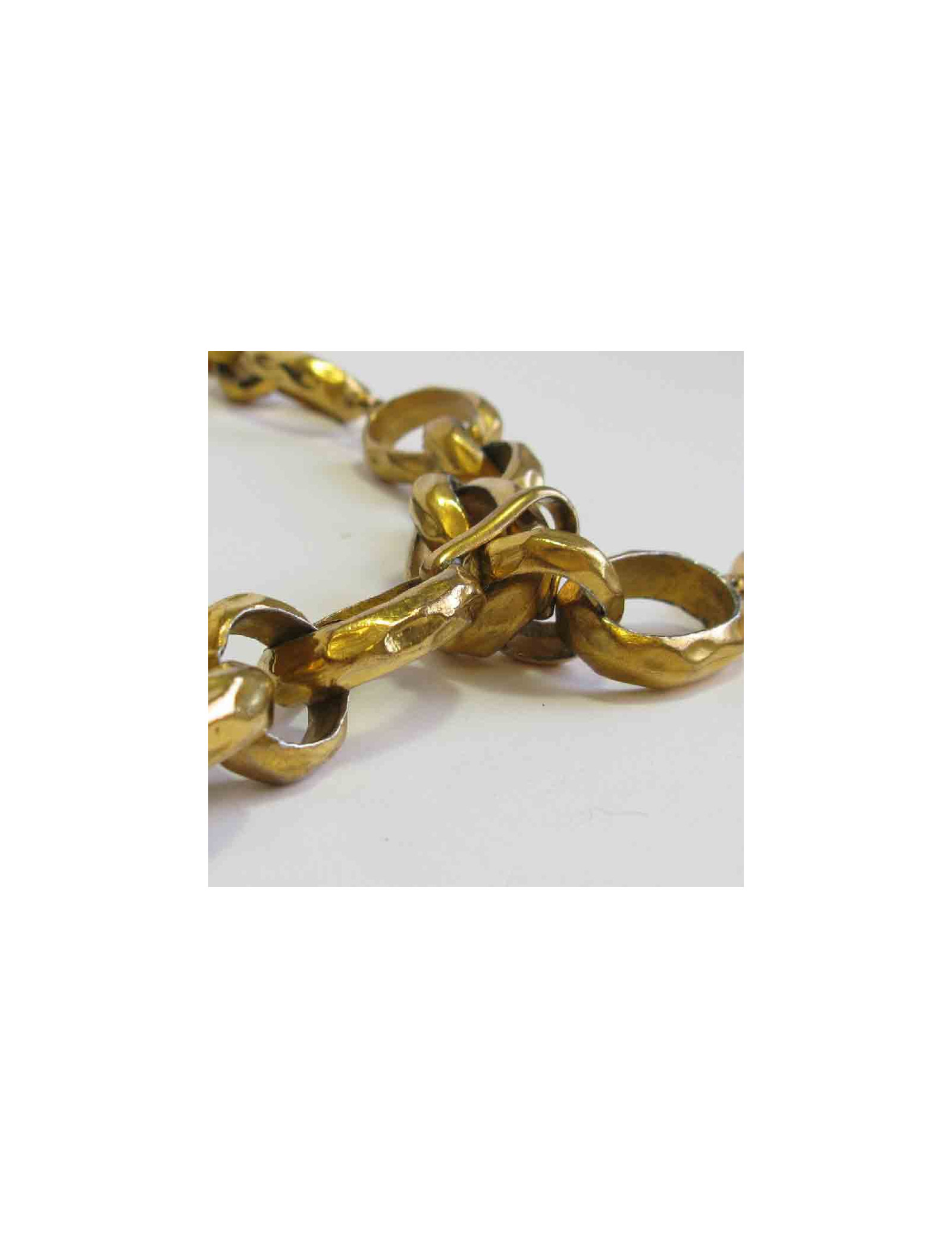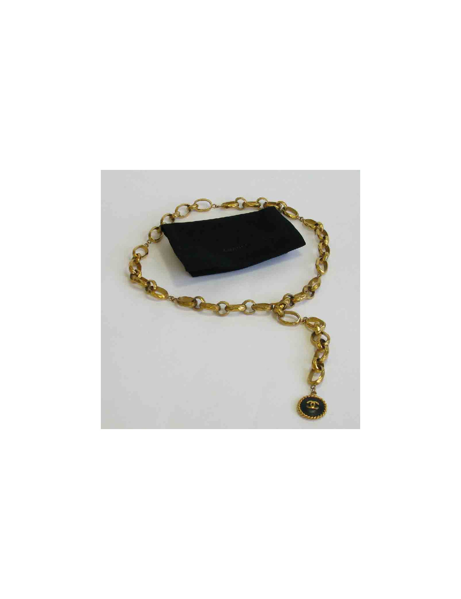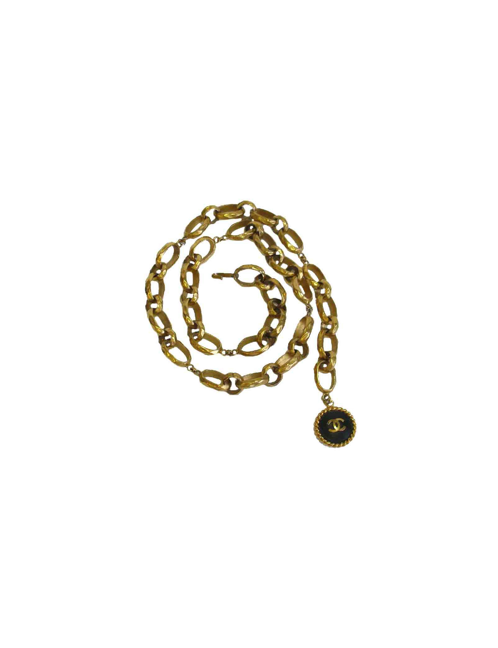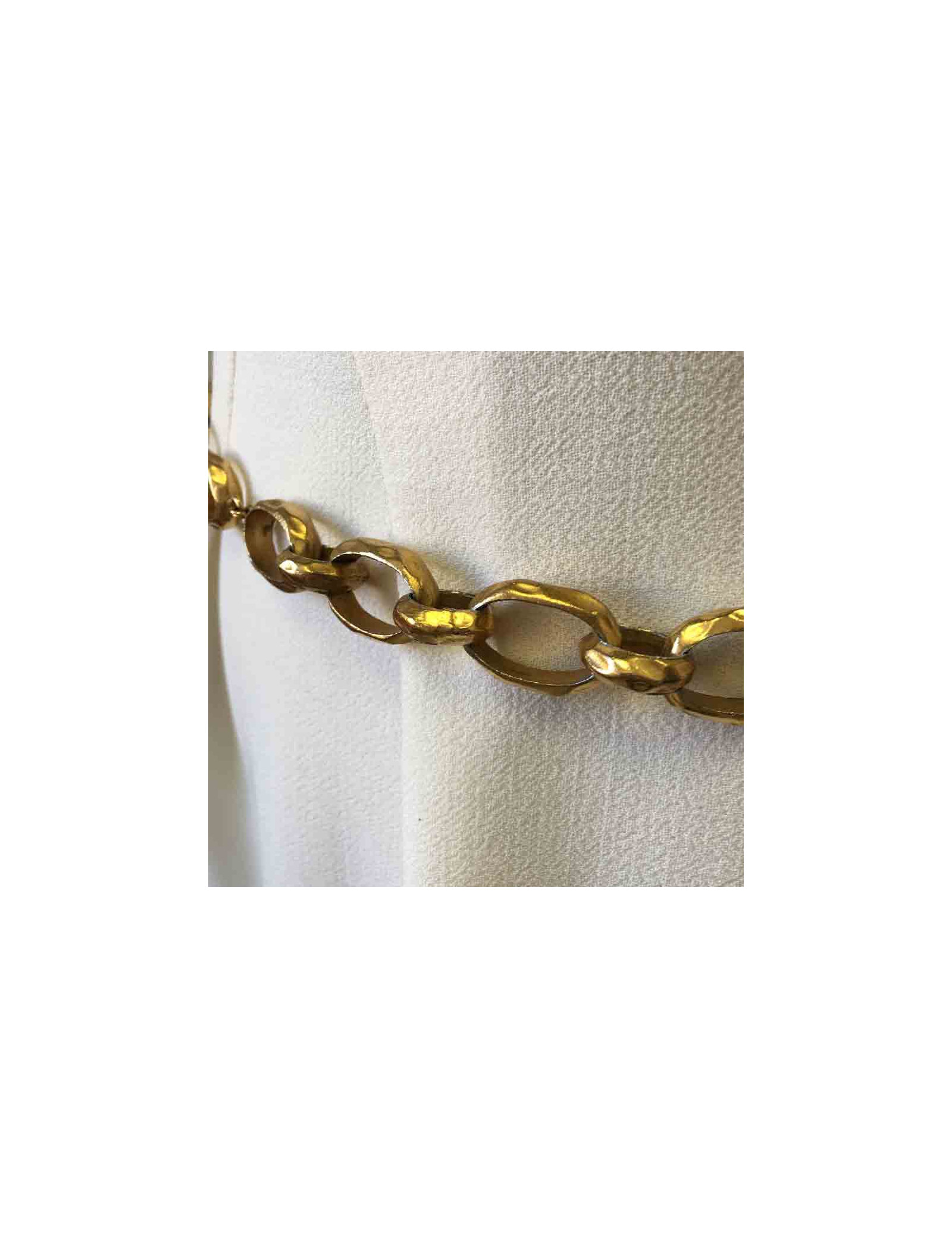 Ceinture CHANEL vintage, chaîne à gros anneaux, effet martelé. une médaille ronde cuir et métal doré se trouve à l'extrémité de la ceinture. Fermoir crochet.