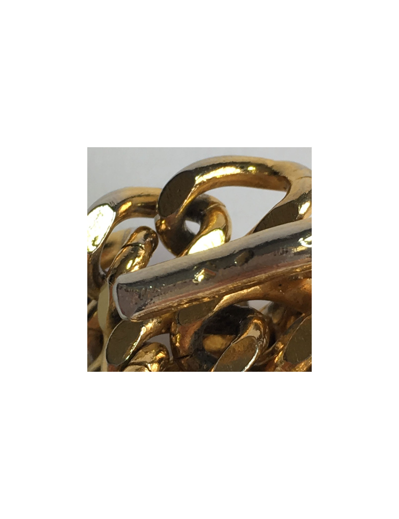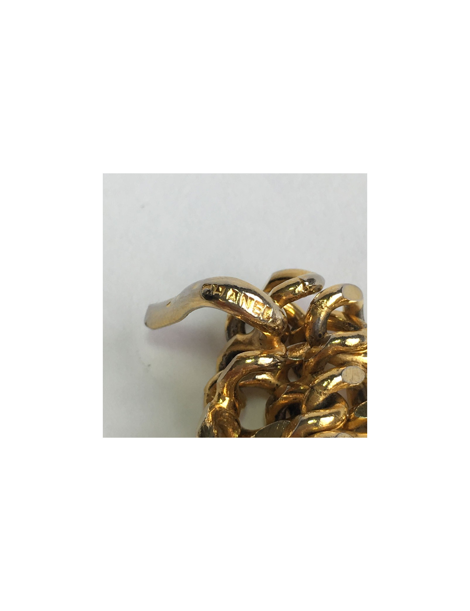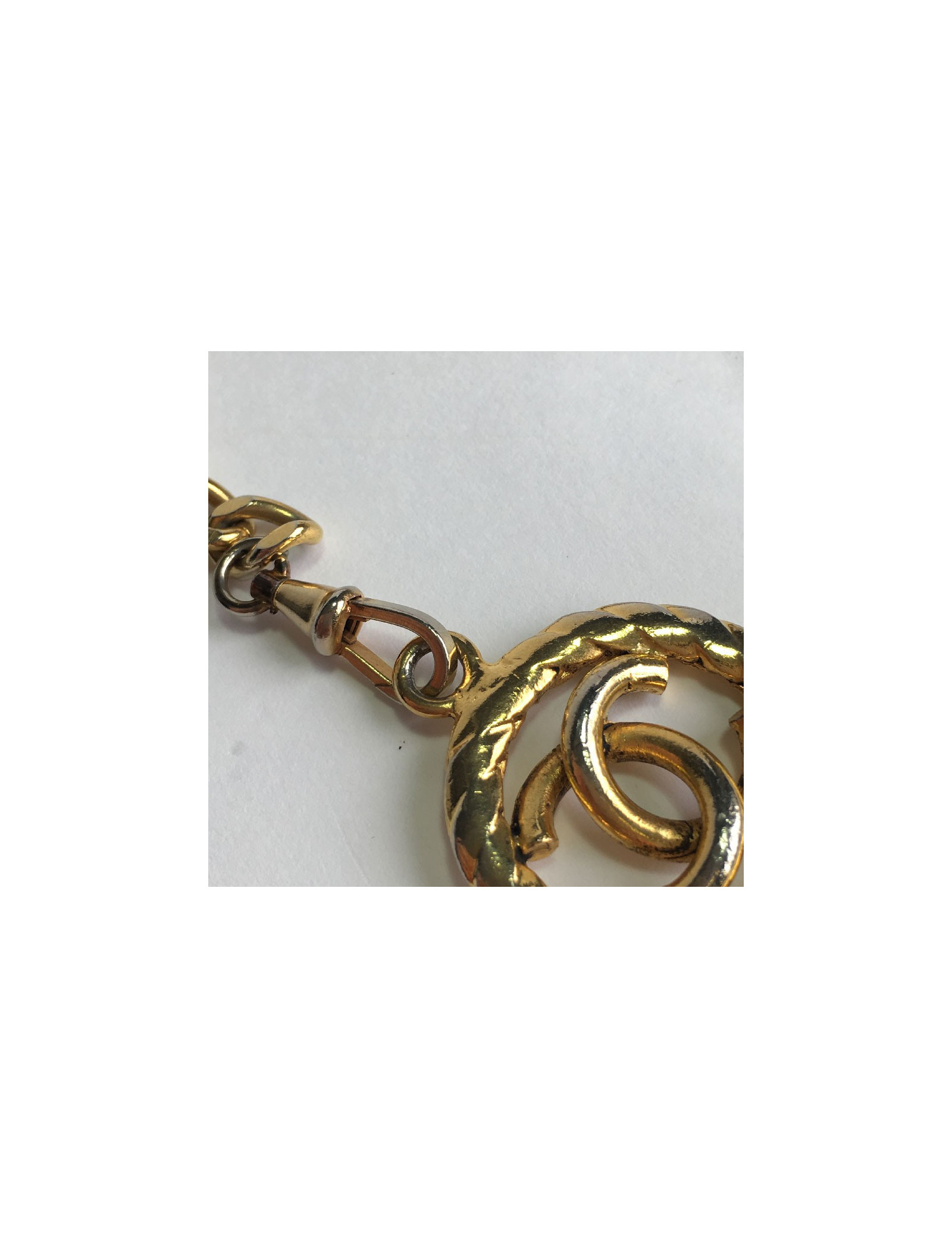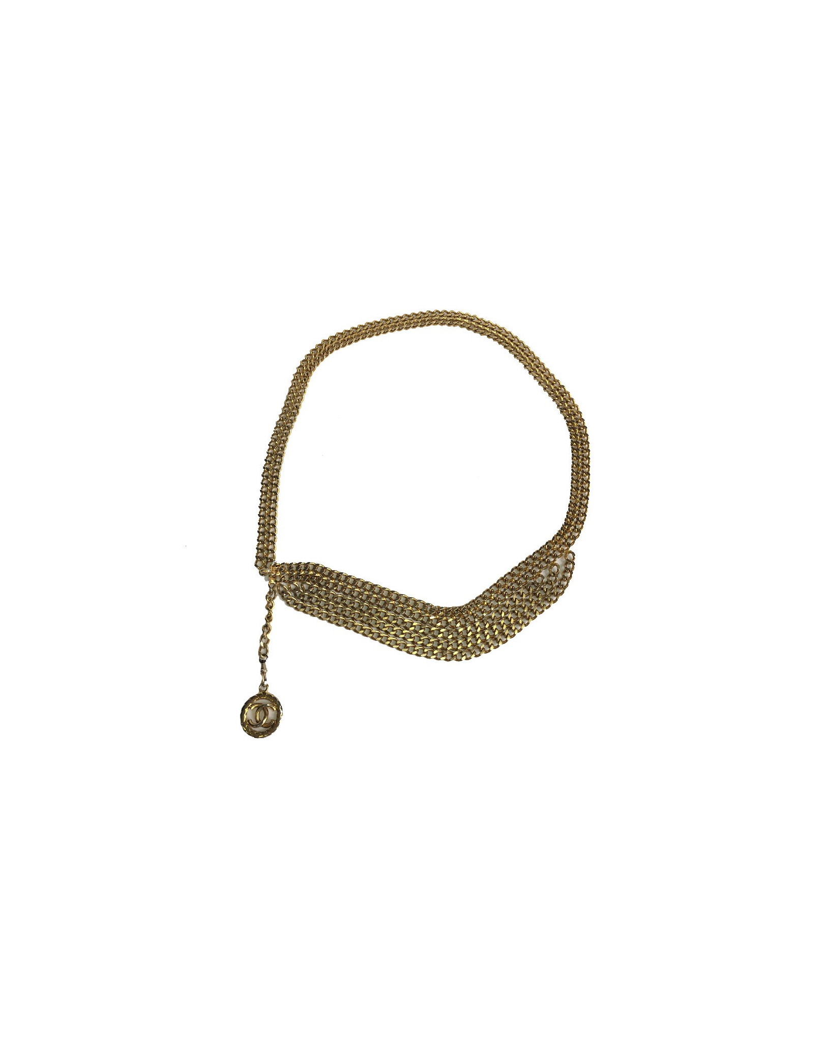 Ceinture Chanel en maille dorée. Elle se termine par un CC dans un rond.