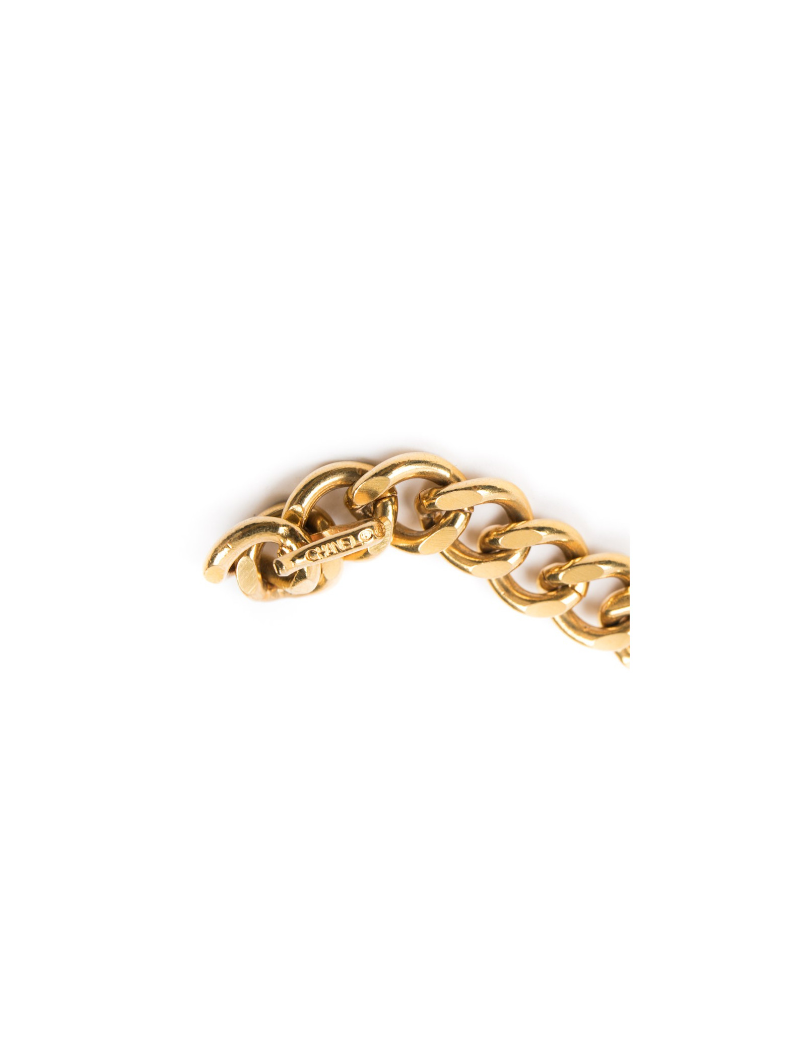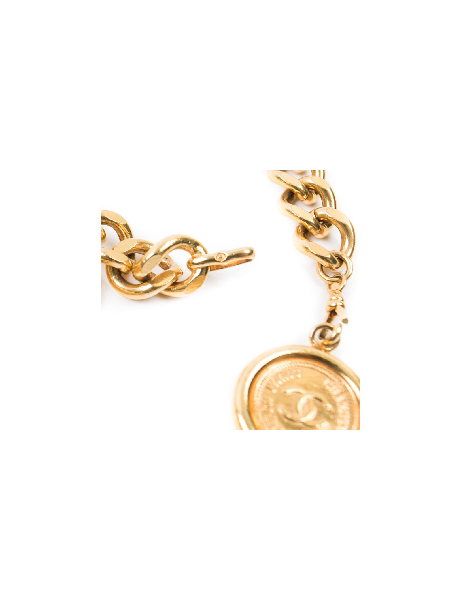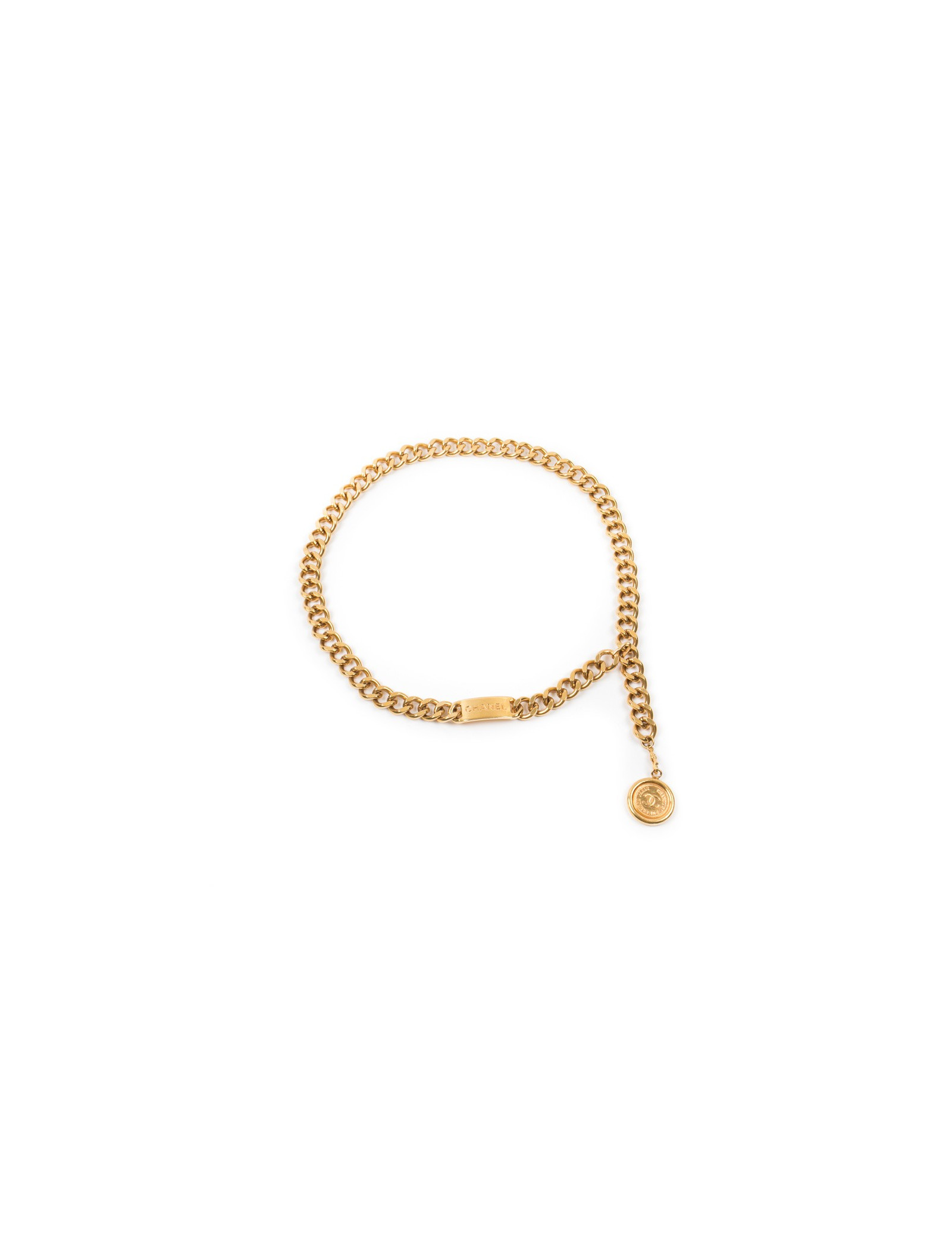 Ceinture vintage chaîne en métal doré, plaque avec l'inscription Chanel et médaille.