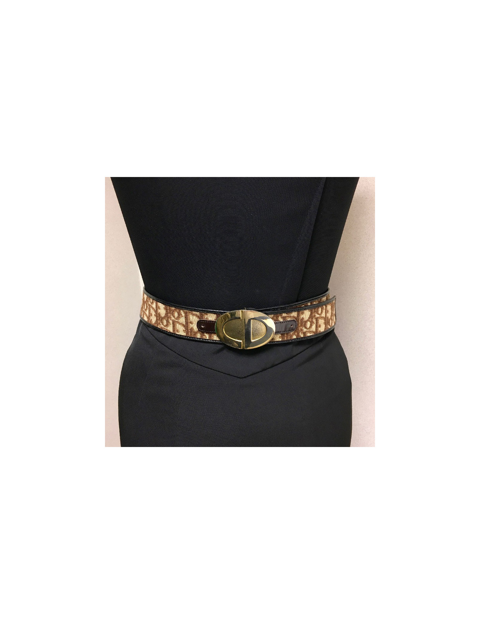 Ceinture Christian Dior vintage en toile monogram marron, boucle en métal doré.