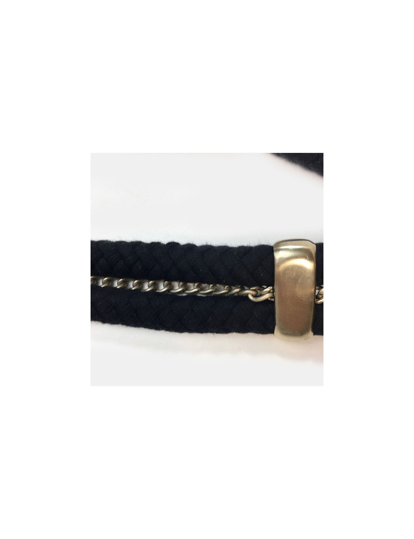 Ceinture Chanel en corde noir et métal doré mat. Superbe sur une robe longue en lin.
