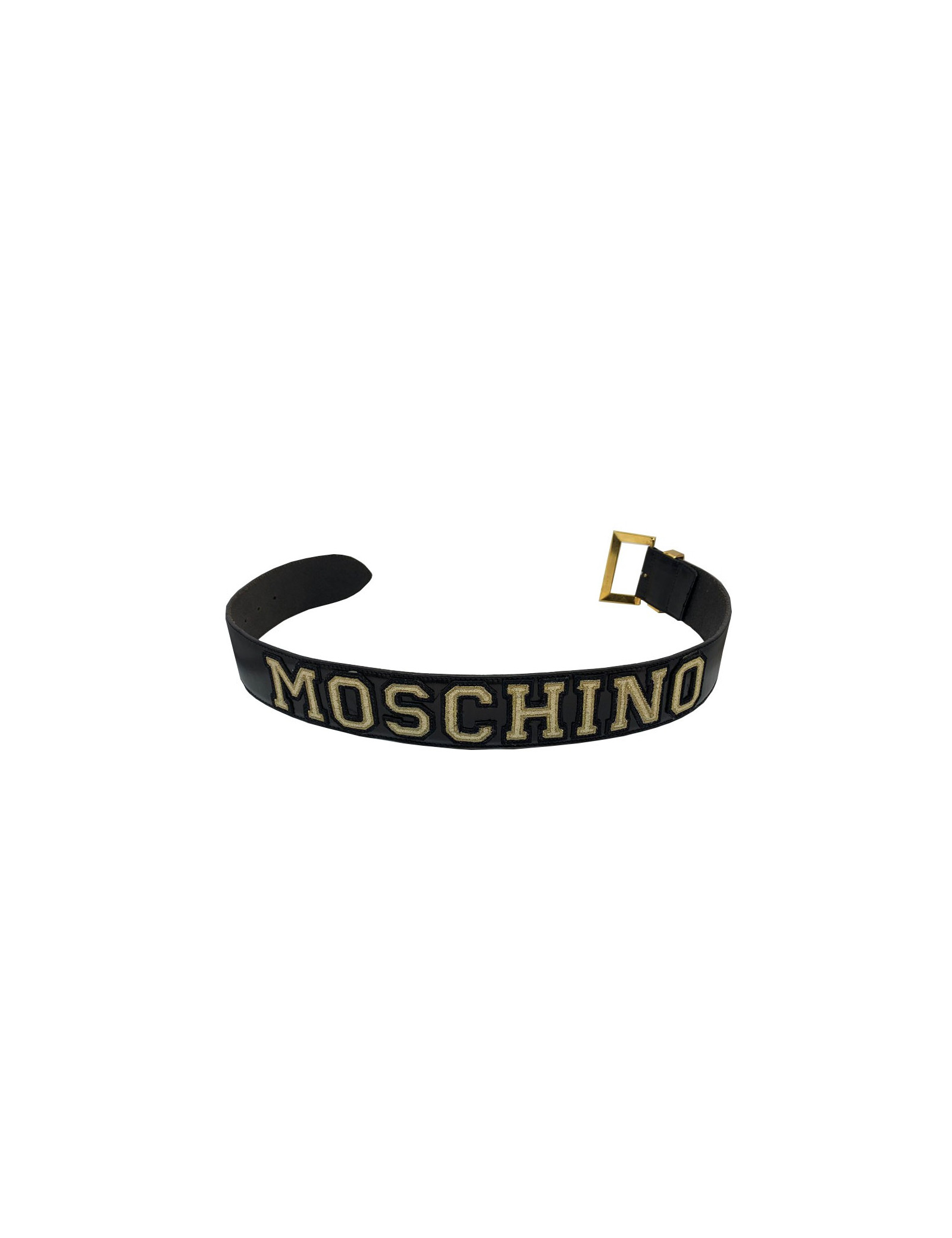 La ceinture provient de la Maison MOSCHINO. Elle est en cuir lisse de couleur noire et porte l'inscription de la marque en tissu doré: "MOSCHINO". La boucle de la ceinture est également en métal doré.