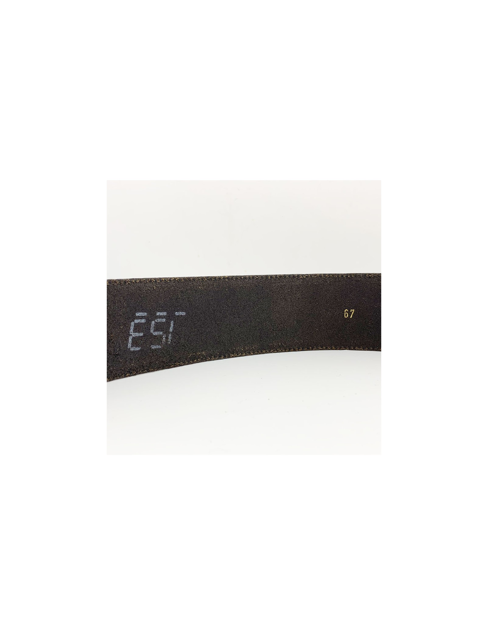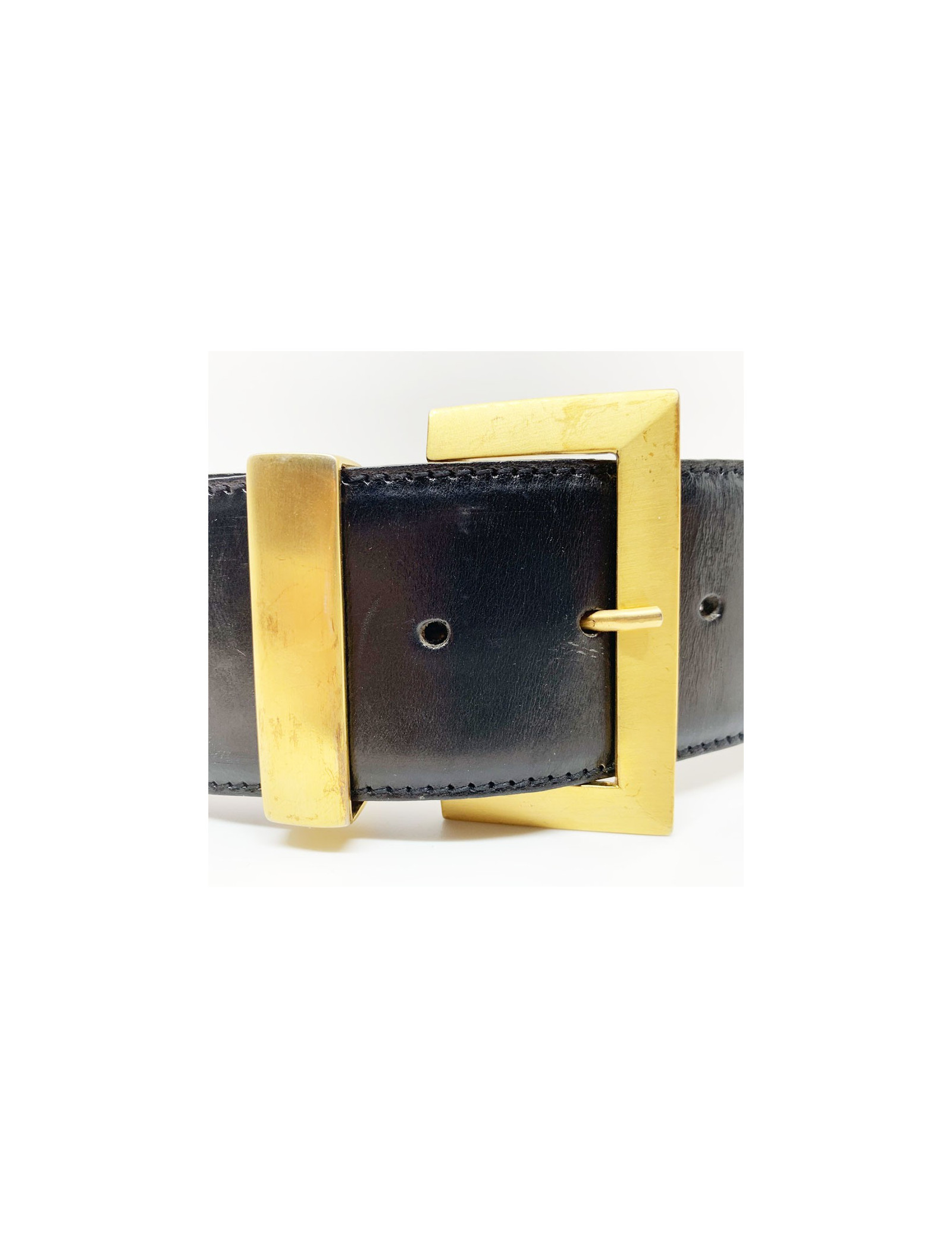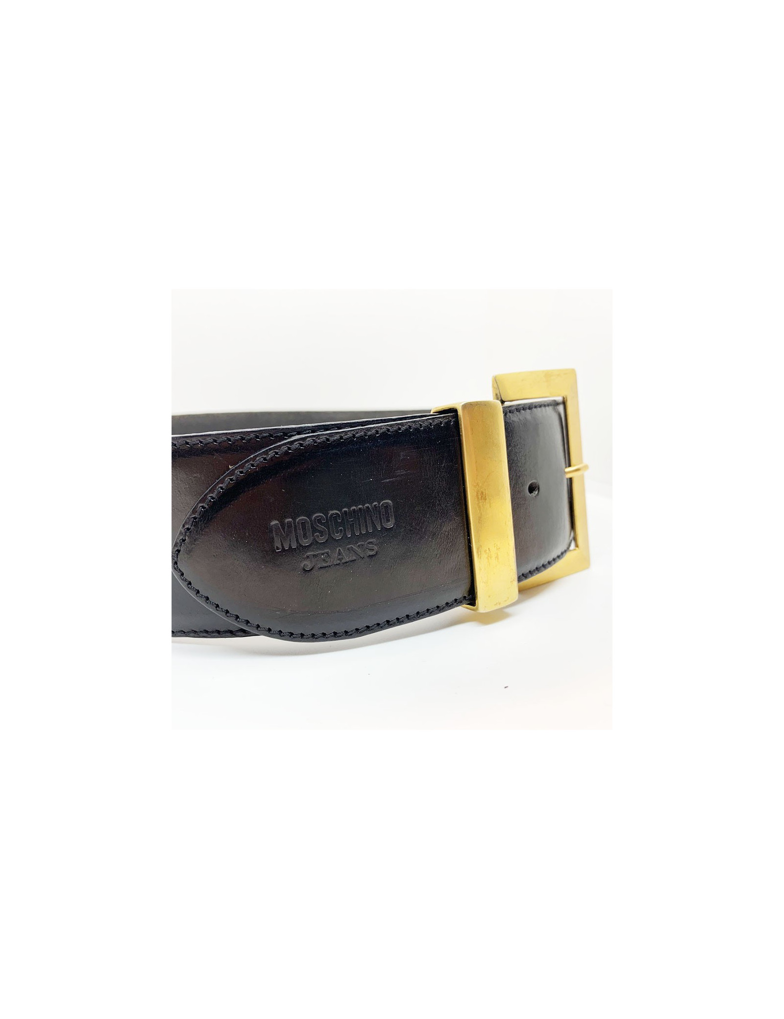 La ceinture est en bon état général. Seules des marques d'usage (plis dans le cuir, trace de chocs sur le métal) sont présentes quoique infimes, et nous empêchent de la mettre en catégorie "Très bon état". La ceinture mesure 63 centimètres au premier trou, 65 centimètres au second, et 68 centimètres au dernier. Elle a une hauteur de 5.5 centimètres. Présence de la marque MOSCHINO JEANS gravée dans le cuir.