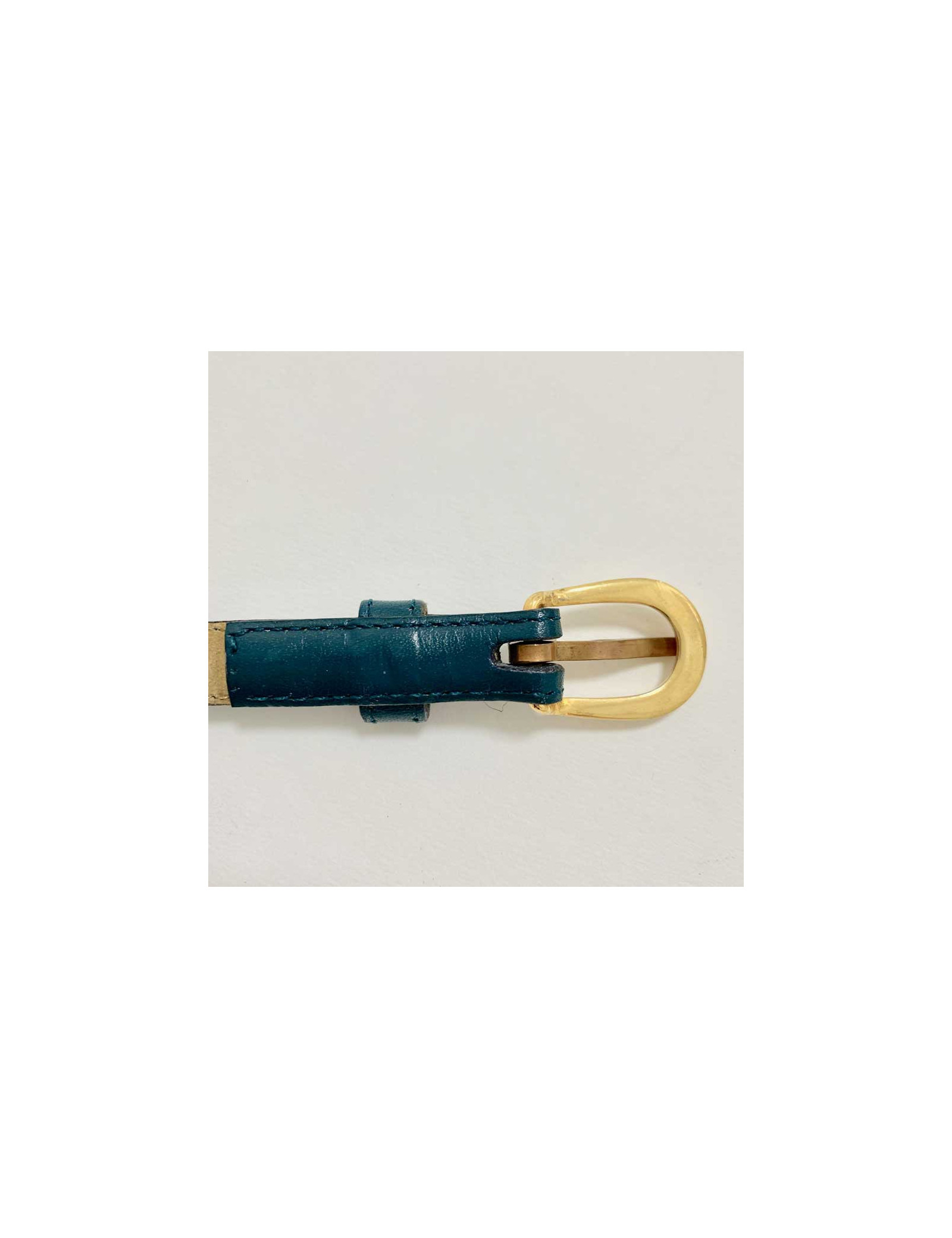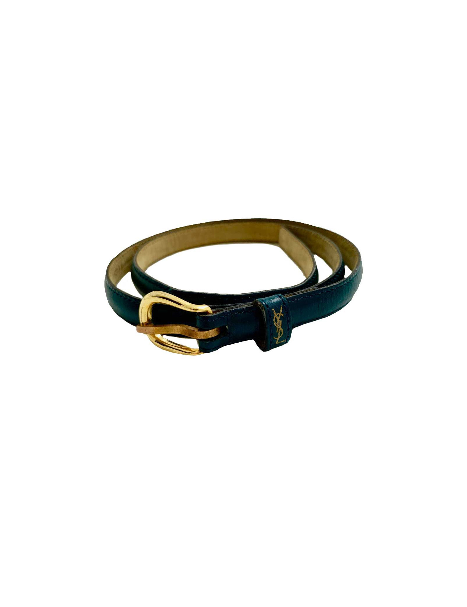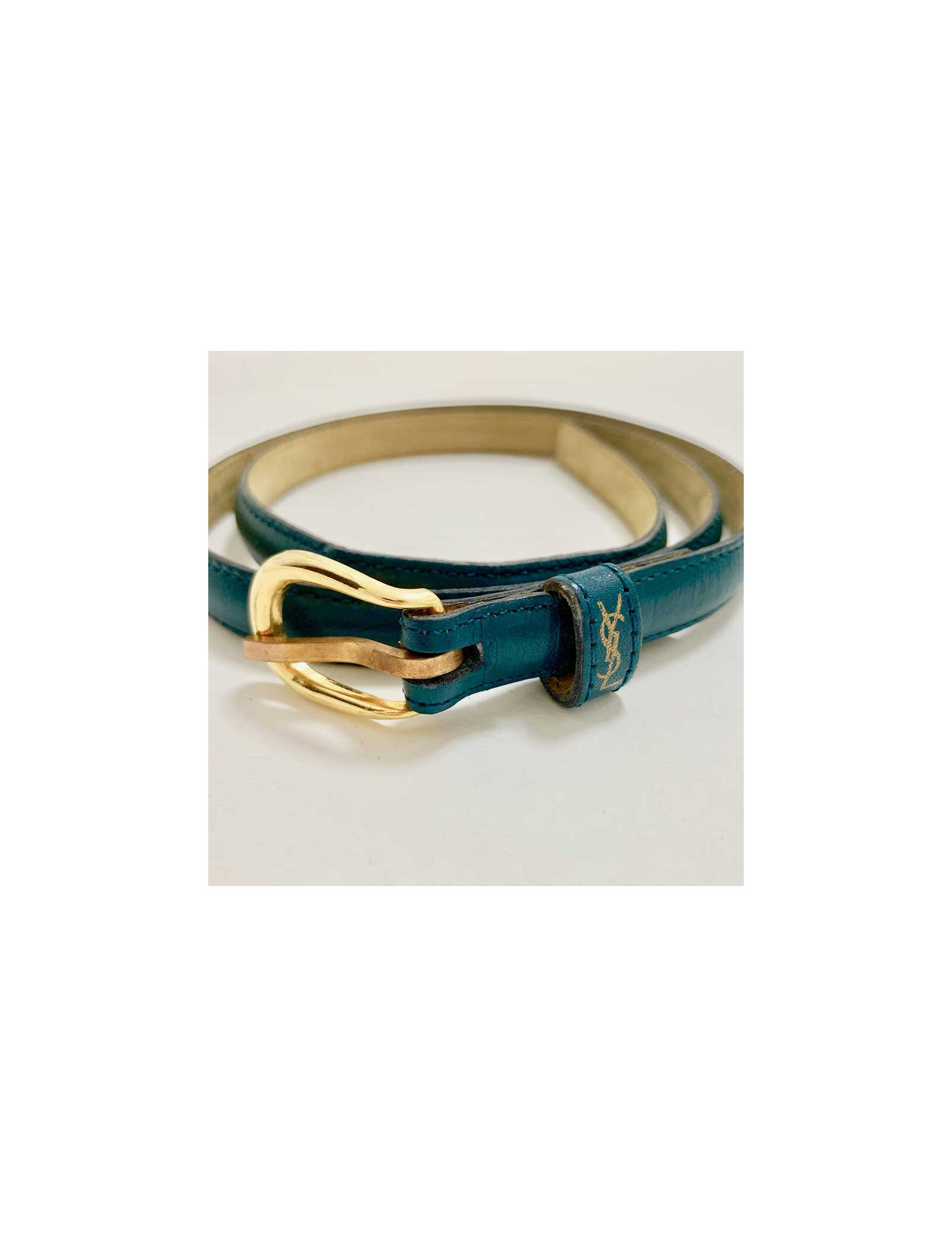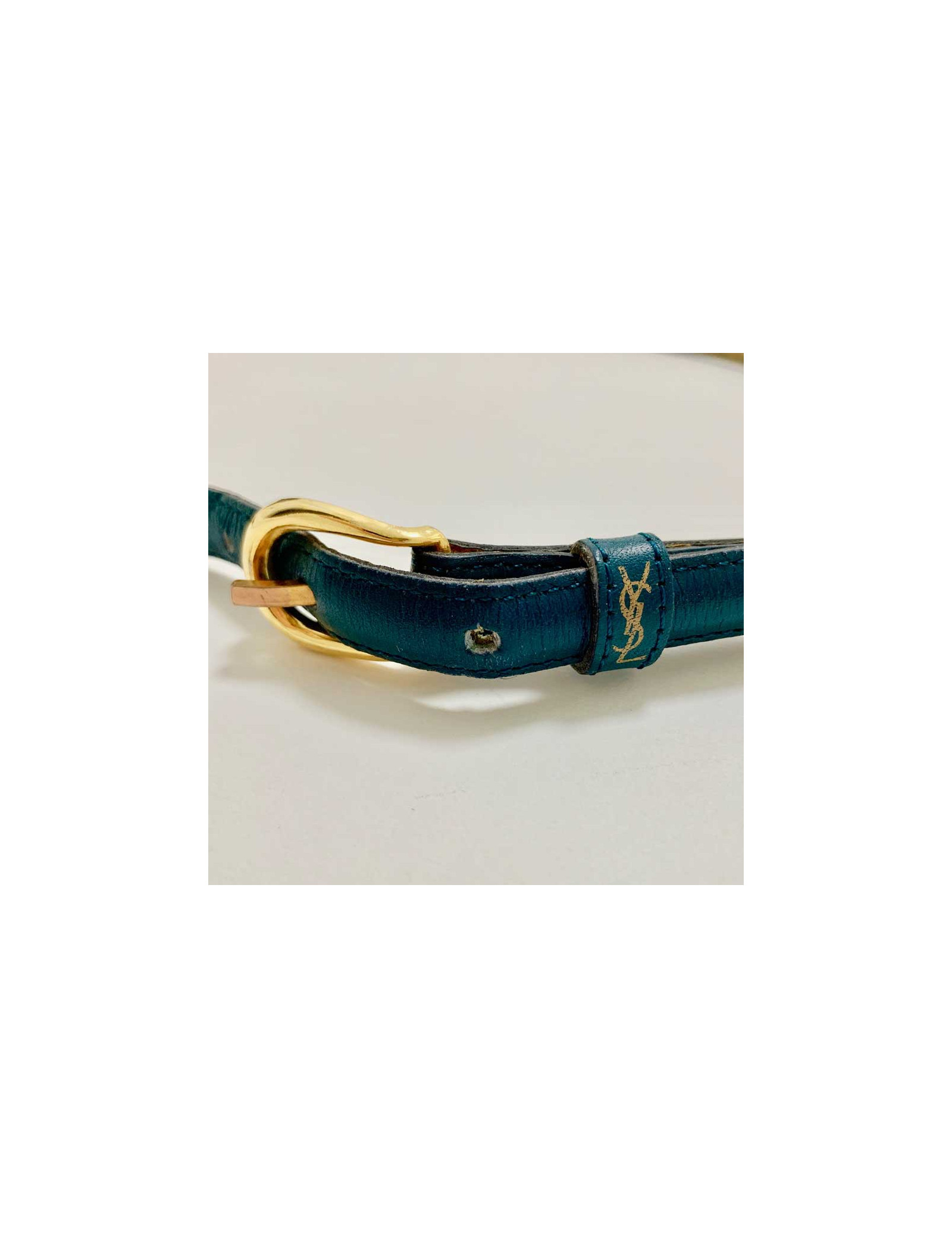 Superbe accessoire de la Maison Yves Saint Laurent. Ceinture fine en cuir bleu canard et cuir beige à l'intérieur. La bijouterie est en métal doré. Les initiales YSL sont en lettres dorées sur le passant.