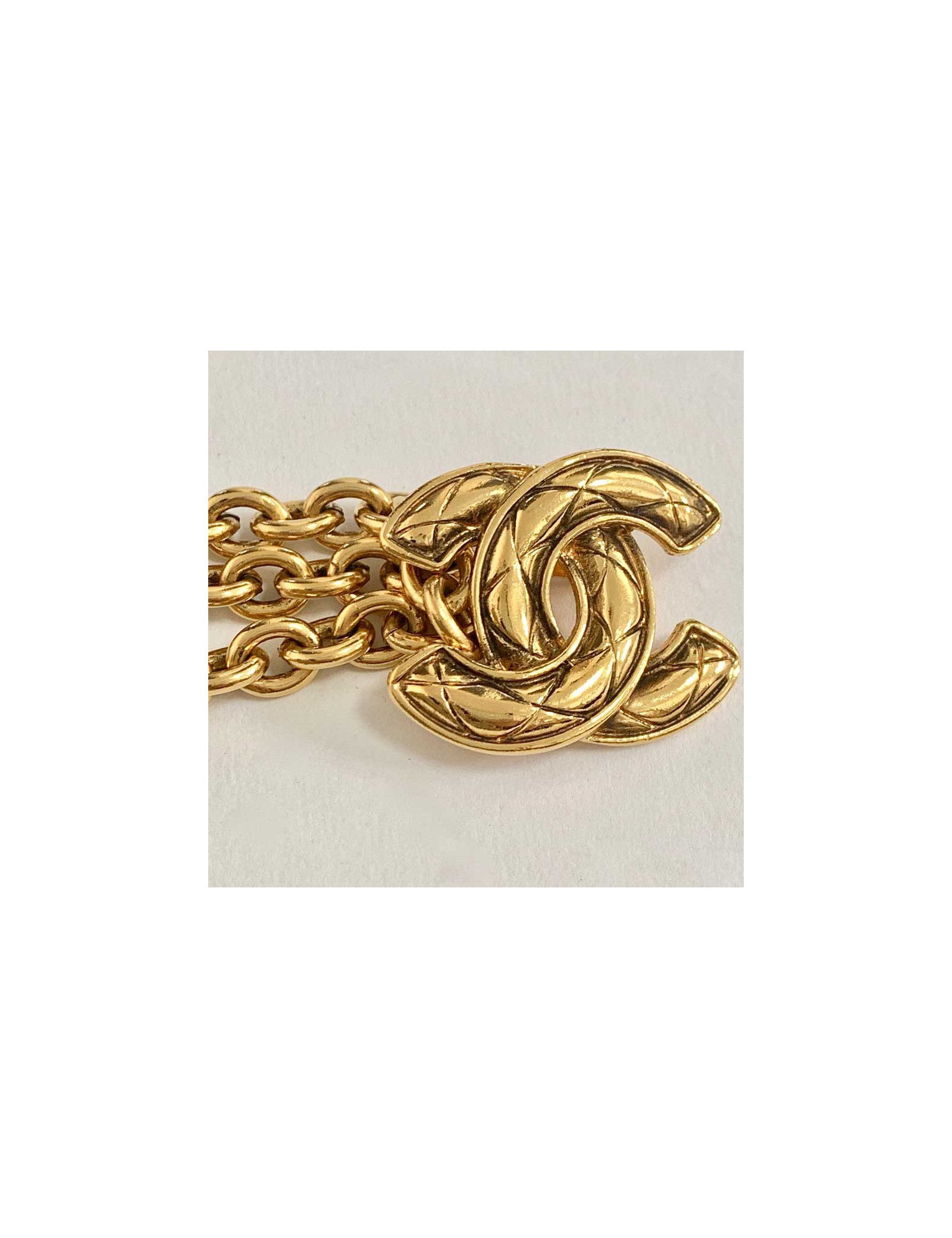 Très belle ceinture CHANEL vintage, chaine en métal doré. Triple chaine sur le devant avec 2 CC en métal effet matelassé. Fermoir CC crochet en métal doré. Fine et élégante vous l'accommoderez facilement avec vos diverses tenues.