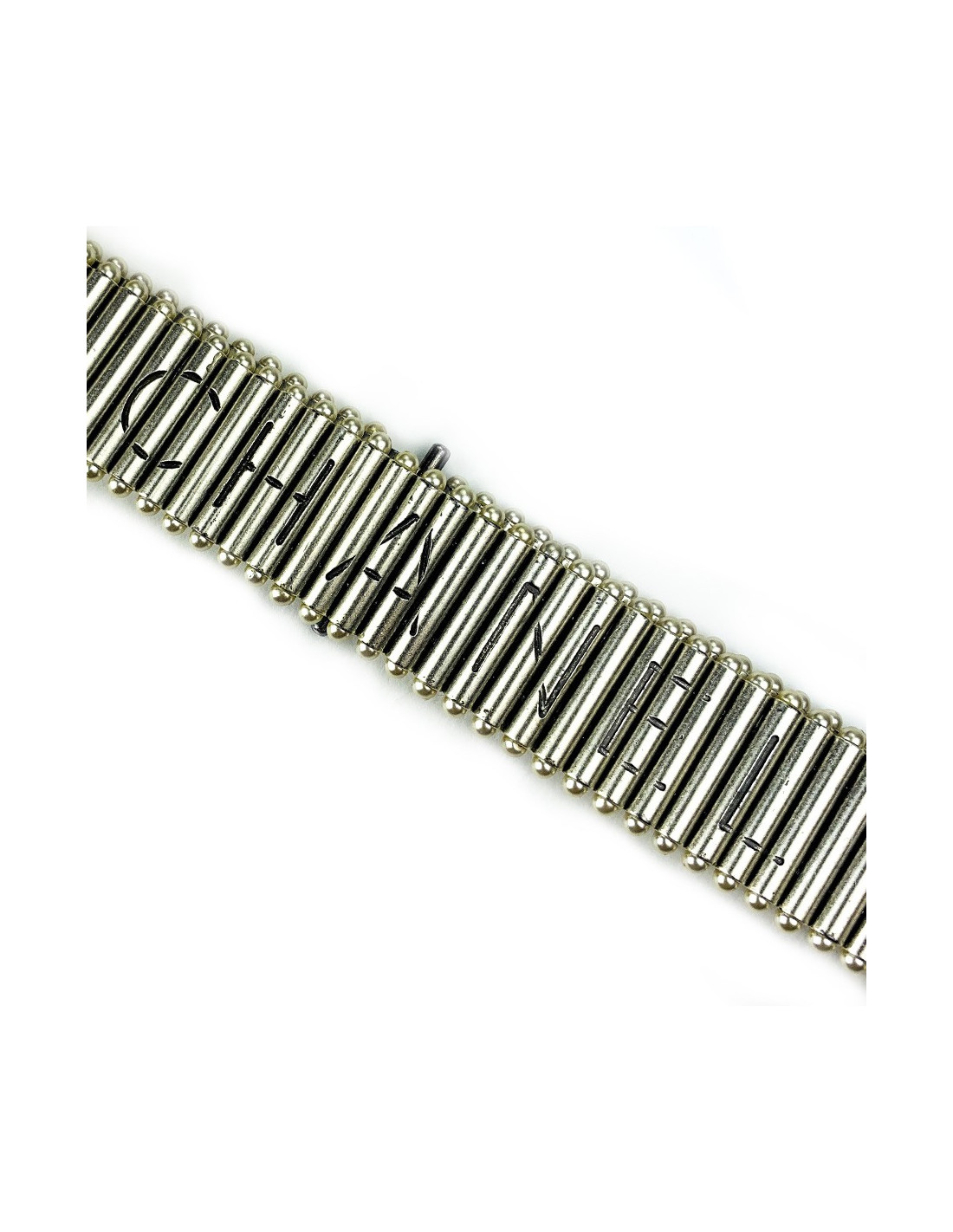 Détails : Elle se compose d'une série de bâtonnets en métal argenté, chacun se finissant de part et d'autre par une perle blanche.La ceinture est en bon état, quelques traces d'oxydation du métal à l'arrière du fermoir. Elle a une longueur de 70 centimètres et elle est non réglable. Elle a a une largeur de 6.8 centimètres.