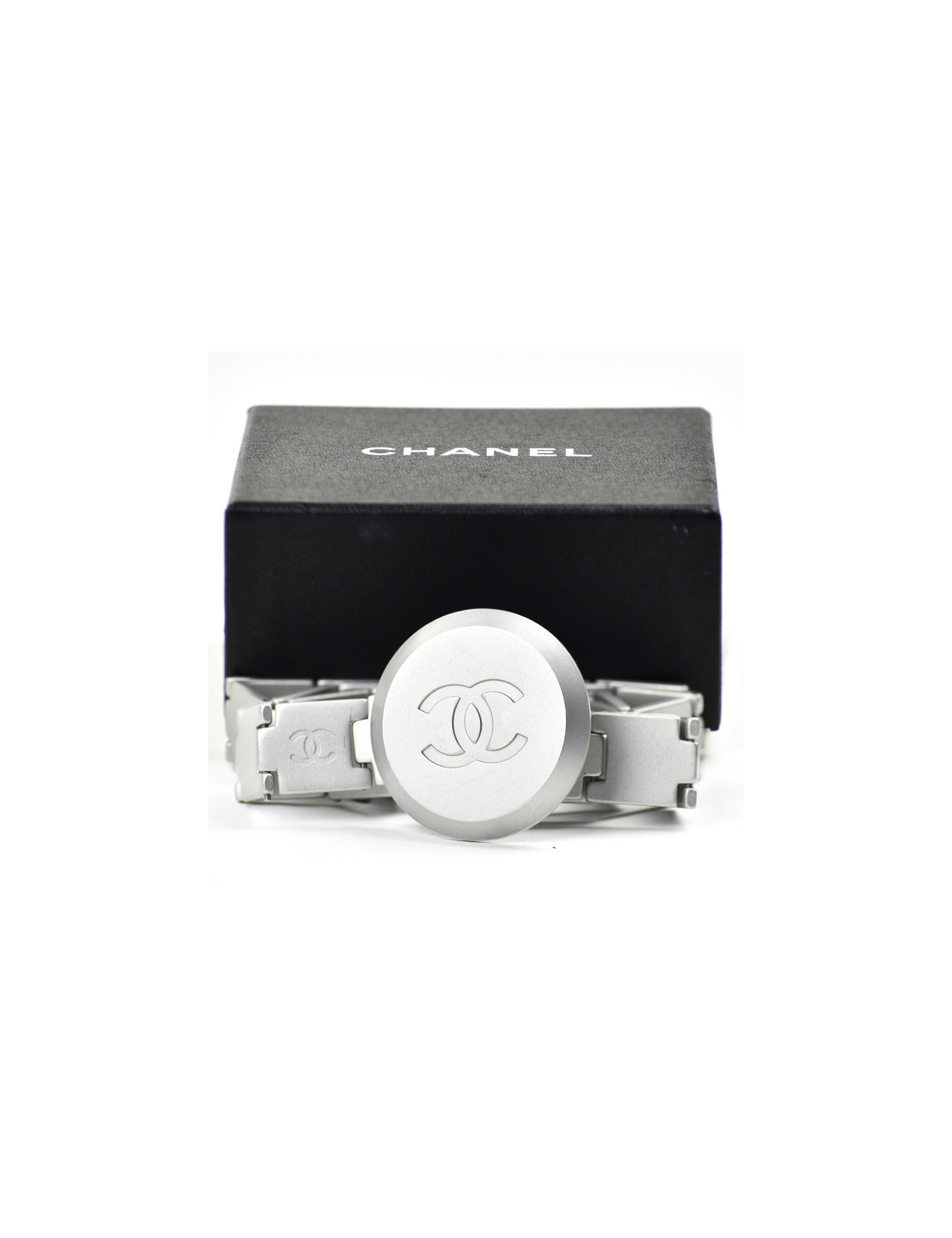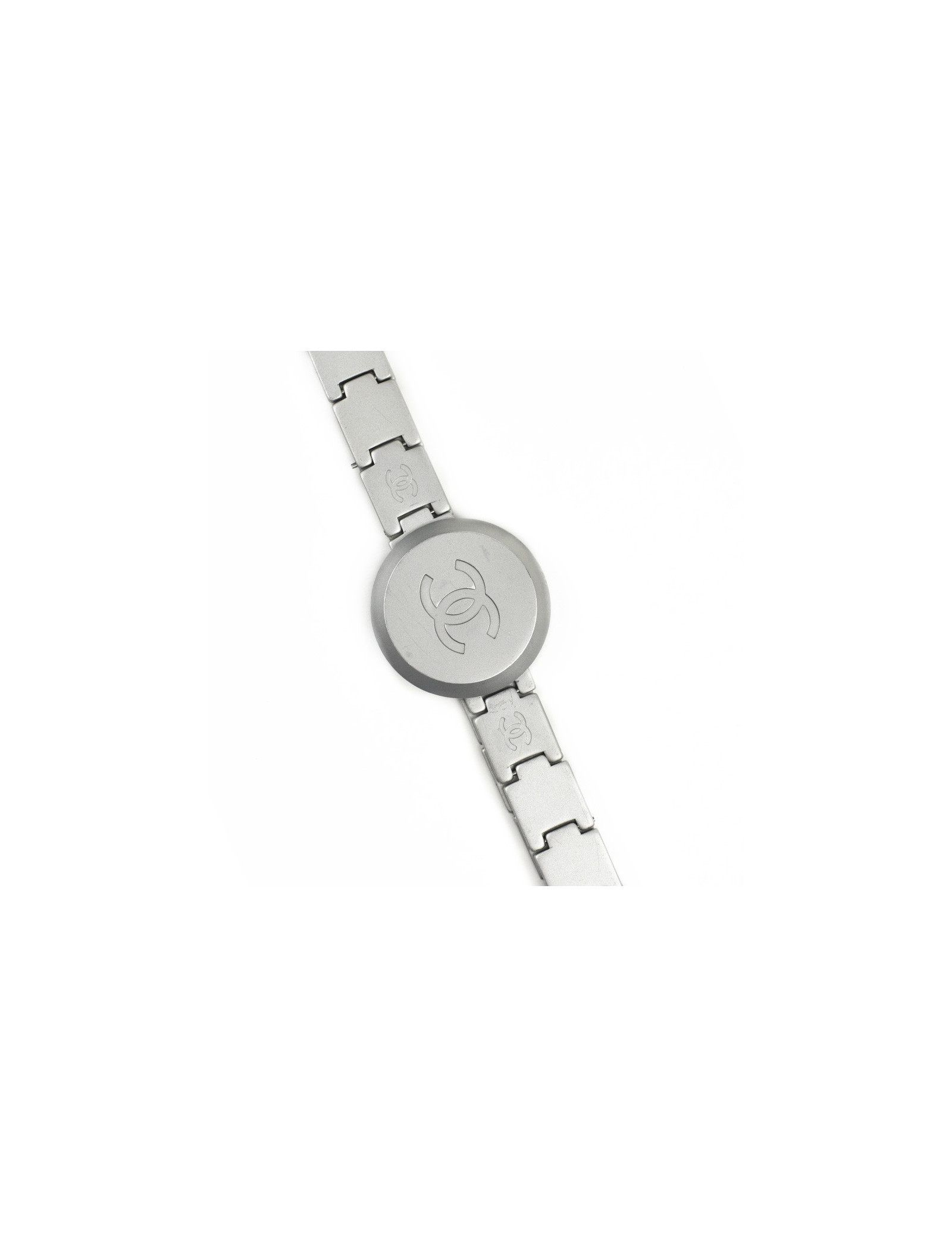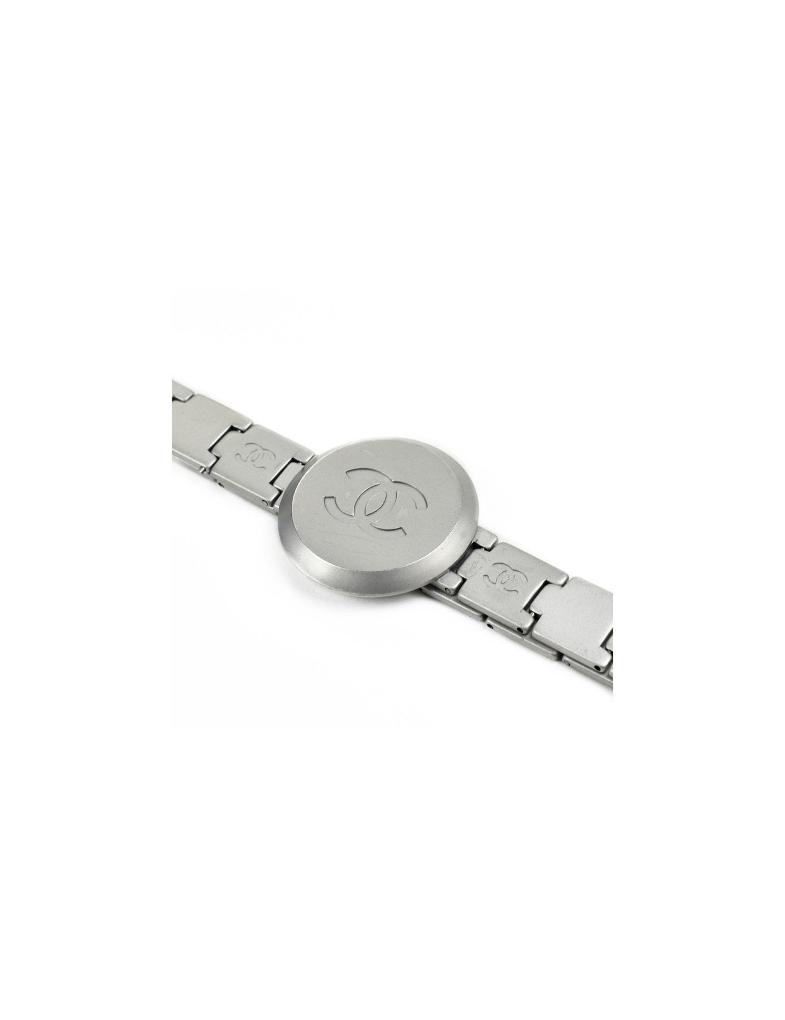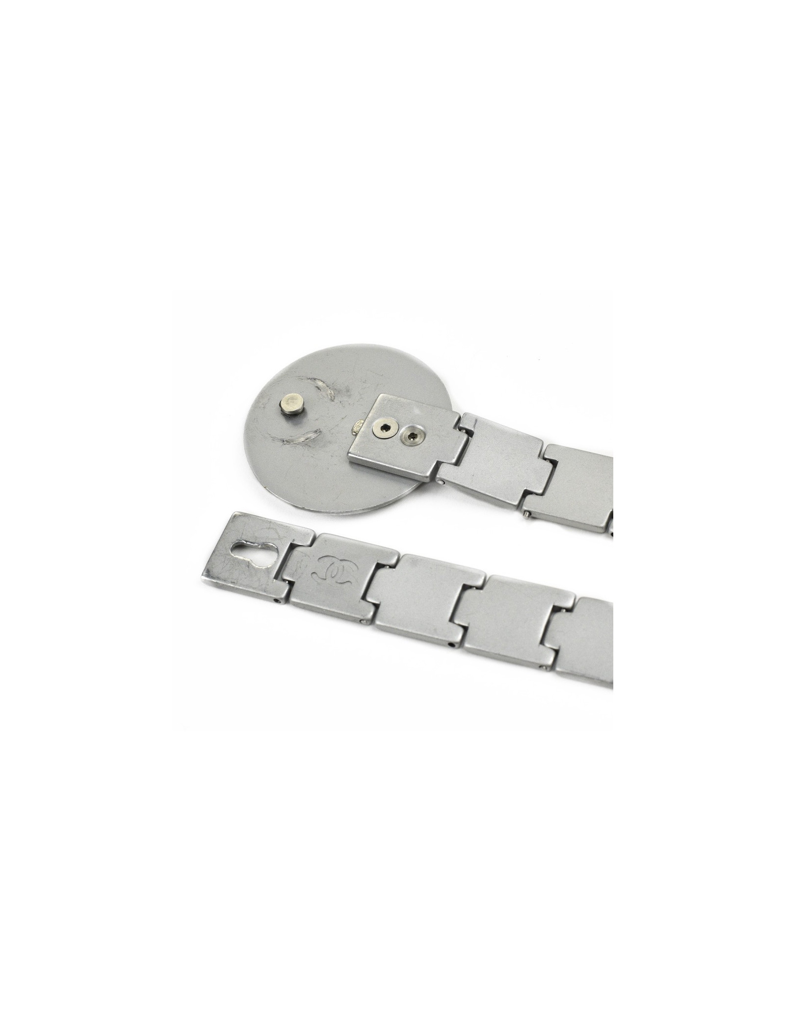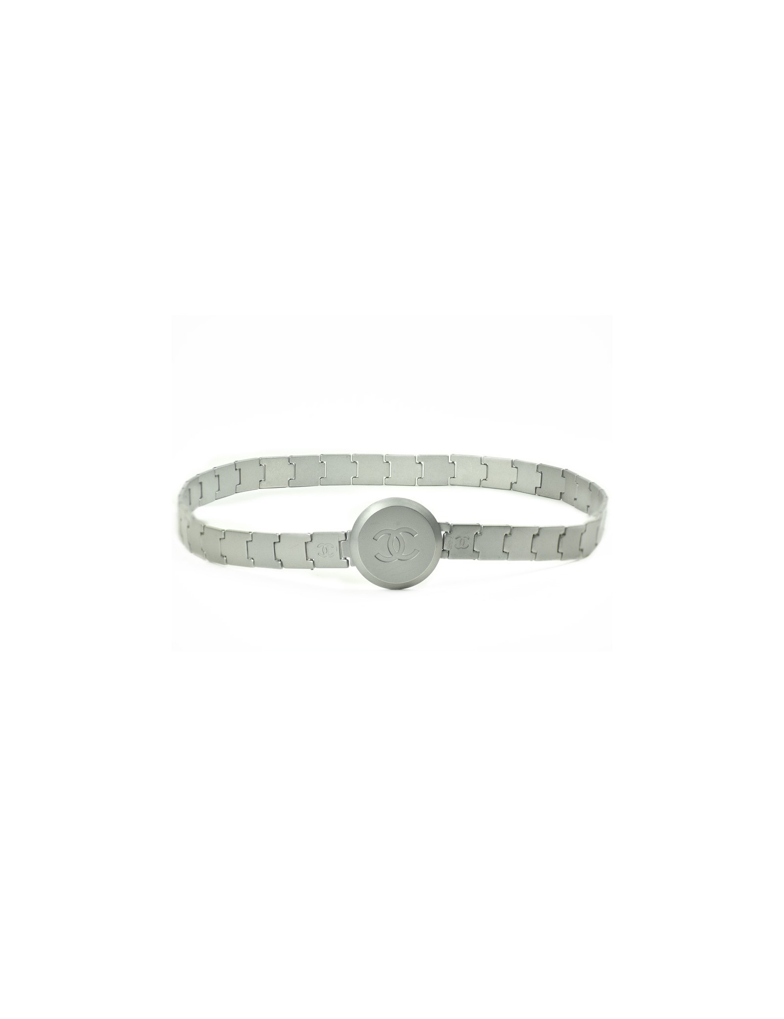 La ceinture provient de la Maison Chanel. Présence du logo CC sur toute la longueur et sur le fermoir qui représente un grand cercle. La ceinture est de couleur argent mat.