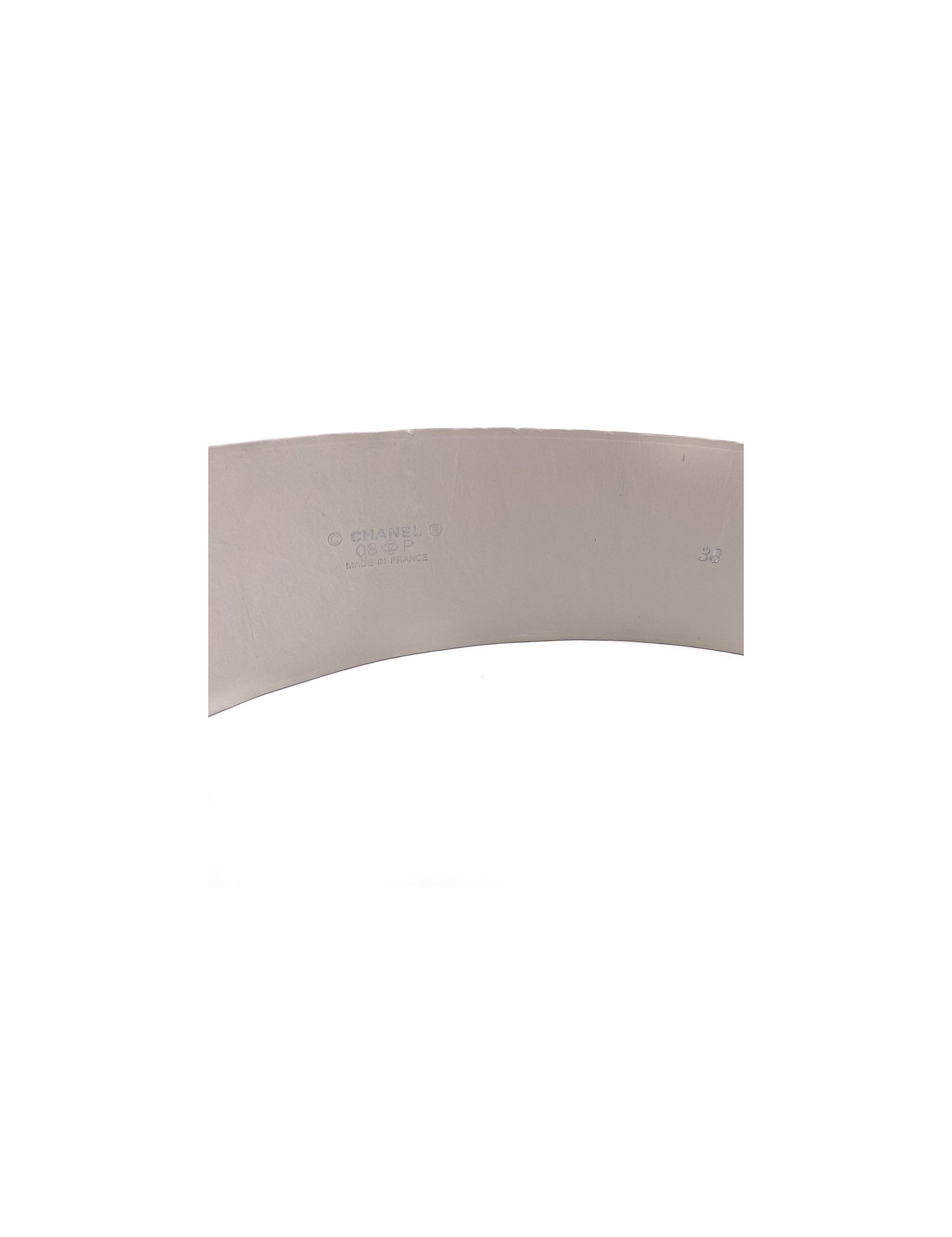 La ceinture est dans un très bon état général. Nous percevons qu'elle a déjà été utilisé au regard des plis dans le cuir. Une ombre à peine perceptible est présente (cf photo). Ceci étant, il n'y a aucun défaut de structure et l'élément central en pâte de verre est dans un état impeccable. La ceinture correspond à une taille 38. 73 centimètres de longueur au premier trou, 77 centimètres de longueur au second. Sa largeur est de 6 centimètres. Présence de la marque CHANEL à l'intérieur indiquant qu'elle est issue de la Collection Printemps/Été 2008 et qu'elle est Made In France.
