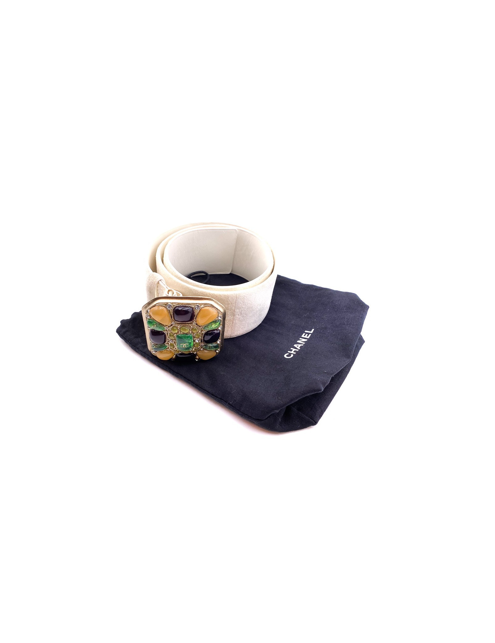 La ceinture est une pièce de la Maison CHANEL. Une large langue de cuir beige avec un carré de cabochons multicolores au niveau de la boucle, ce qui lui donne un look très couture.