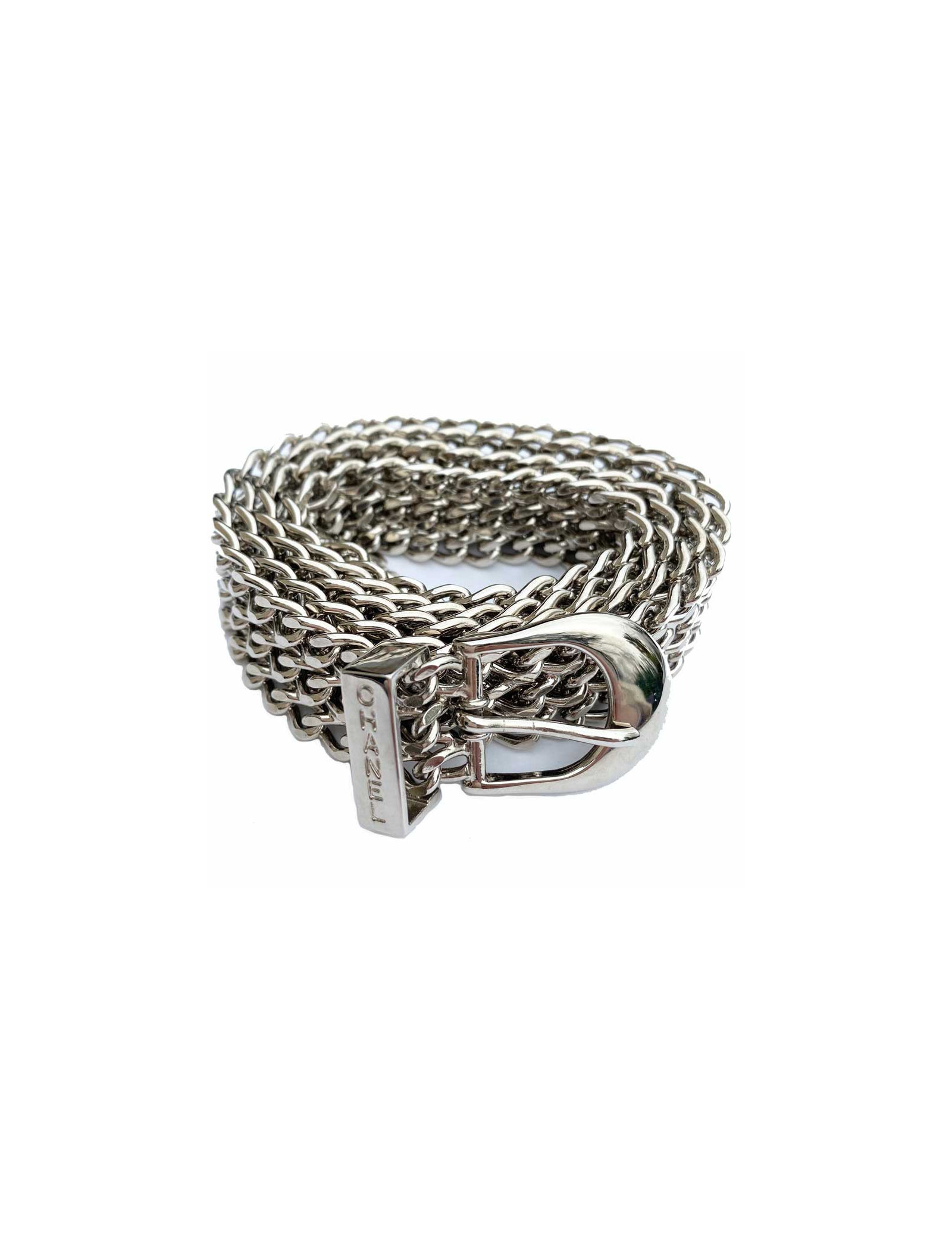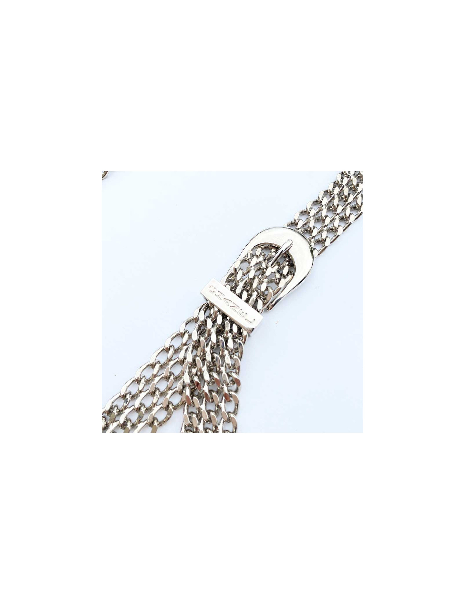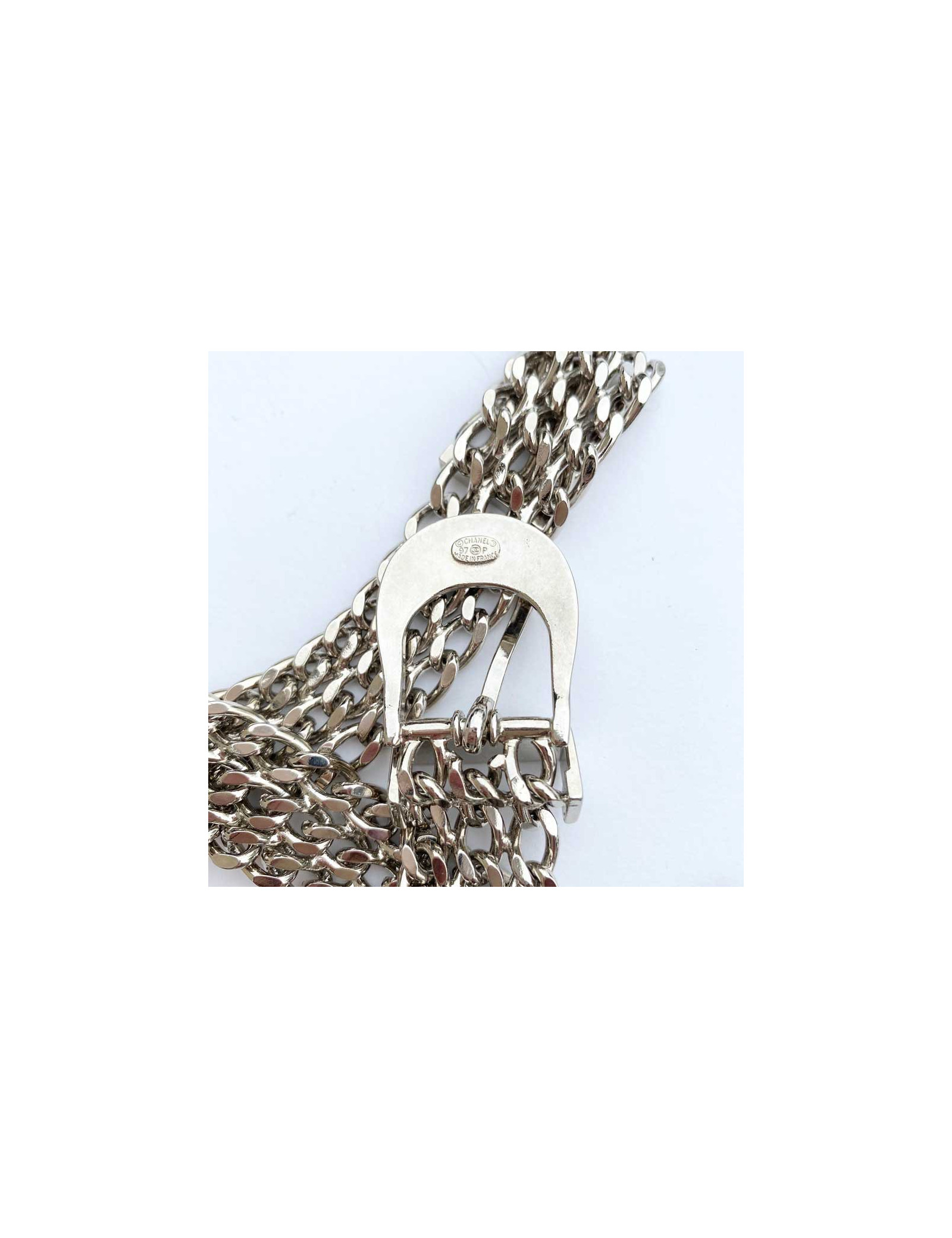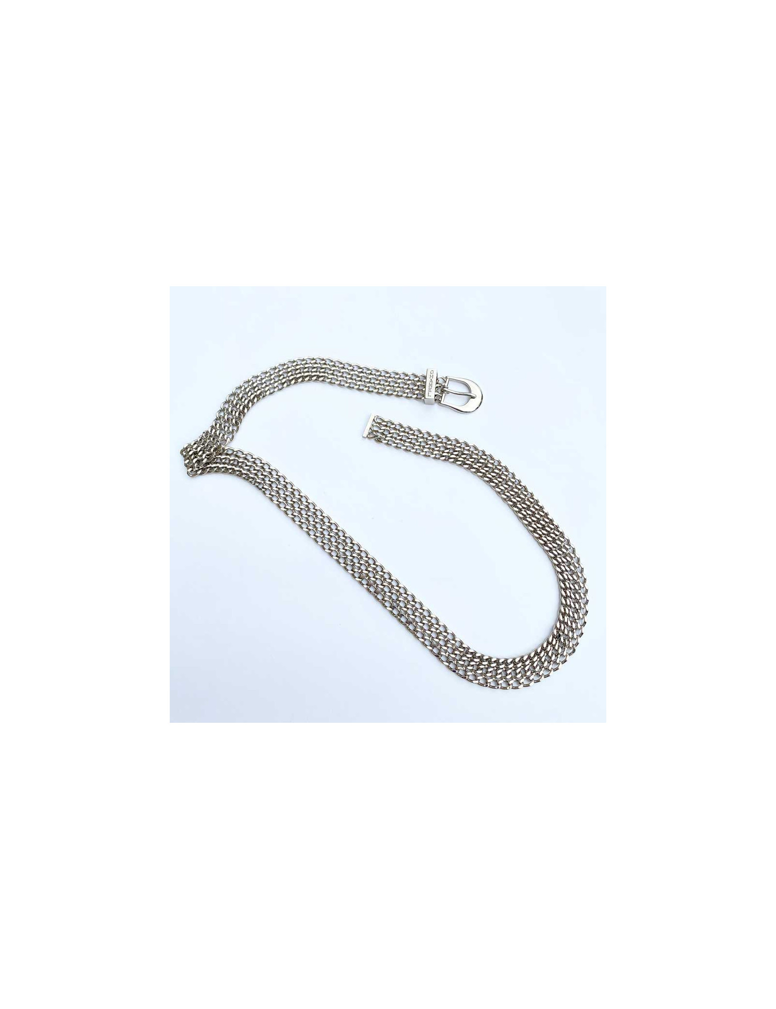 Ravissante ceinture Chanel en métal argenté issue de la collection Chanel Printemps-Été 1997. Cette ceinture convient à n’importe quelle taille en dessous de 85 cm de tour de taille, car ajustable dans la maille en métal, il n’y a pas de trous de ceinture.