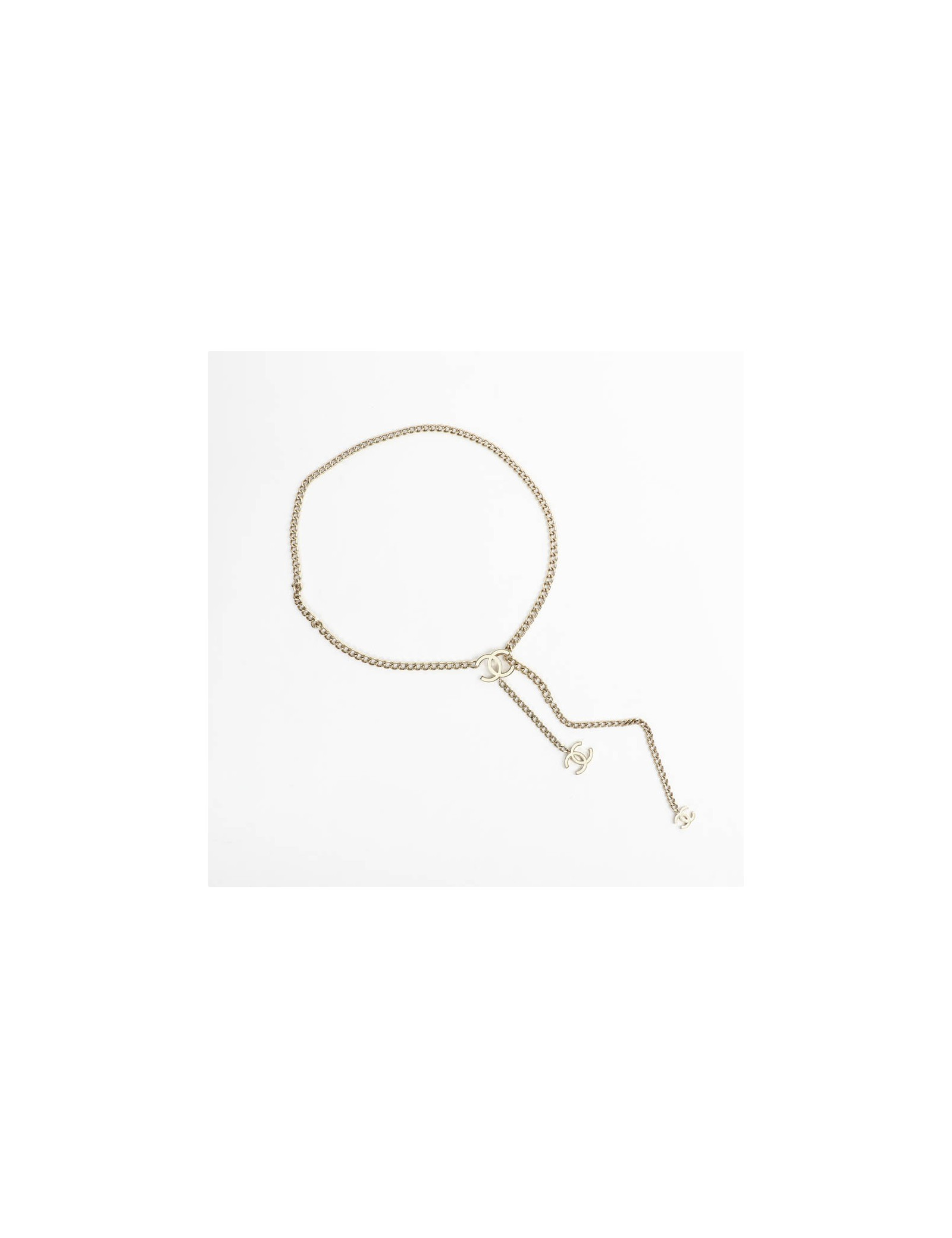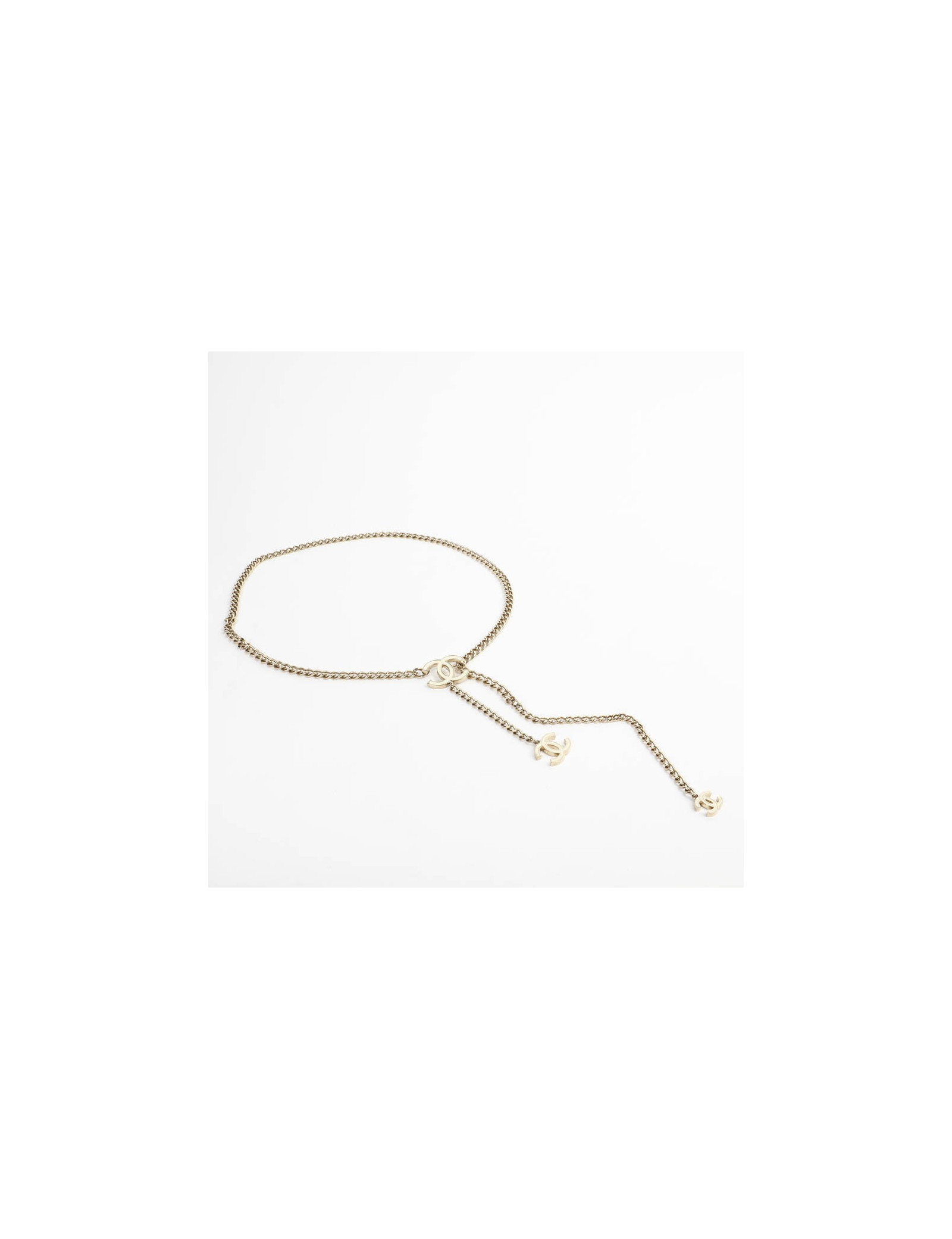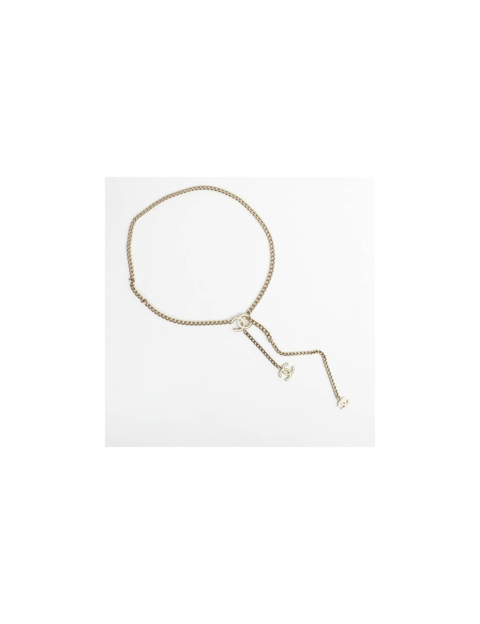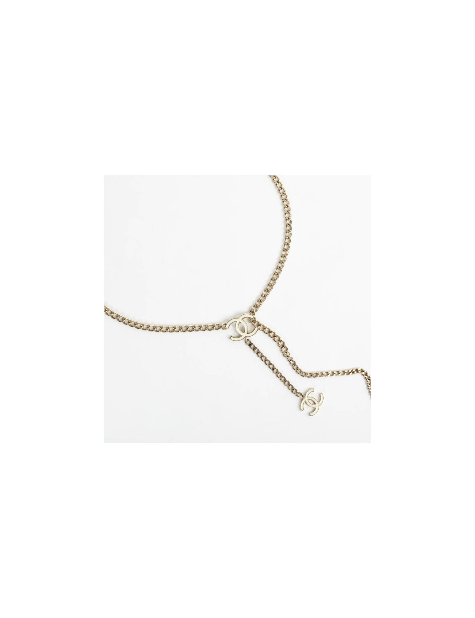Classique mais élégante, cette ceinture en chaîne dorée se porte aisément sur la taille d'une robe ou sur un pantalon. Elle est en très bon état. Le double C est émaillé blanc.