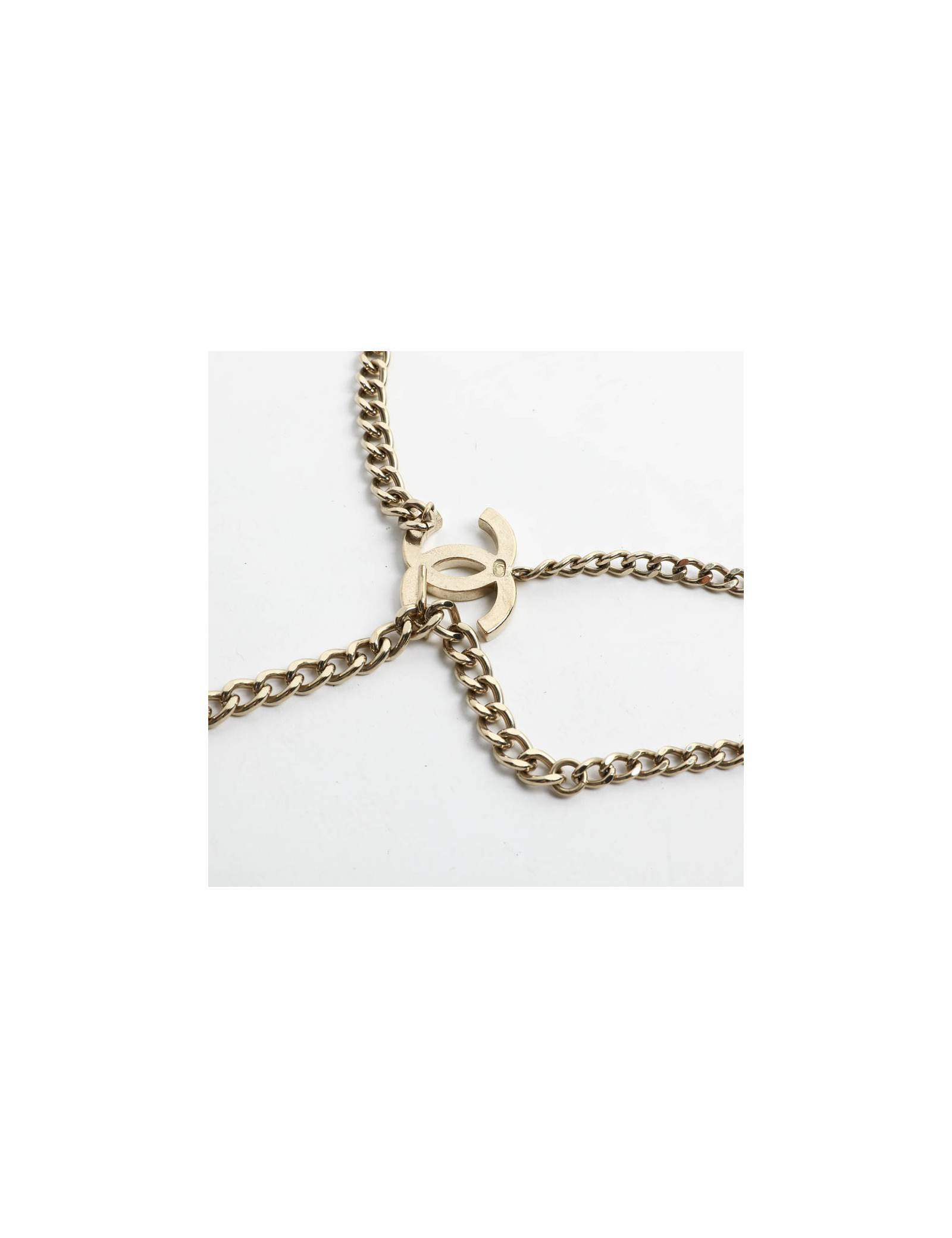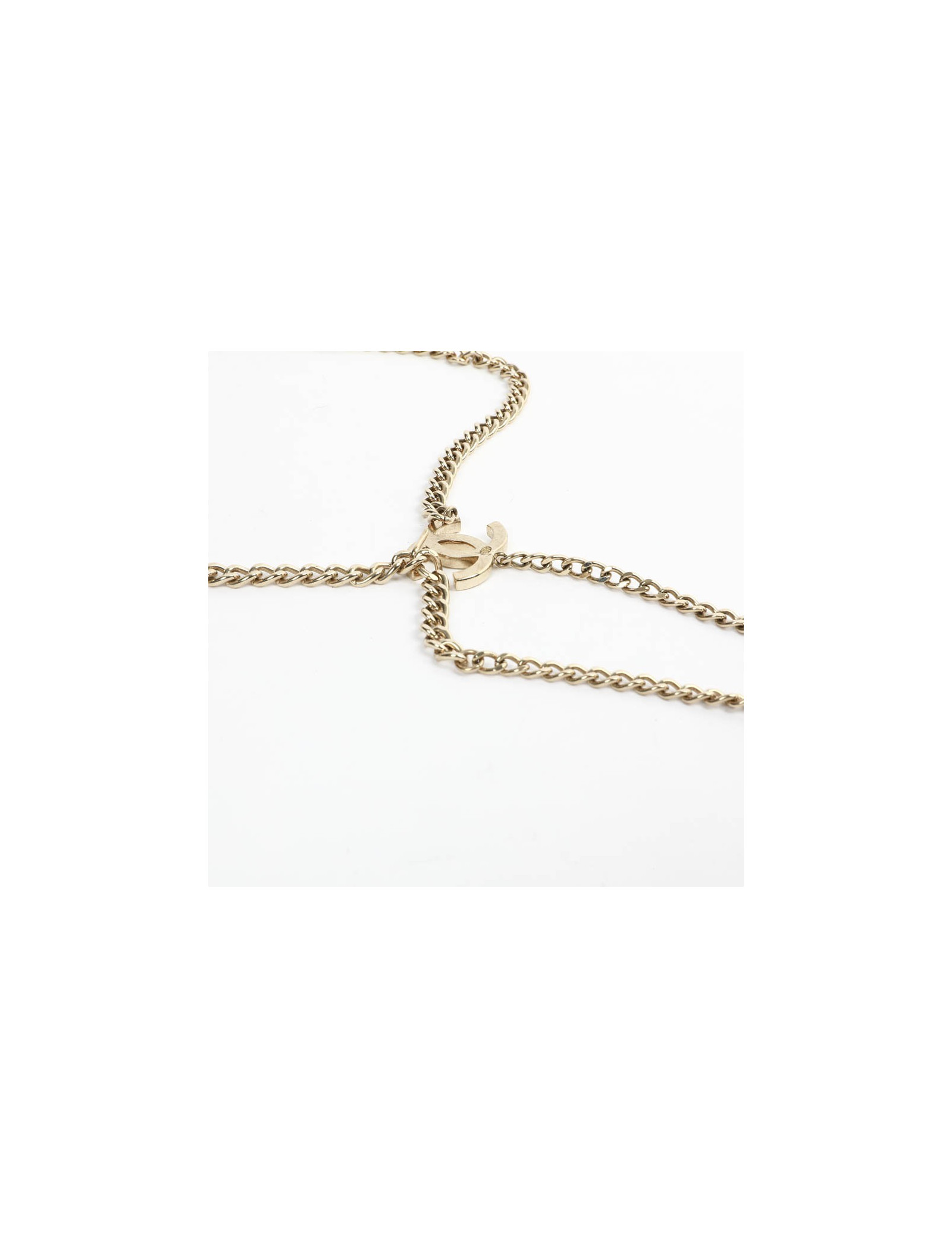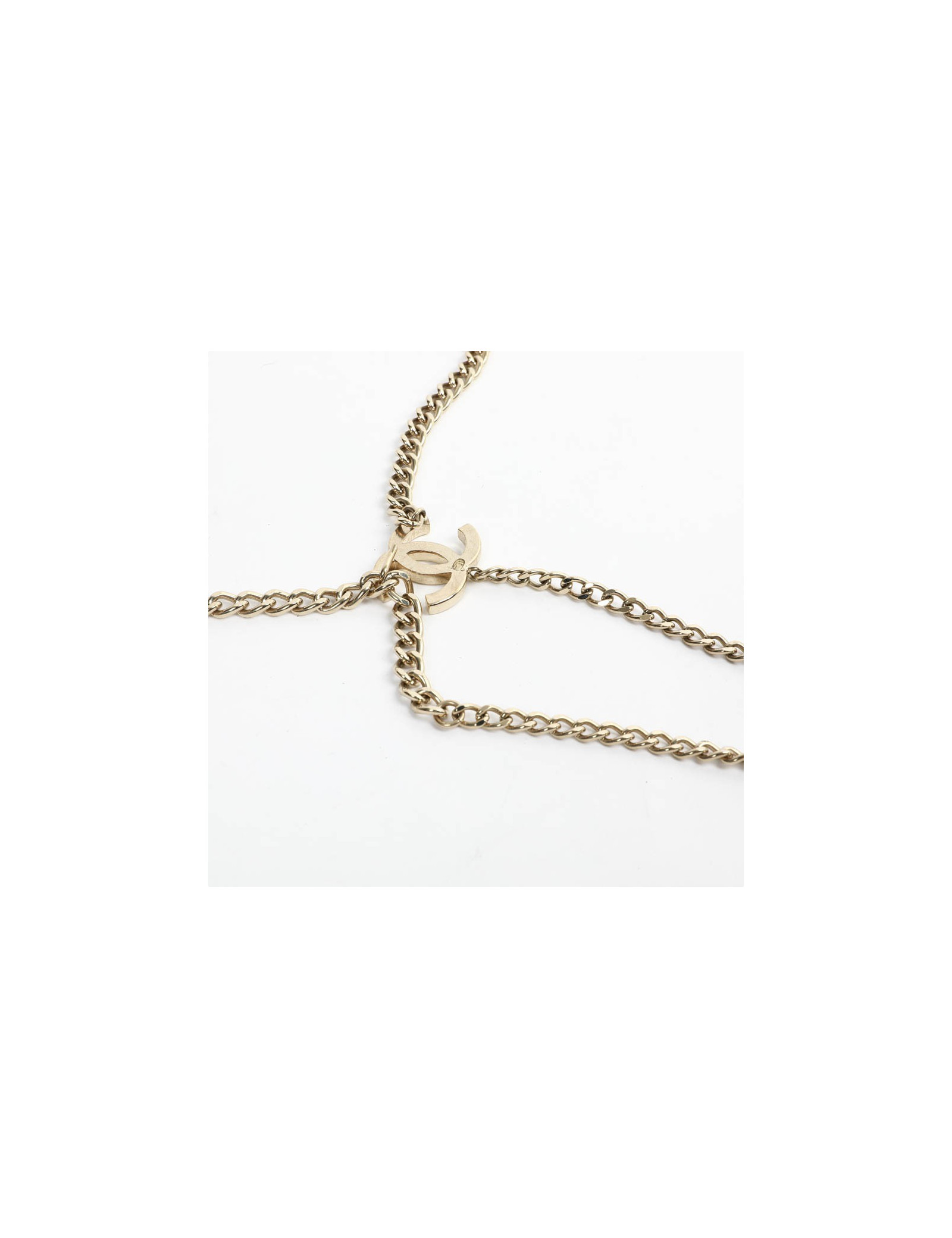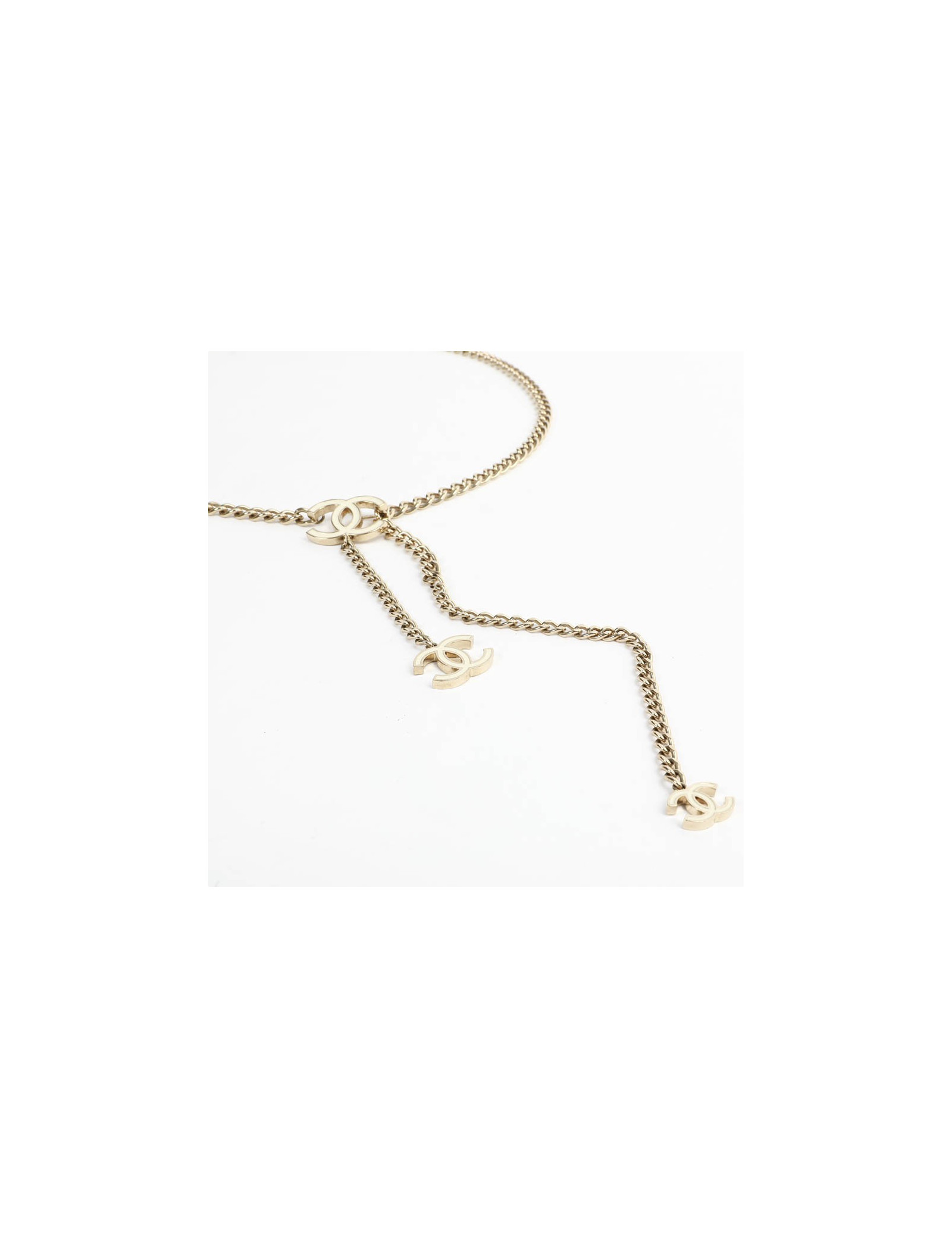 Classique mais élégante, cette ceinture en chaîne dorée se porte aisément sur la taille d'une robe ou sur un pantalon. Elle est en très bon état. Le double C est émaillé blanc.