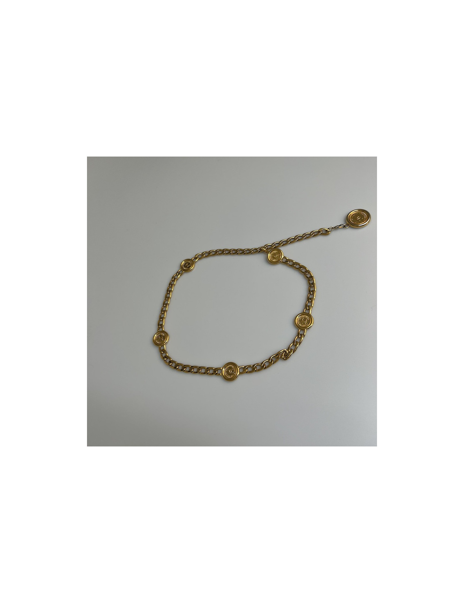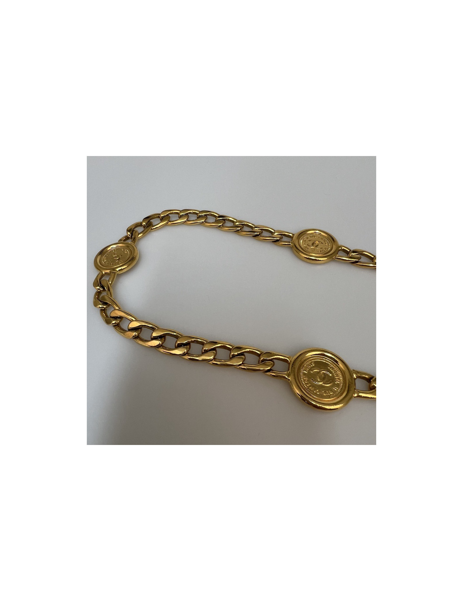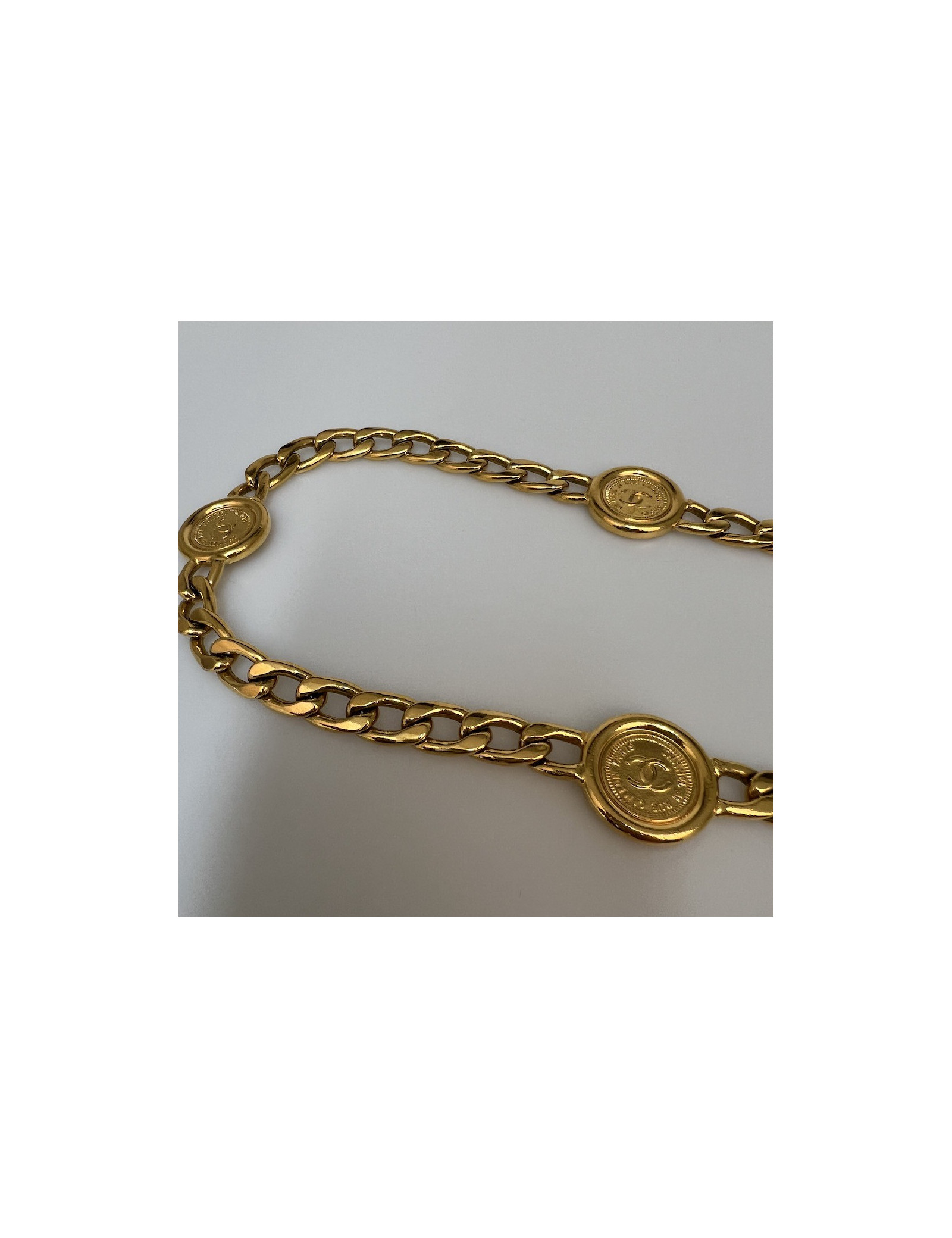 Derniers articles en stock CEINTURE Ceinture Chanel triple rangs Vintage CHANEL 33351 1 900,00 € Belle silhouette avec cette ceinture vintage Chanel à triple rang, un exemple parfait de l’élégance parisienne intemporelle. Conçue en métal doré brillant vintage, elle se compose de trois chaînes gourmette finement entrelacées, réunies par deux médaillons ornés du célèbre logo double C entrelacé.Polyvalente, elle peut se porter à la taille ou sur les... Ajouter au panier