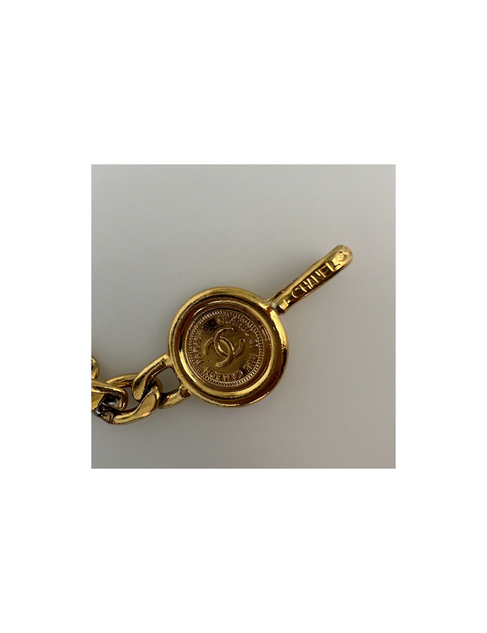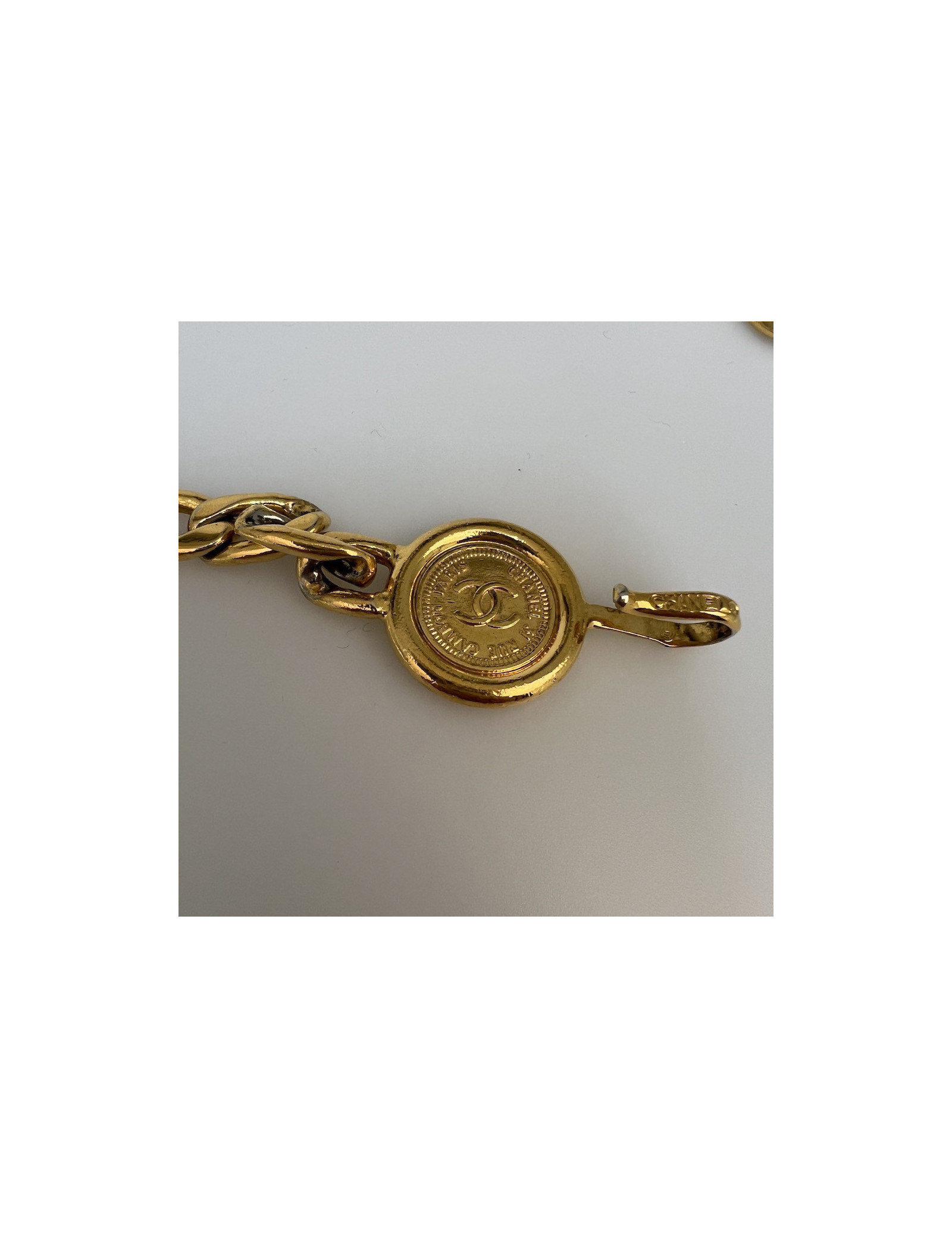 Derniers articles en stock CEINTURE Ceinture CHANEL Couture tête de lion CHANEL 32689 2 800,00 € Ceinture CHANEL Couture tête de lion Vintage Condition : très bon étatPays de fabrication : FranceGenre : femmeMatière : métal, cuir Couleur : doré, bordeauxDimensions : longueur totale chaîne 68 cm, hauteur : 2 cm, longueur pendentif : 10 cm, diamètre : 3,5 cmStamp : non Année : vintage années ‘80Bijouterie : doréDétails : collection Couture Ajouter au panier