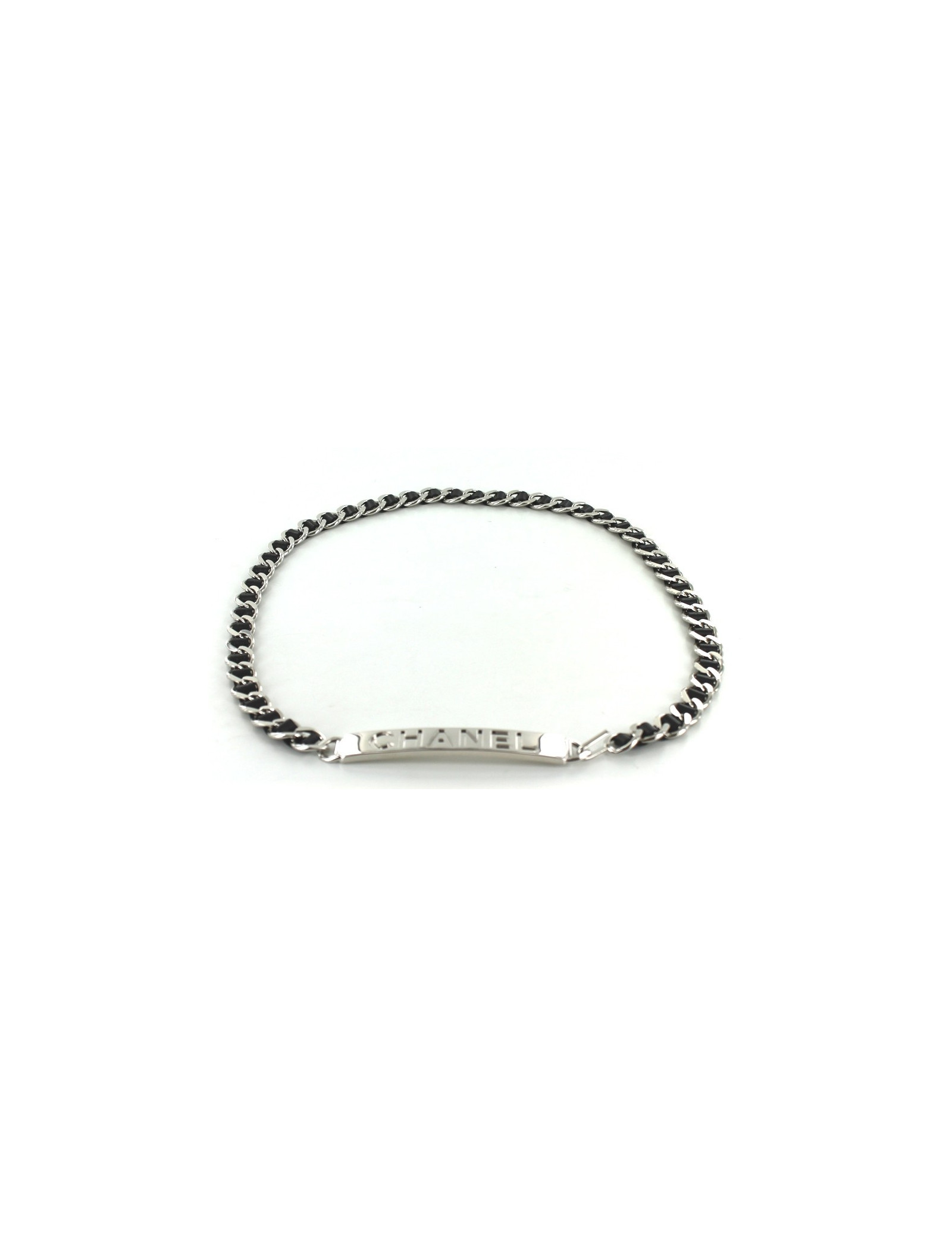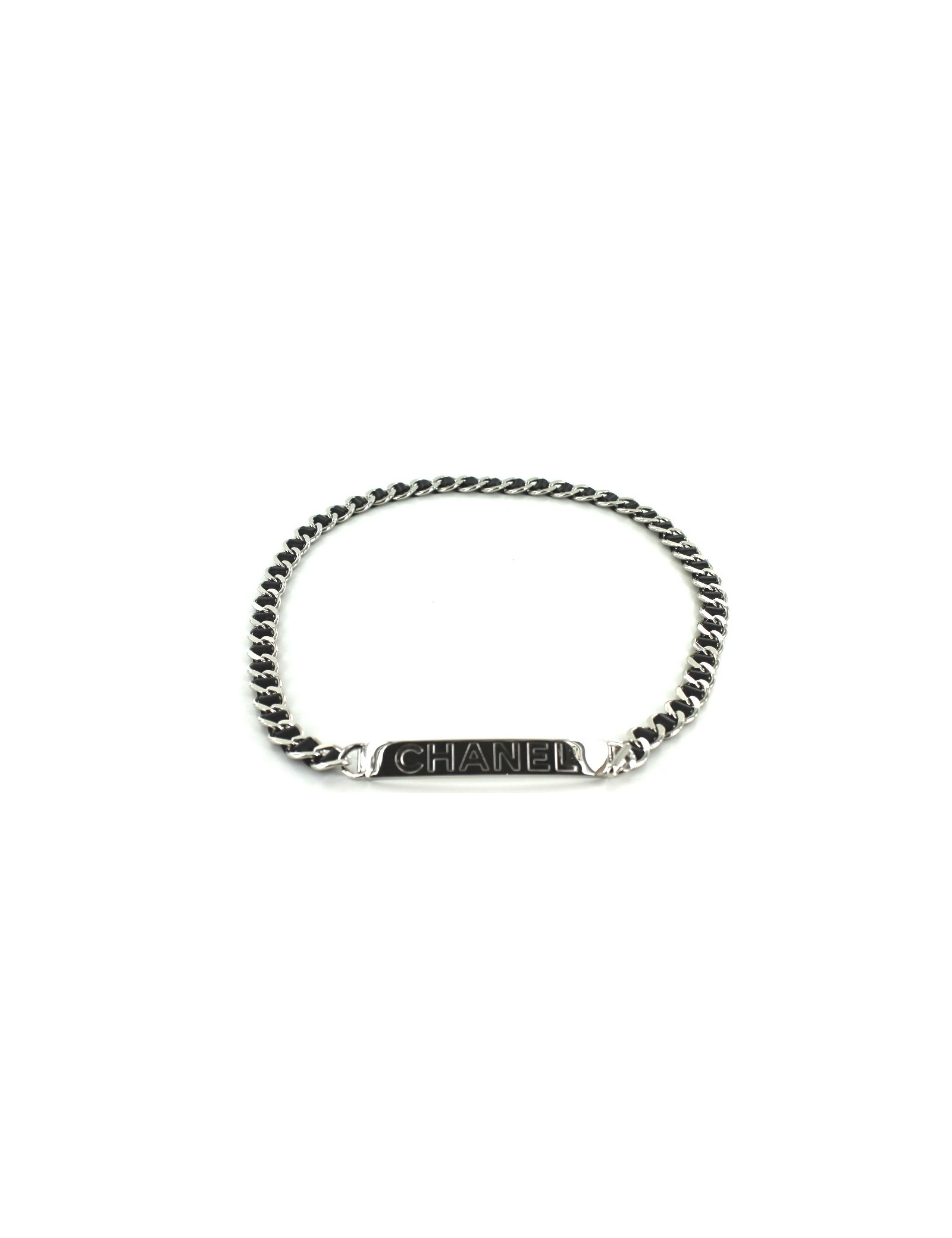Ceinture CHANEL en chaîné argent entrelacée de cuir noir et plaque en métal argenté noir siglée CHANEL. Collection Printemps-Eté 1998. Longueur ajustable. Fermeture par crochet. Made in France.