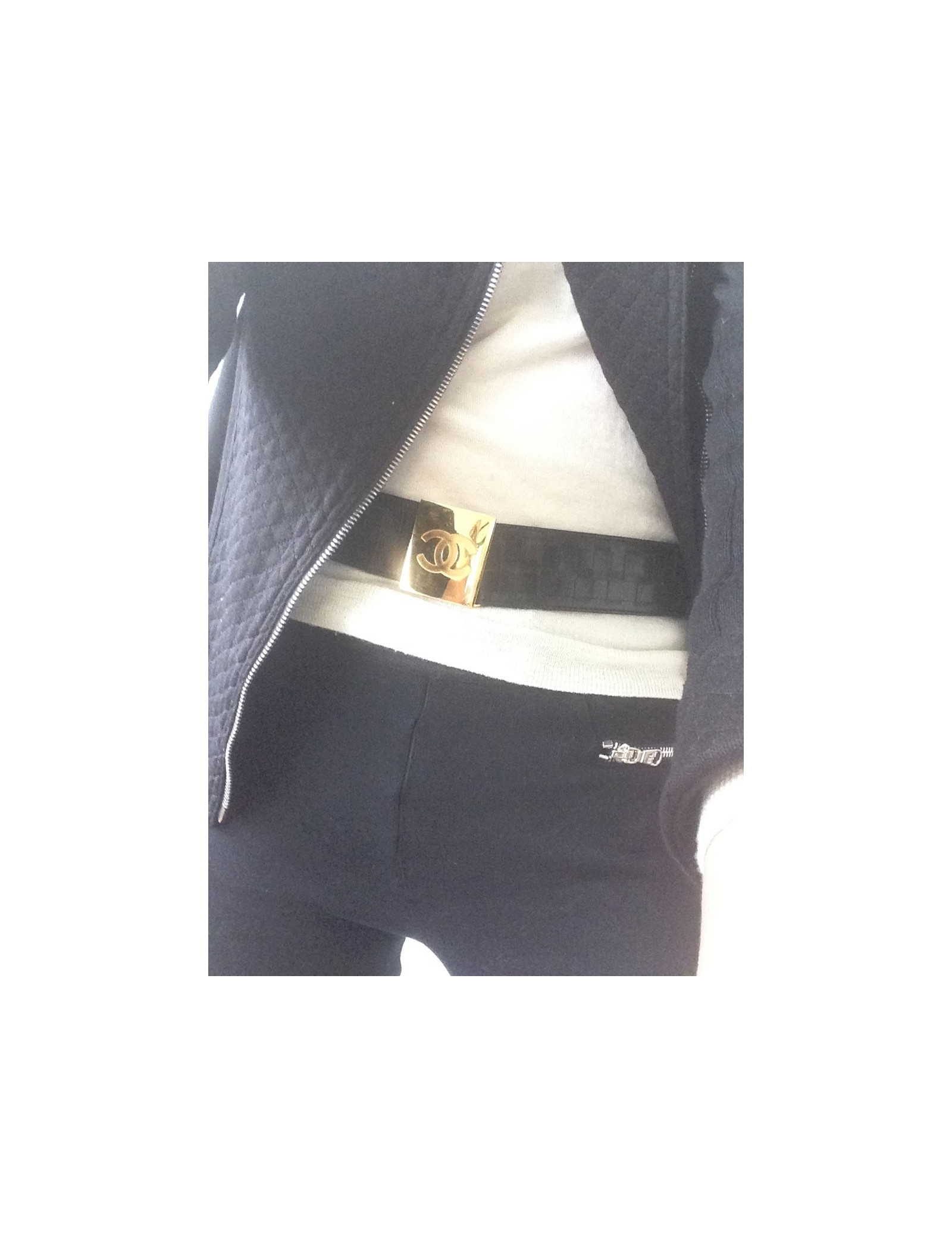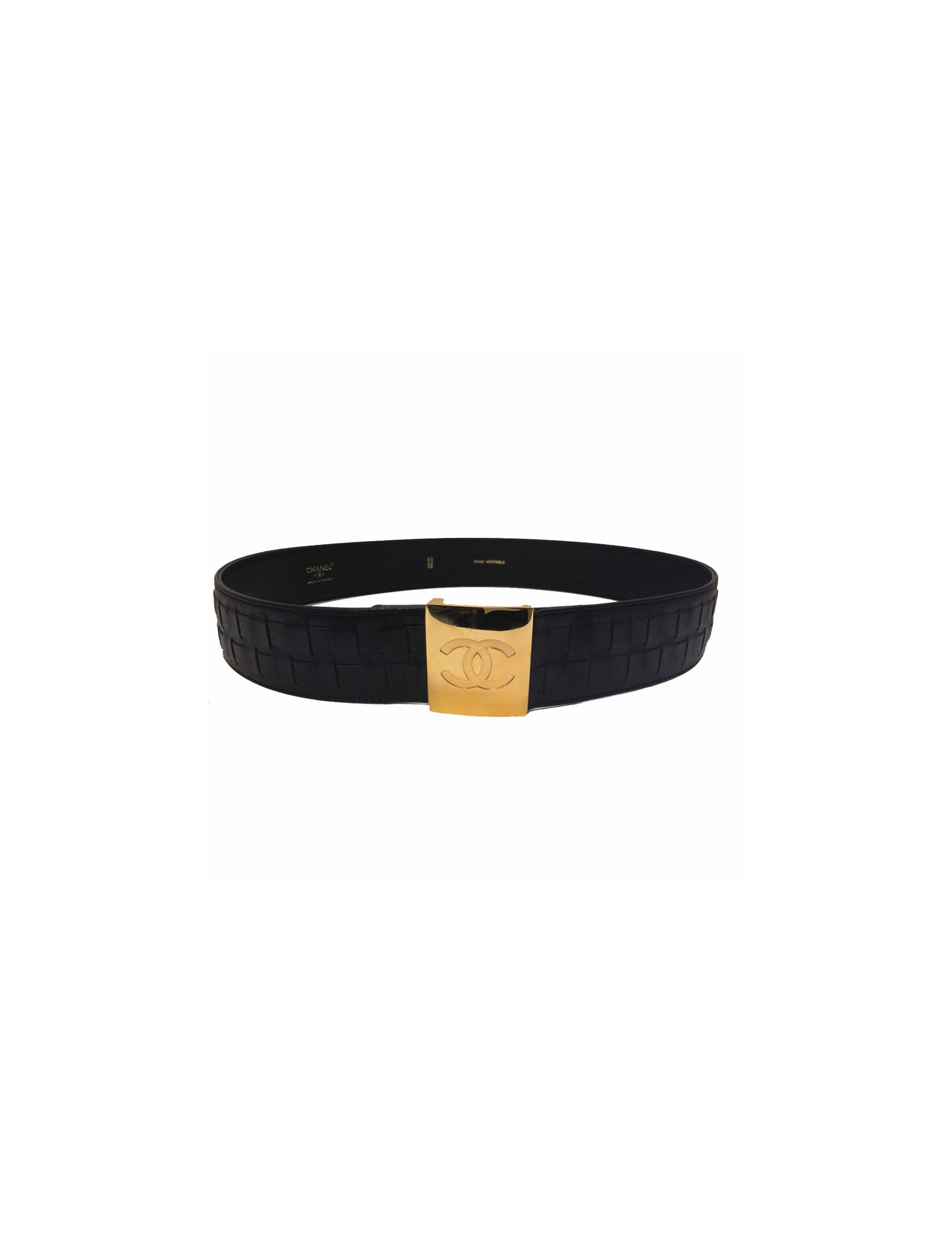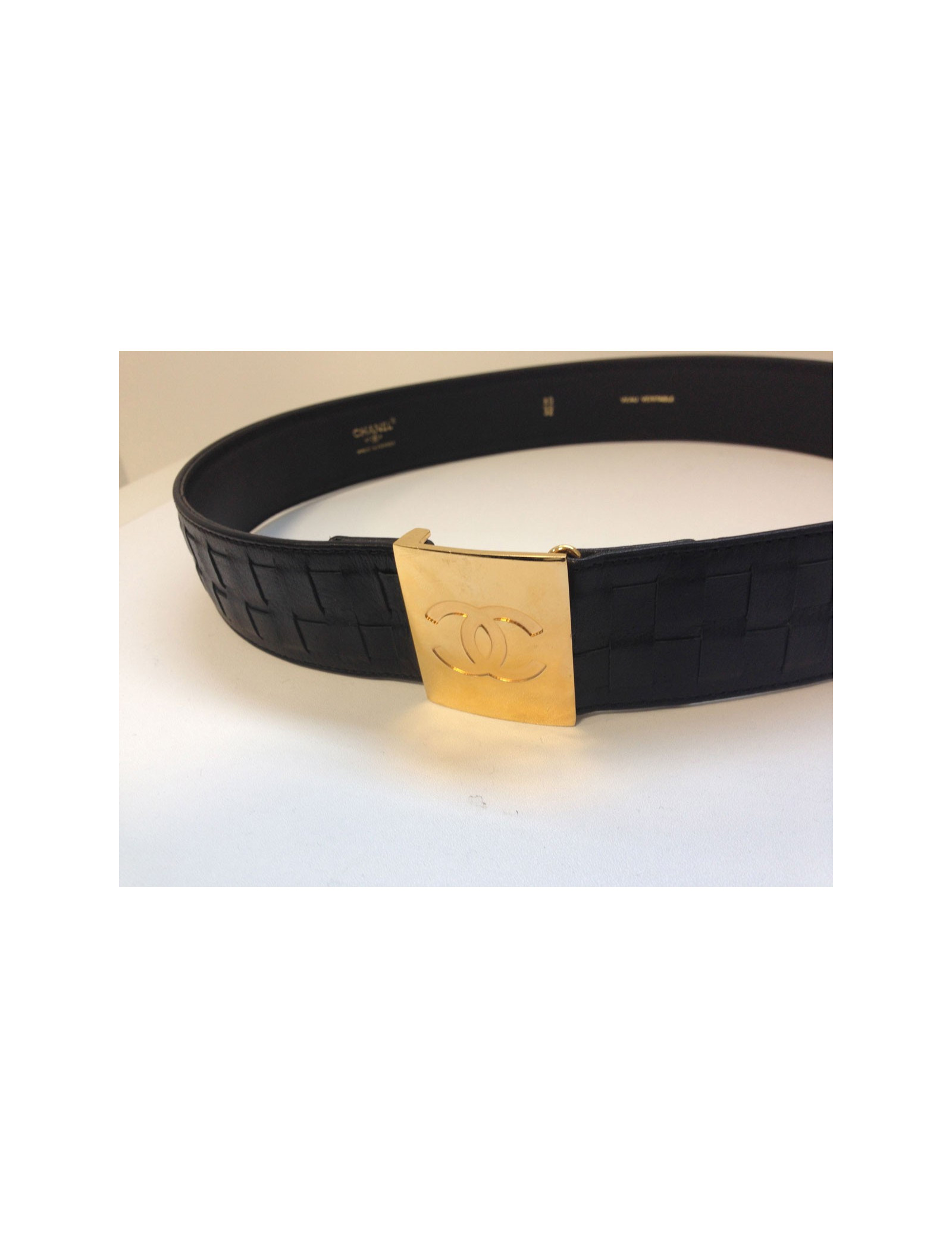 Ceinture en cuir de veau noir Chanel, cuir entrelacé noir et boucle CC dorée (légèrement rayée). Le cuir est dans un état parfait.