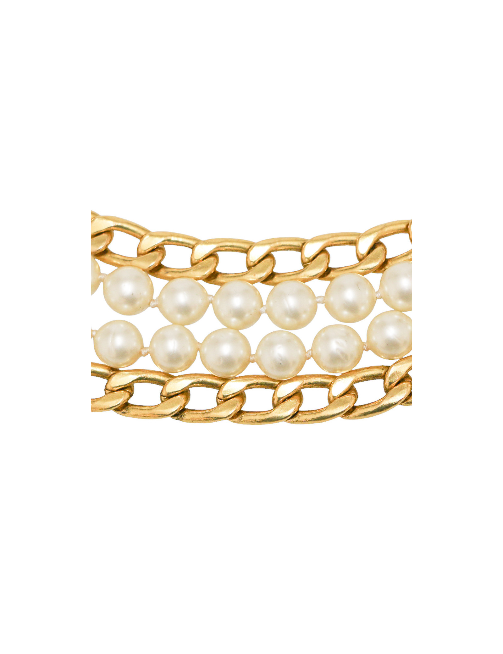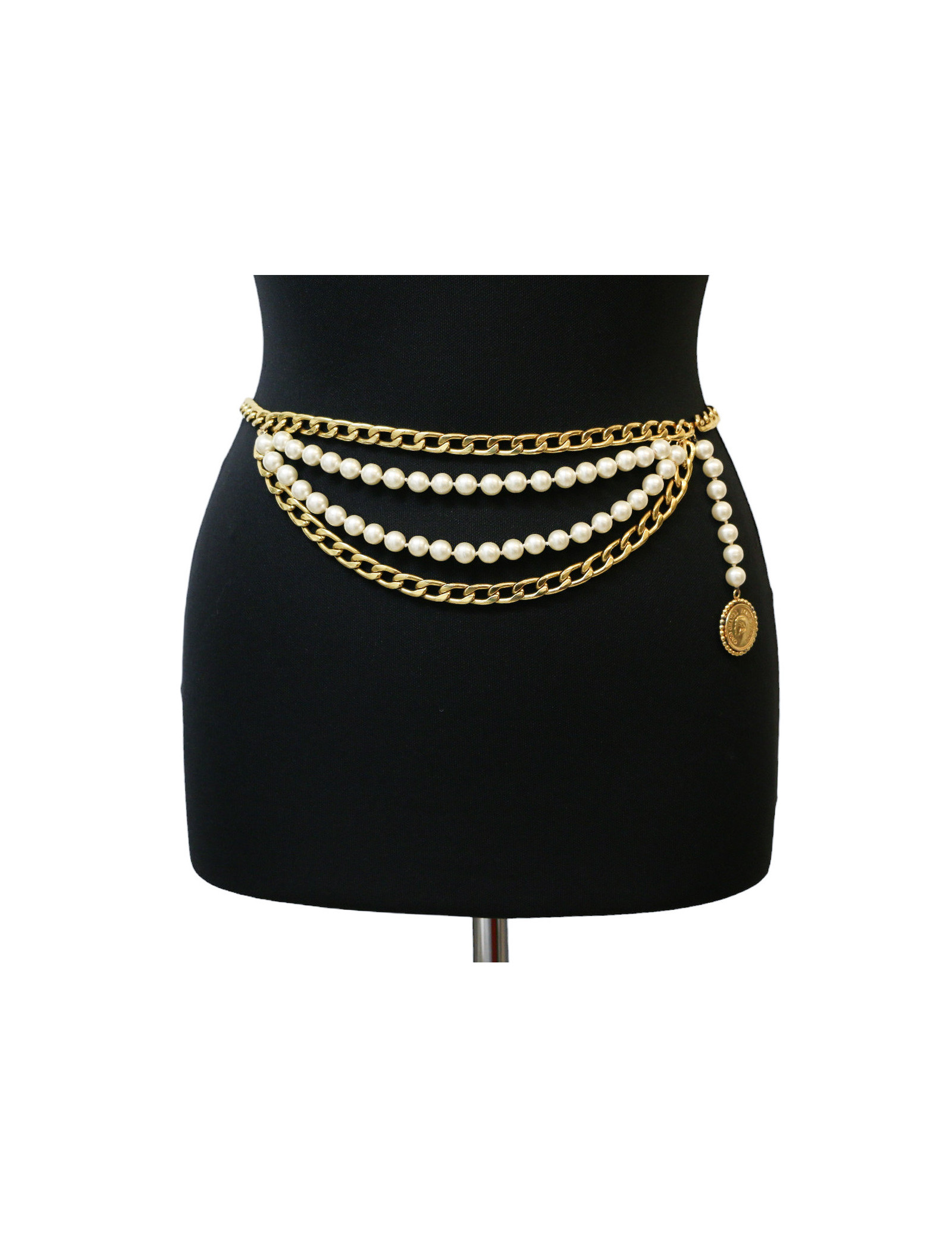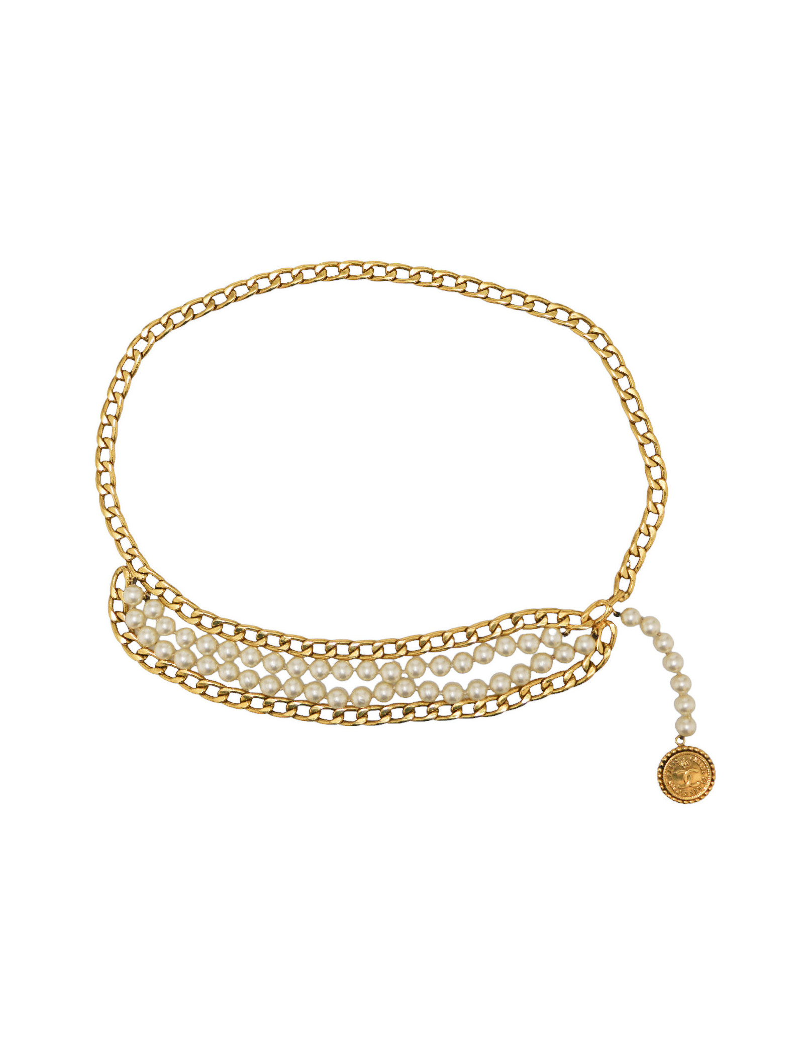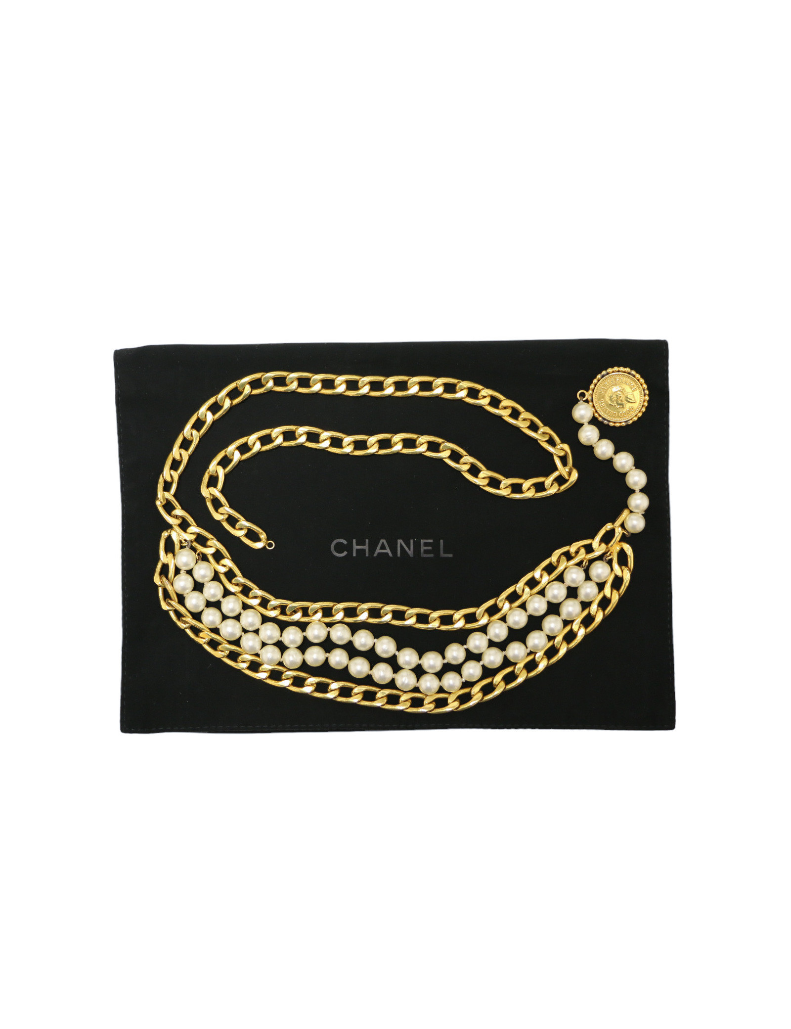 Détails : La ceinture est ajustable car le crochet peut s'attacher dans n'importe quel anneau de la chaîne. Quatre rangs, un médaillon représentant la tête de Coco Chanel d'un côté et un CC de l'autre.