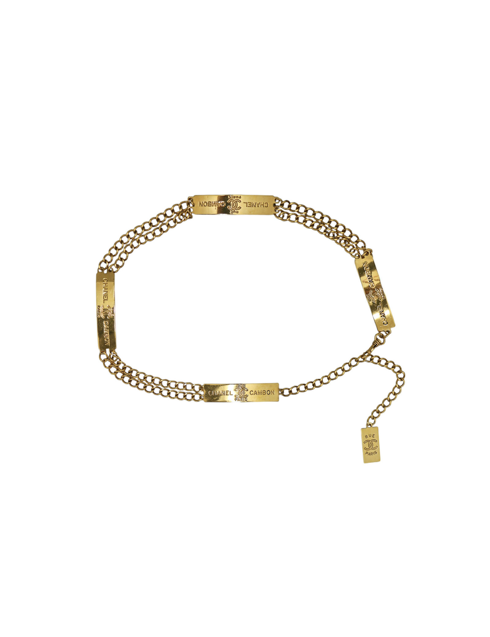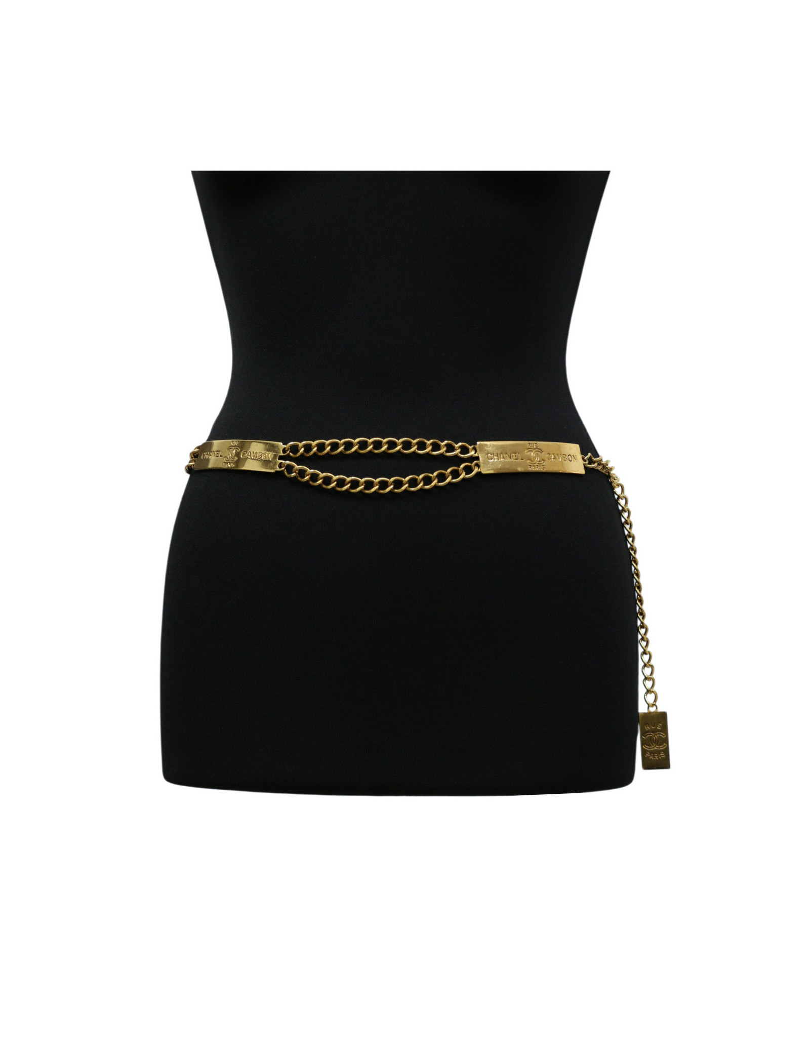 Ceinture chaîne Chanel vintage en plaqué or, au style intemporel de la Maison Chanel. Elle reflète l’héritage de la maison parisienne avec un design élégant à double chaîne, rehaussé de plaques rectangulaires travaillées.Chaque plaque est gravée de "CHANEL RUE CAMBON PARIS" ainsi que du célèbre logo CC entrelacé, en référence à l’adresse iconique de la maison. Un pendentif rectangulaire signé "RUE CC PARIS" vient compléter l’ensemble et apporte une touche distinctive. Sa finition plaquée or lui donne une belle présence tout en restant facile à porter. Elle peut se porter à la taille pour structurer une silhouette, ou sur les hanches pour un style plus décontracté. Elle s’associe aussi bien avec une robe qu’avec un blazer pour apporter une note vintage chic. Cette ceinture est en très bon état, elle présente des micro-rayures sur la bijouterie.