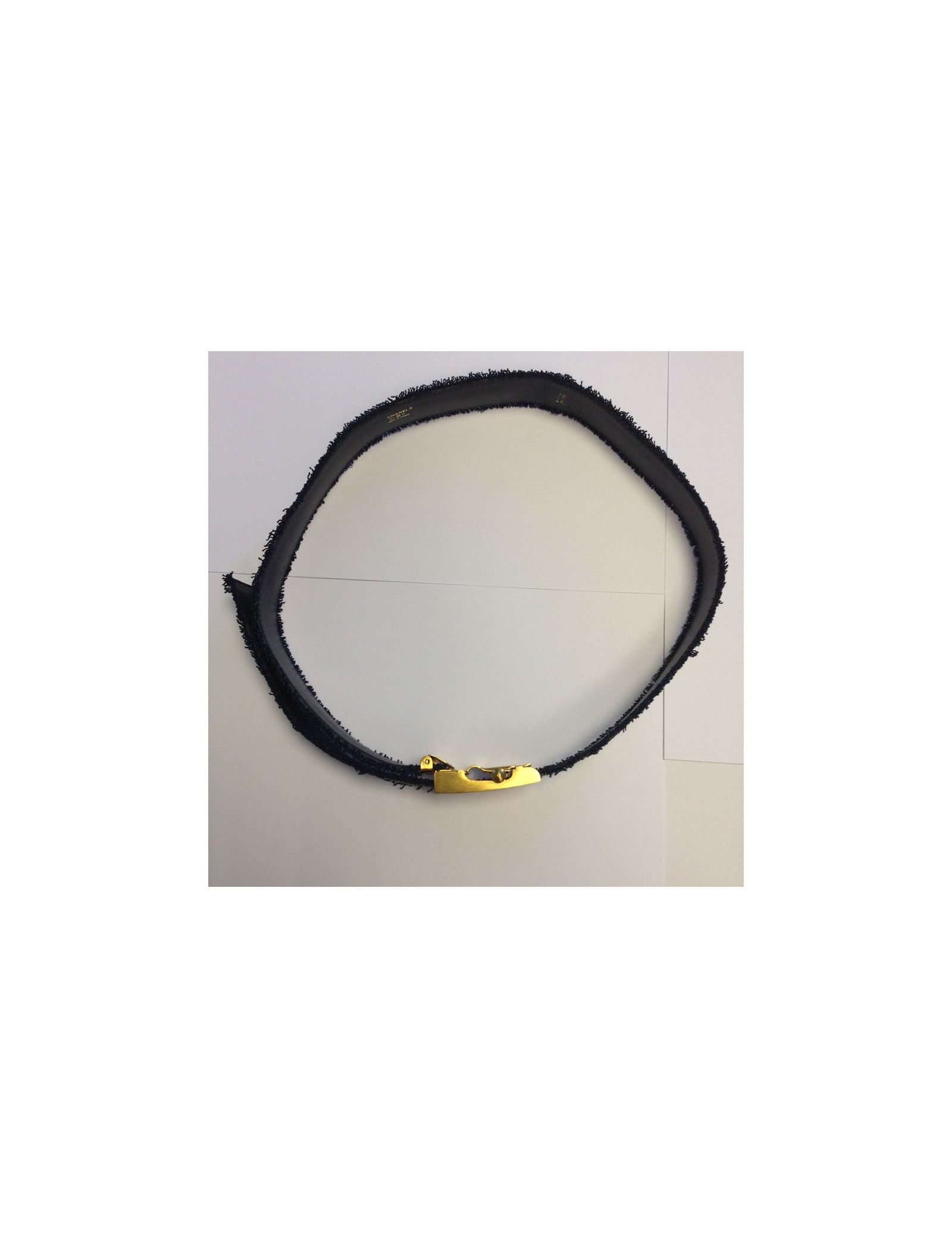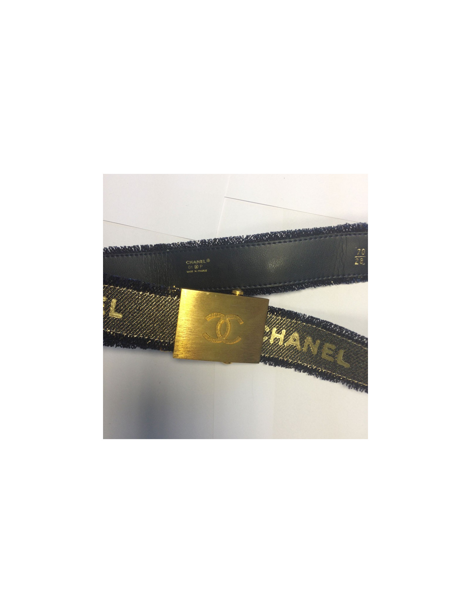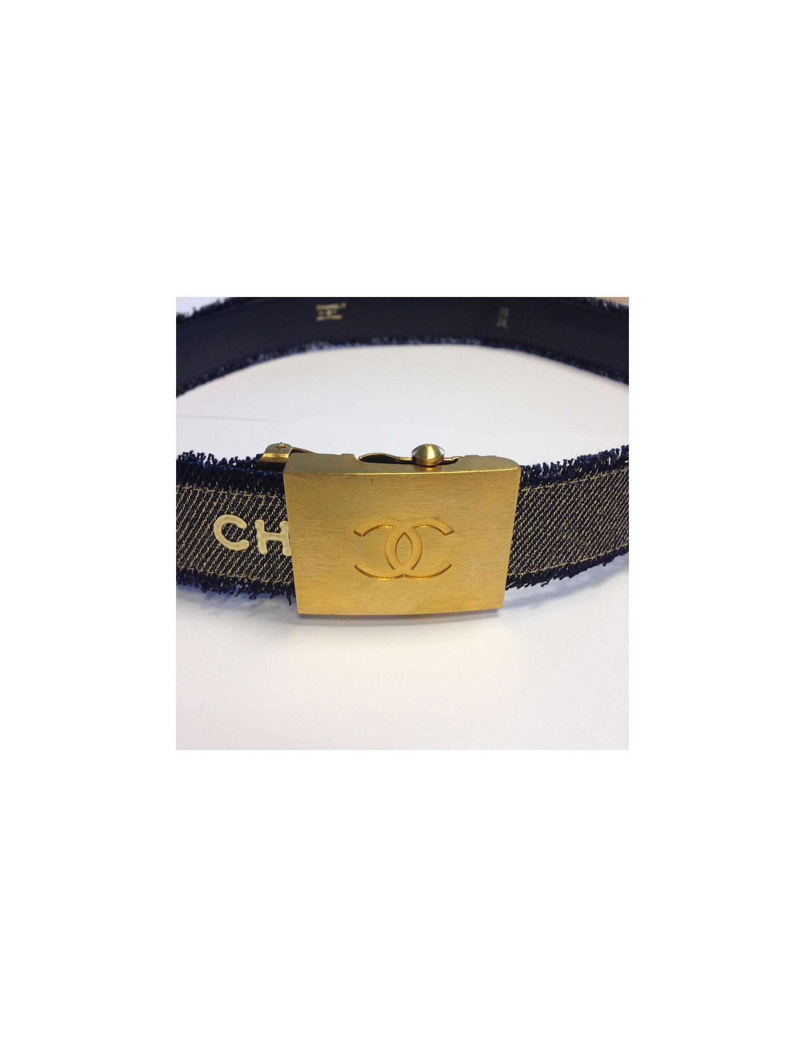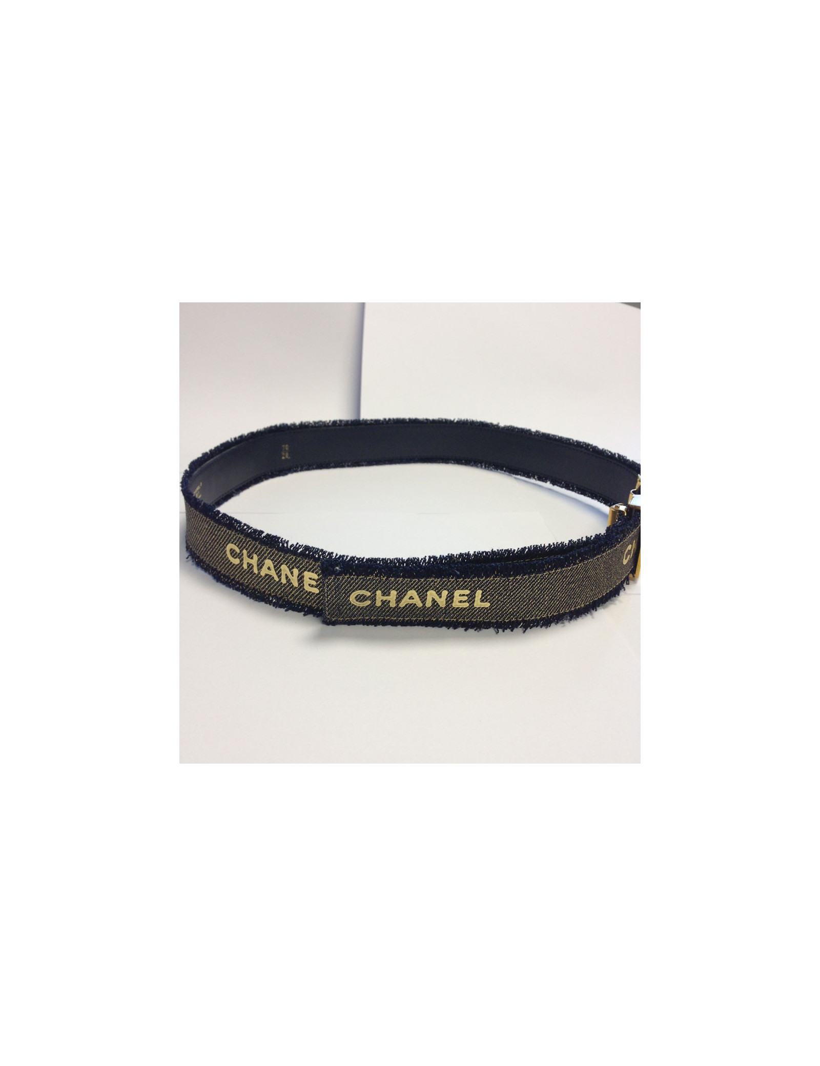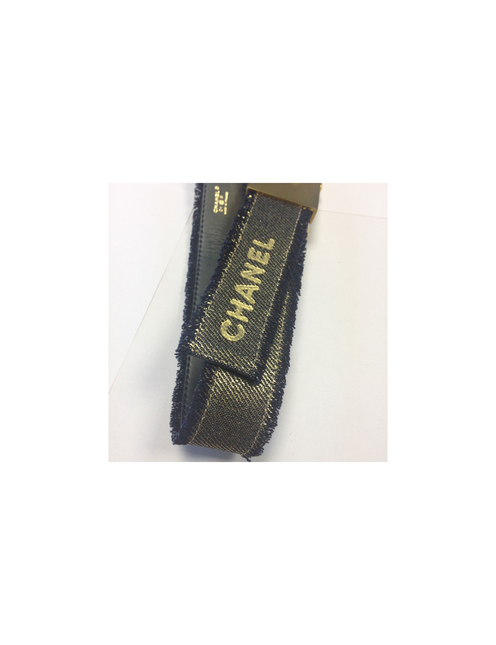 Très belle ceinture Chanel bleu jean lamé or, avec inscriptions CHANEL tout autour. Grand CC sur le fermoir