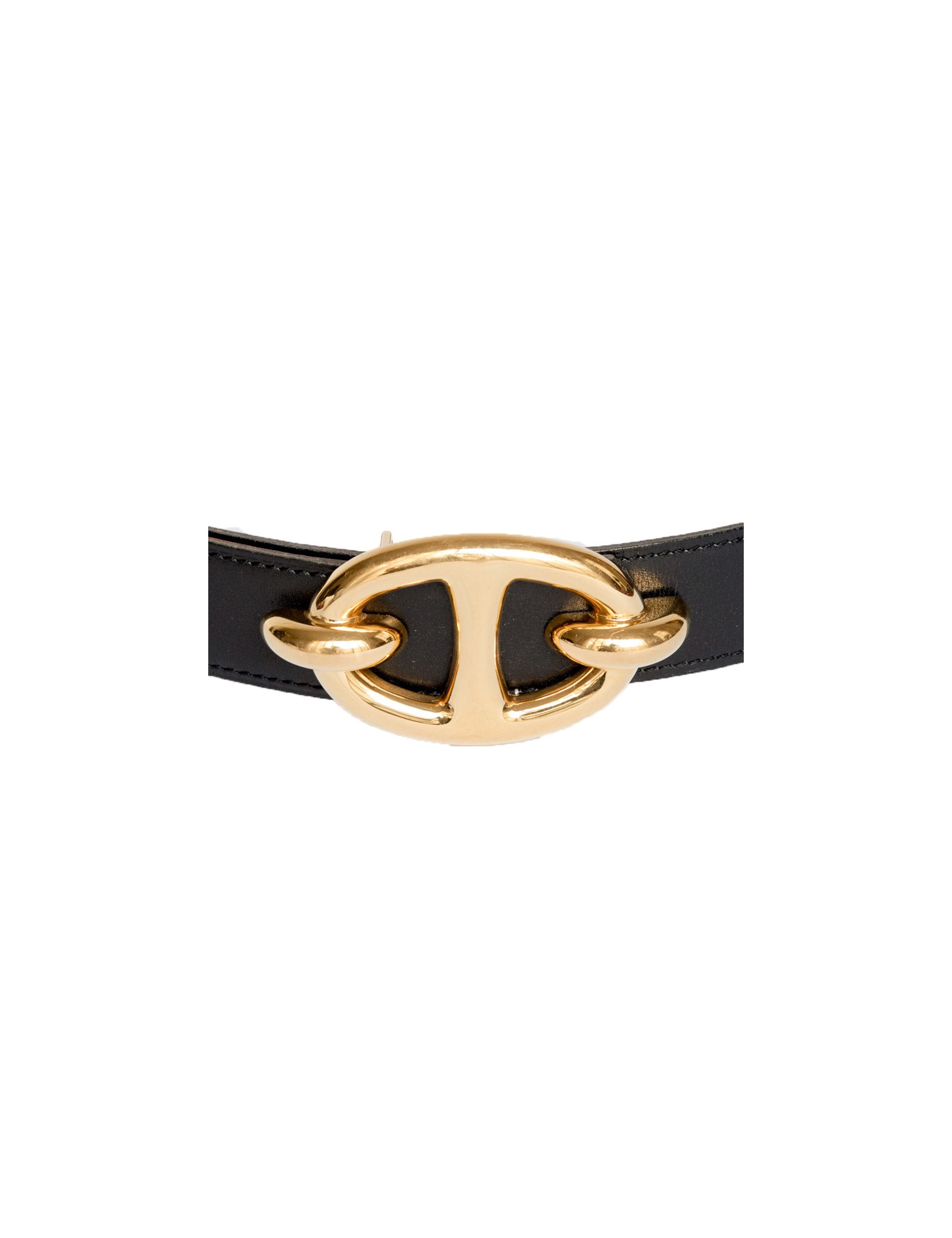 Ceinture Hermès, chaîne d'ancre T 78, réversible en cuir box noir et cuir courchevel gold. La bijouterie est en métal doré à l'or fin (légères micro rayures).