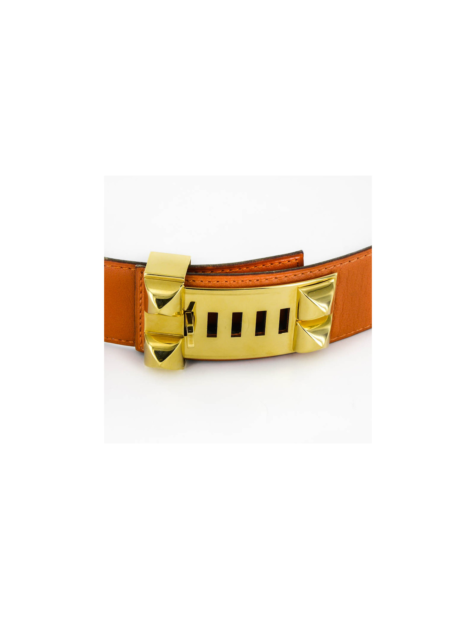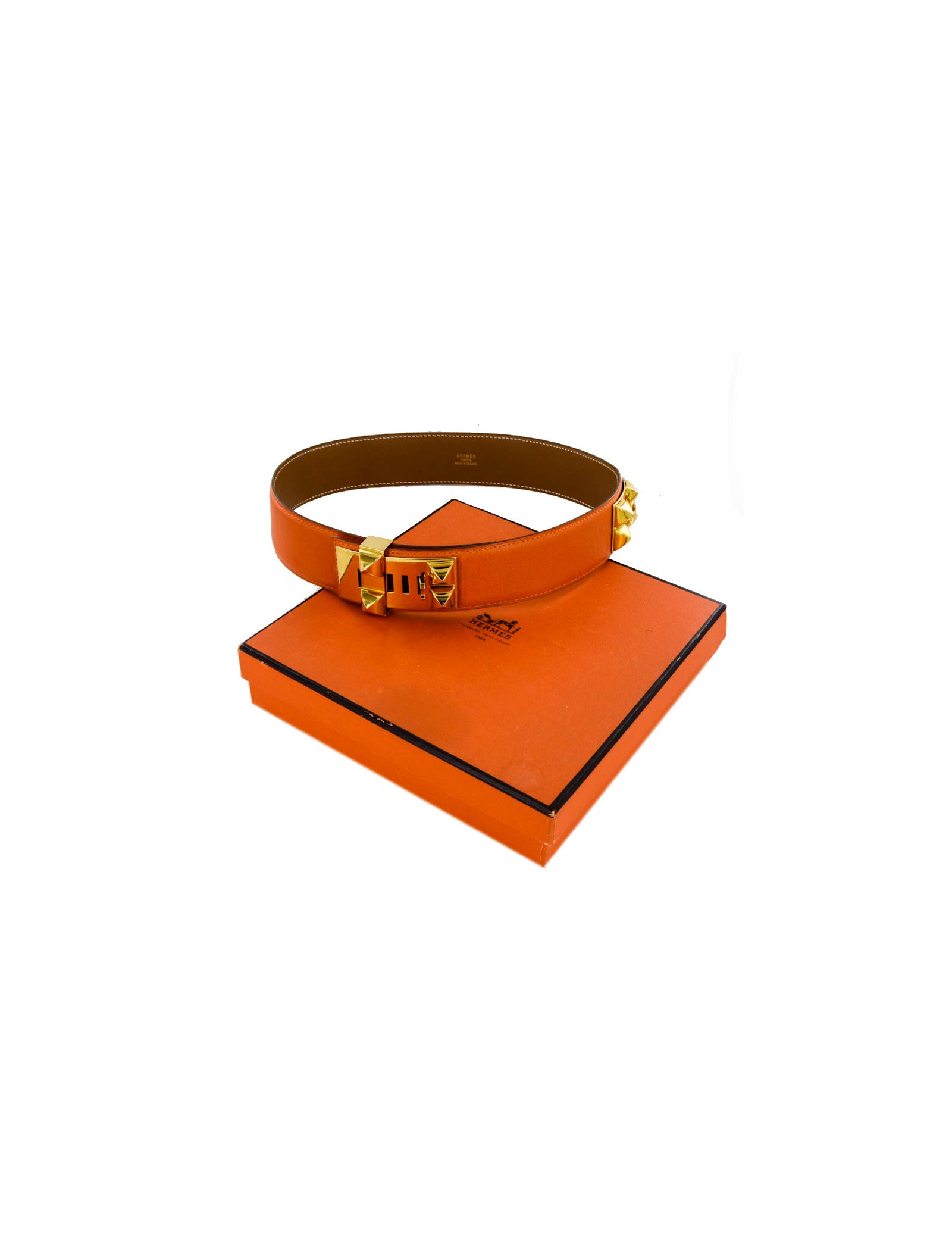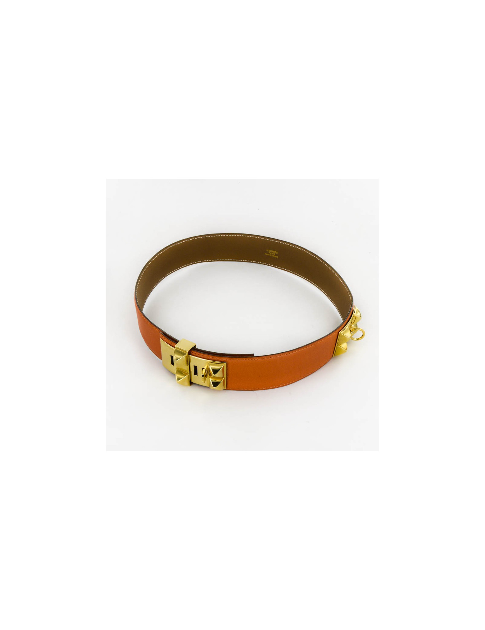 Ceinture CDC collier de chien ou Médor, Hermès, en cuir lisse orange. L'intérieur est en cuir gold. la bijouterie est en métal doré à l'or fin.Taille 68 Il y a la lettre U dans un rond. Pièce vintage. Elle est en très bon état ( petite marque sombre sur le côté)