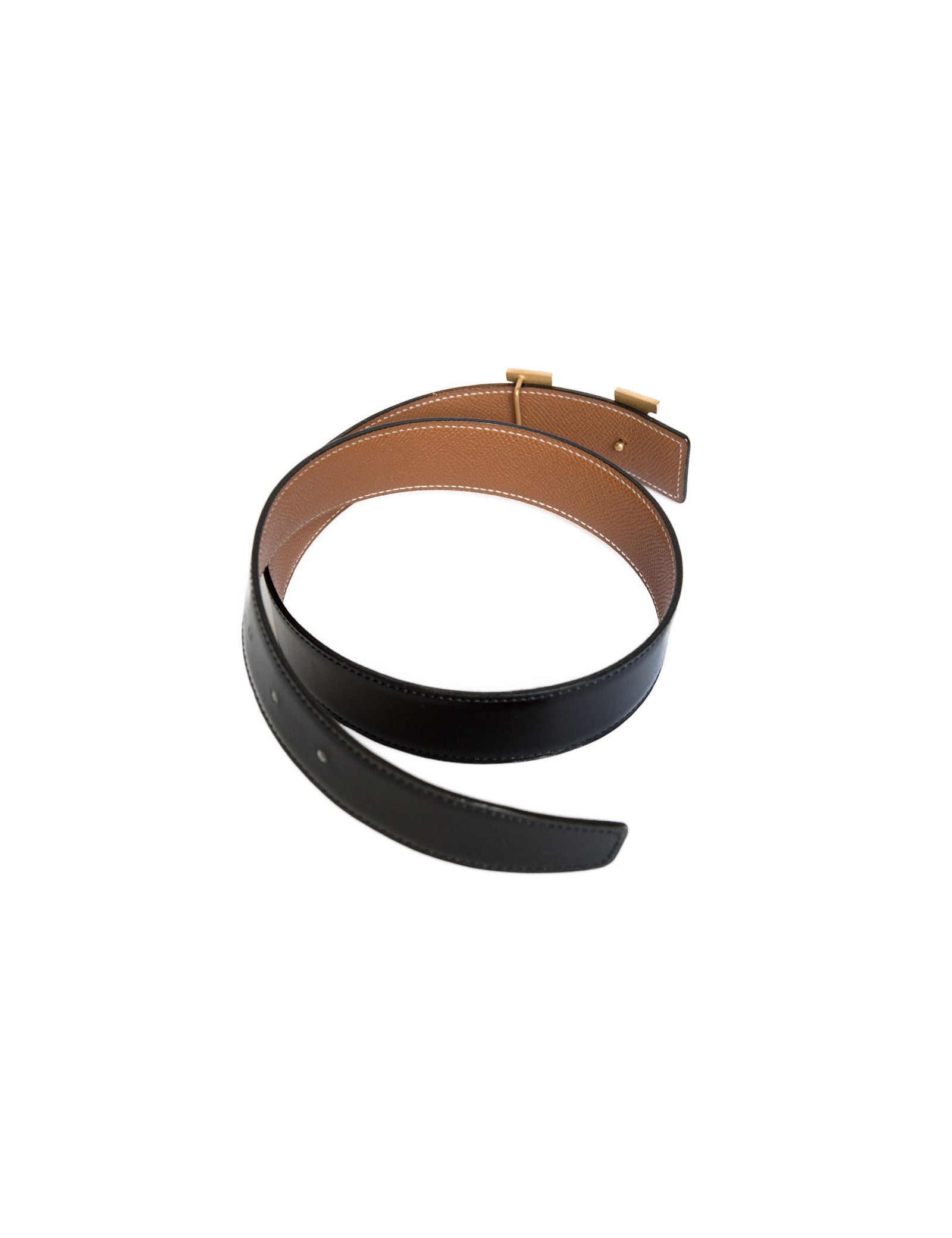 Ceinture H Hermès réversible en cuir box noir d'un côté et cuir courchevel gold de l'autre.