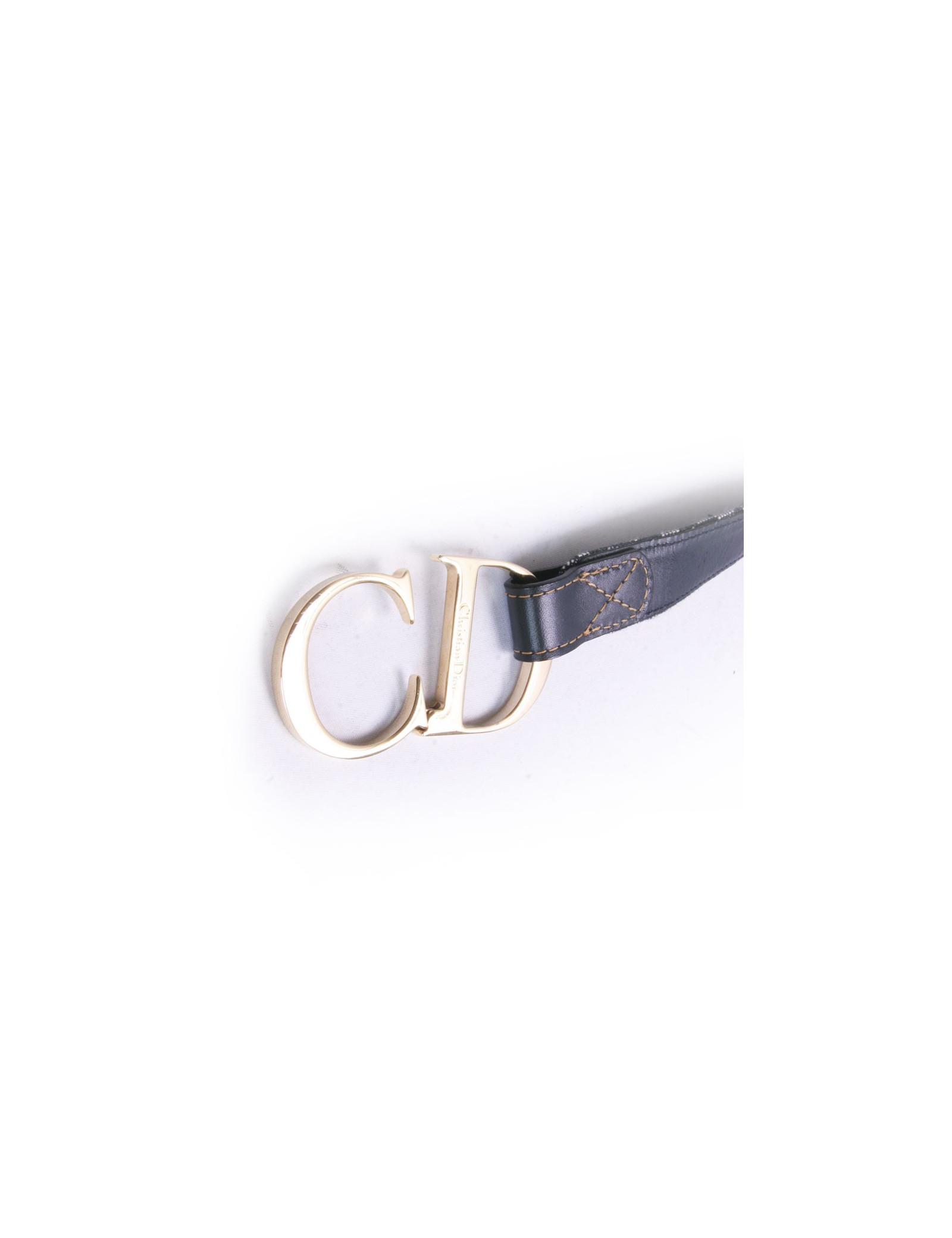 Très jolie ceinture Christian Dior en tissu monogram bleu. Elle se ferme à l'aide d'un scratch. Le logo "CD" en métal doré. Surpiqûres de couleurs claires. En très bon état.