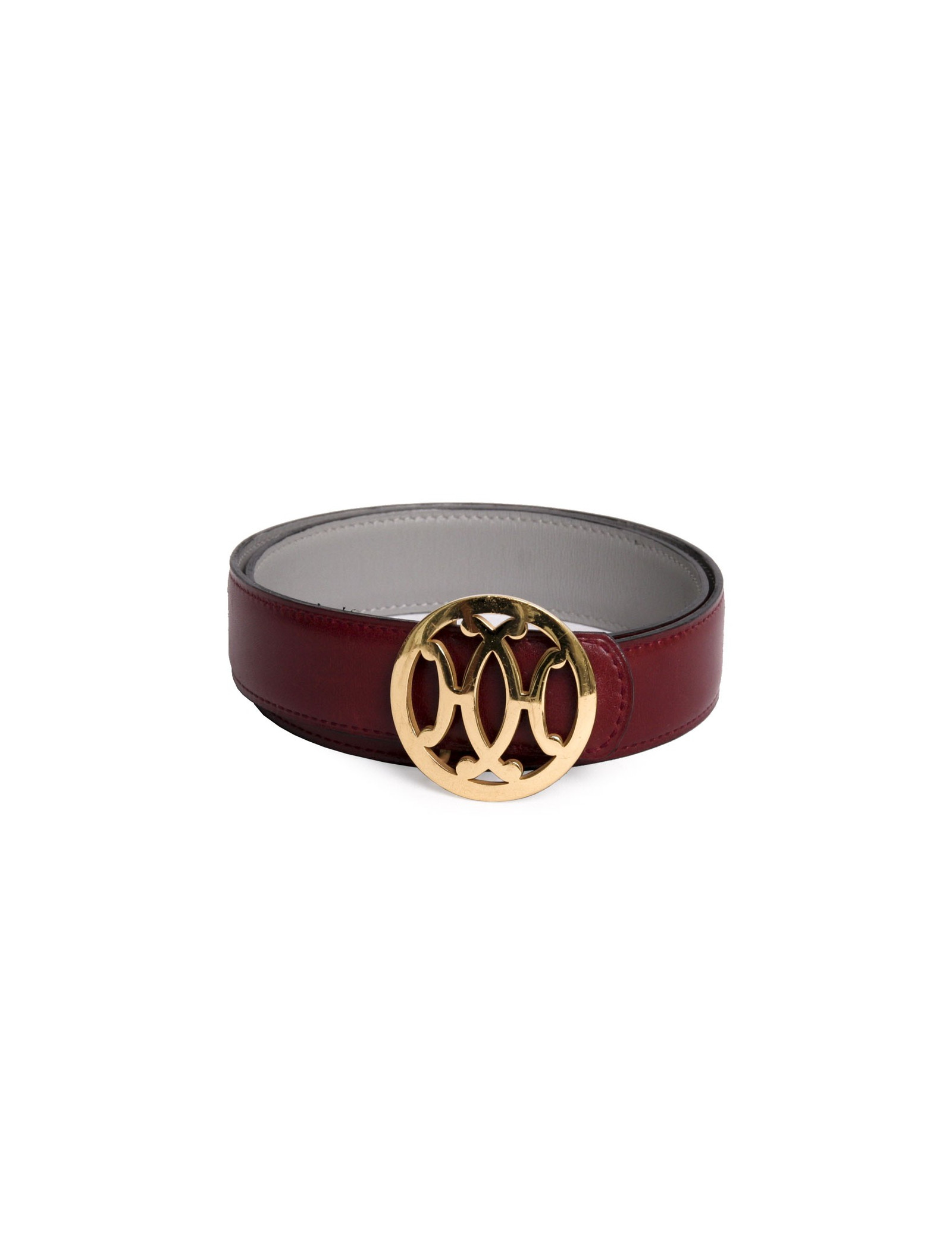 Ceinture vintage de la maison Hermès, extérieur en cuir box burgundy et intérieur en cuir lisse gris, la boucle en métal dorée représente la lettre H dans un rond stylisée (mesure 4,5 cm x 5 cm)