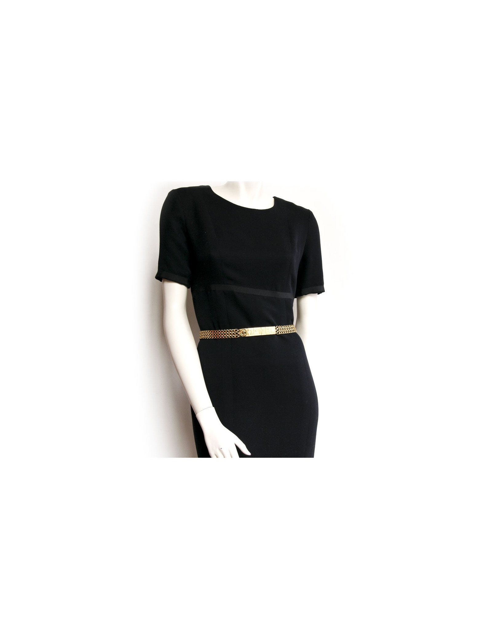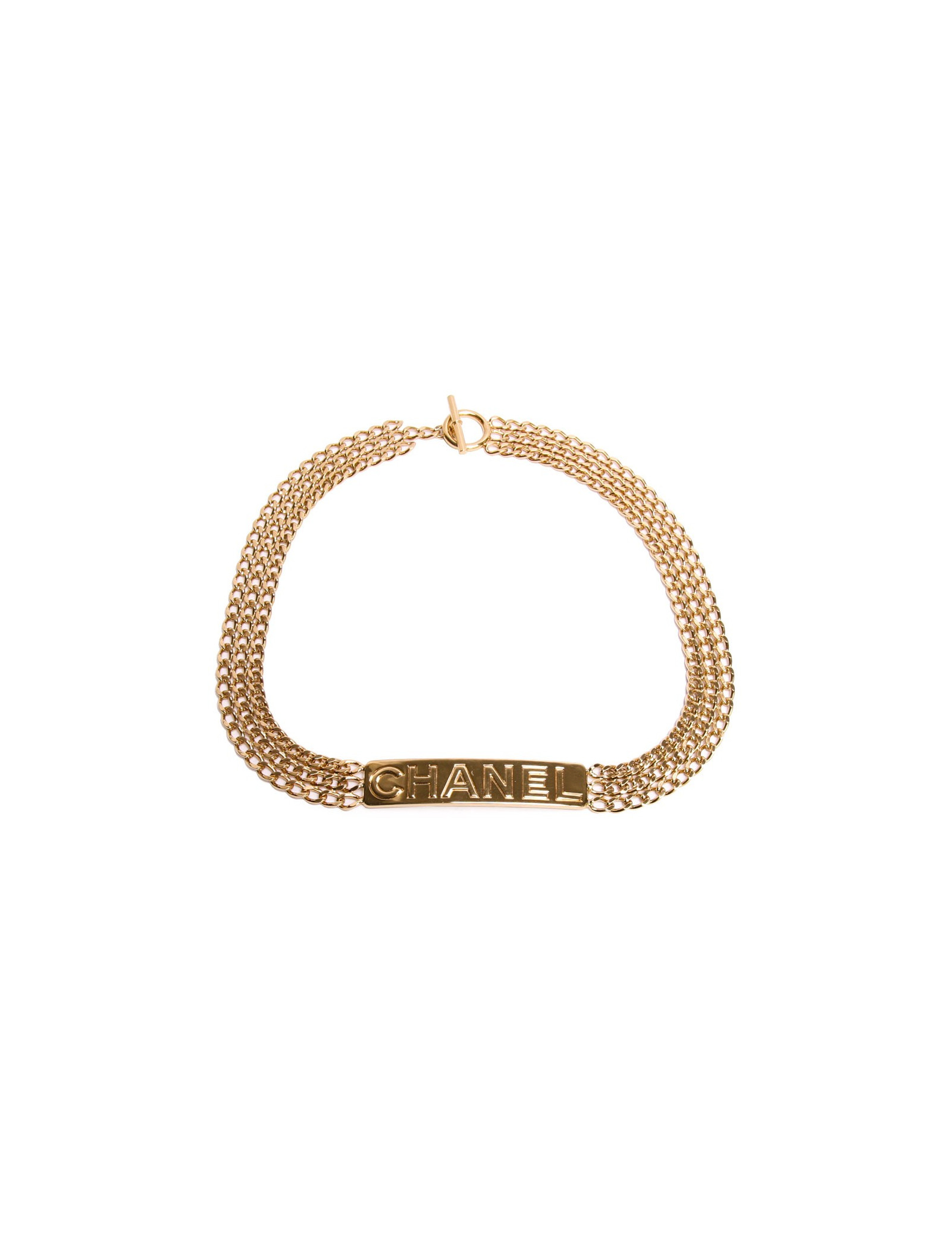 Ceinture CHANEL en chaîne dorée, avec une plaque à l'avant indiquant "CHANEL, Elle est en très bon état. elle mesure : 68 cm de longueur et 2 cm de hauteur. La plaque mesure : 9.5 cm de long