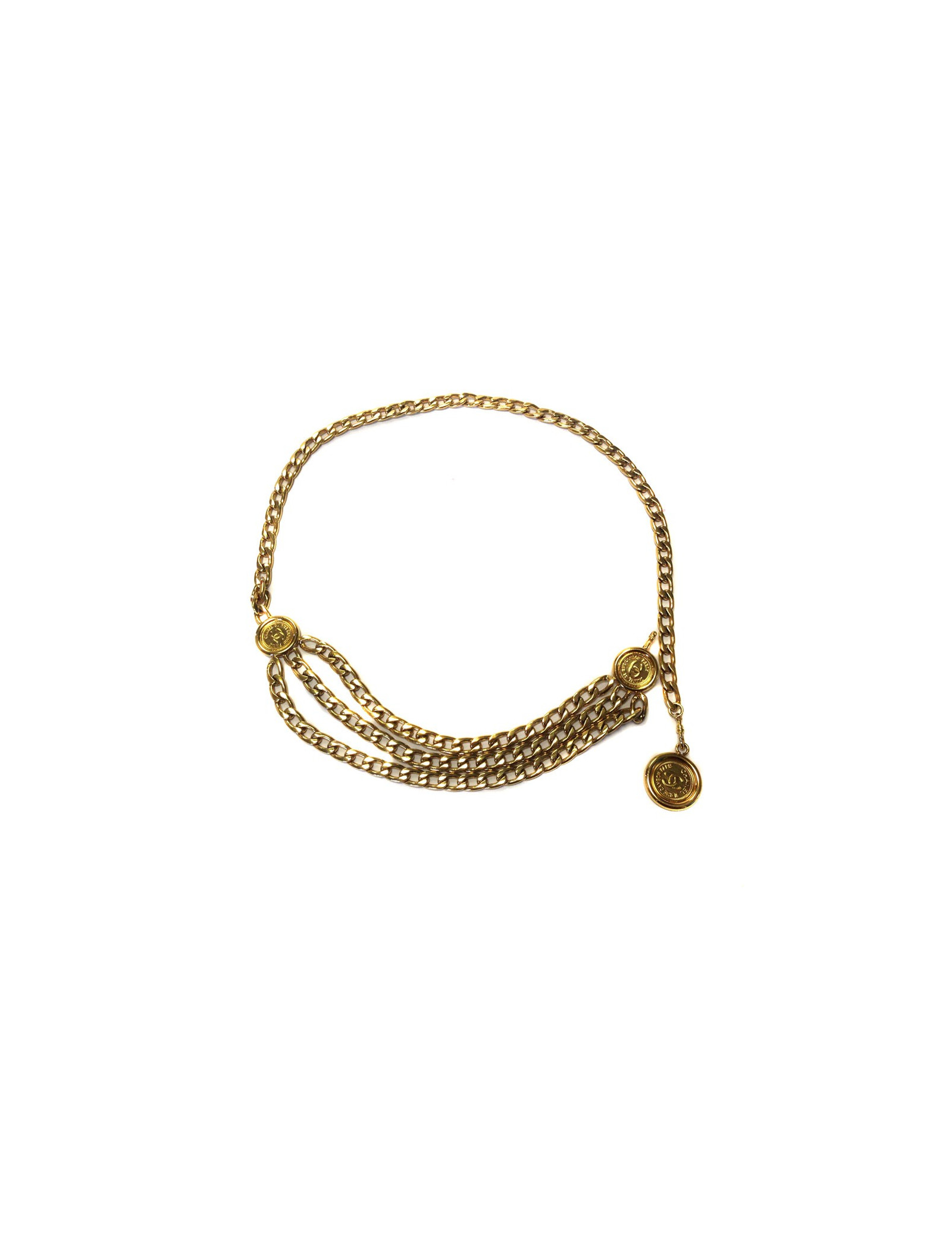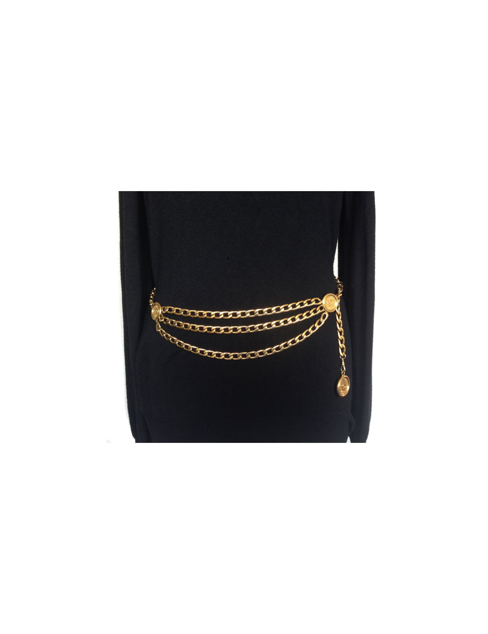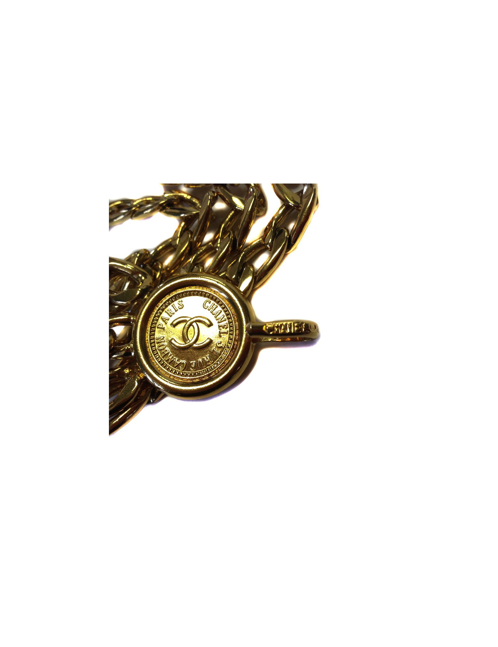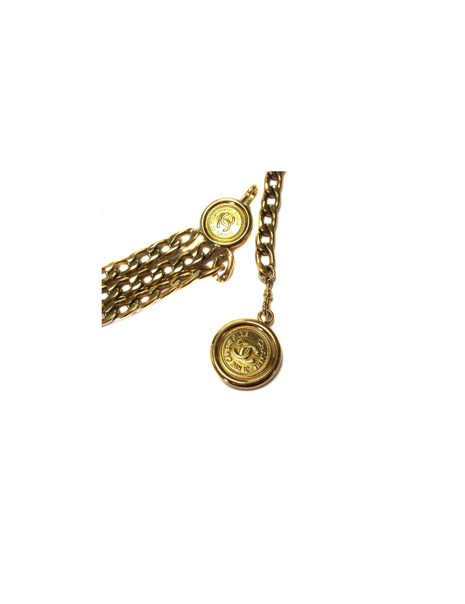 Ceinture en chaîne aux maillons épais style gourmette, ornée de médaillons gravés CHANEL. Vintage (collection des années 1990),s'adapte à toutes les tailles: de 30 à 90 cm