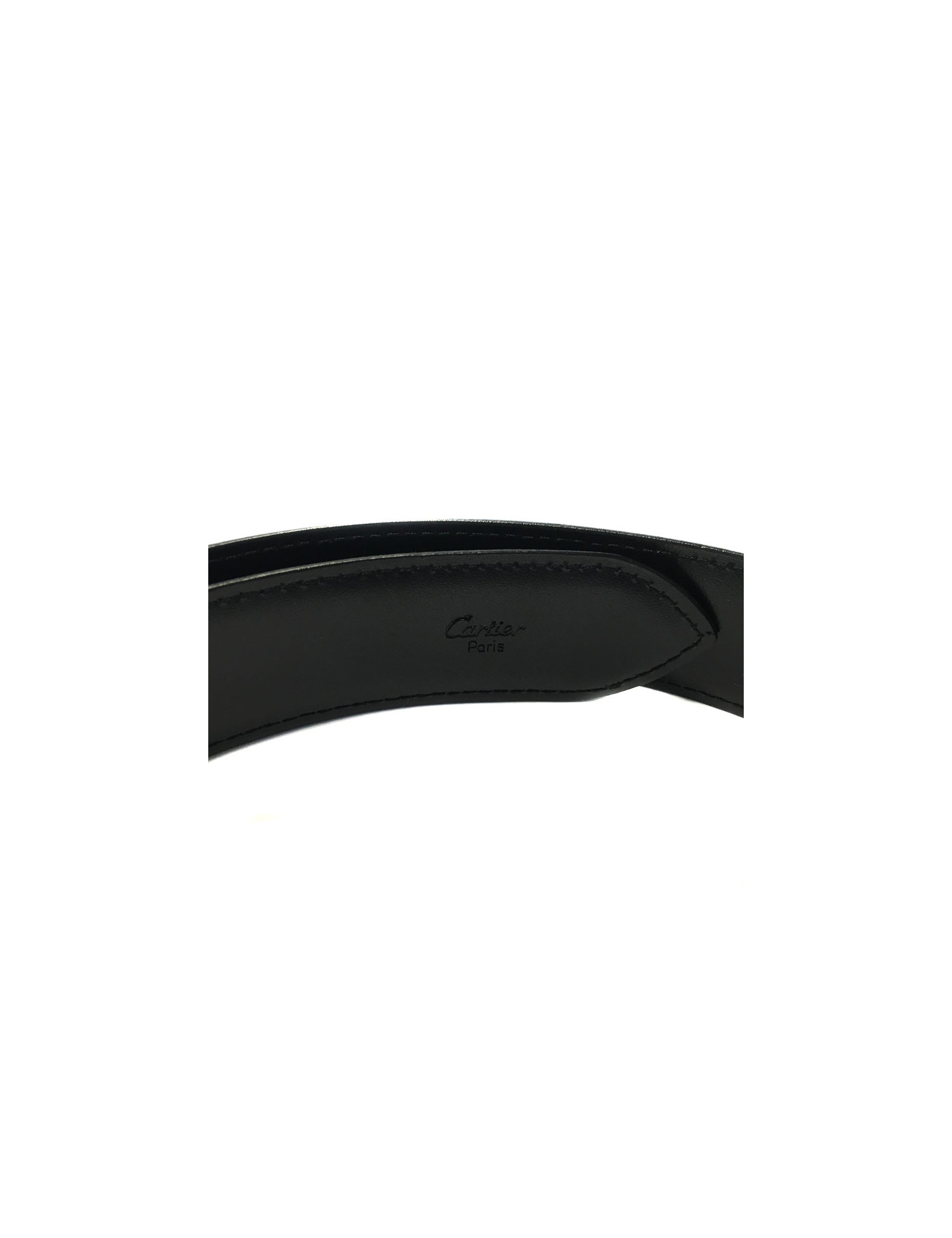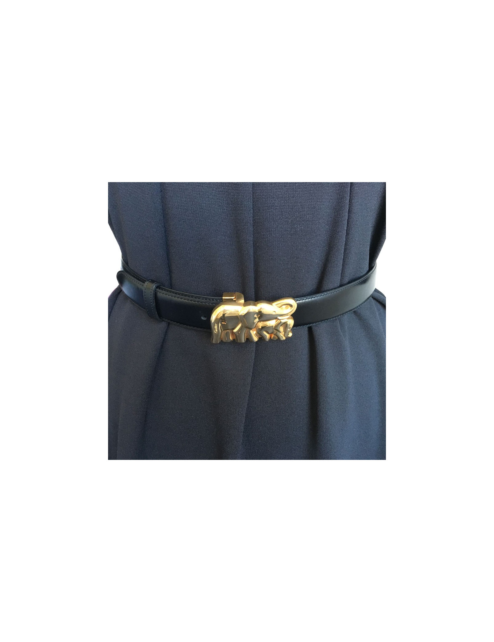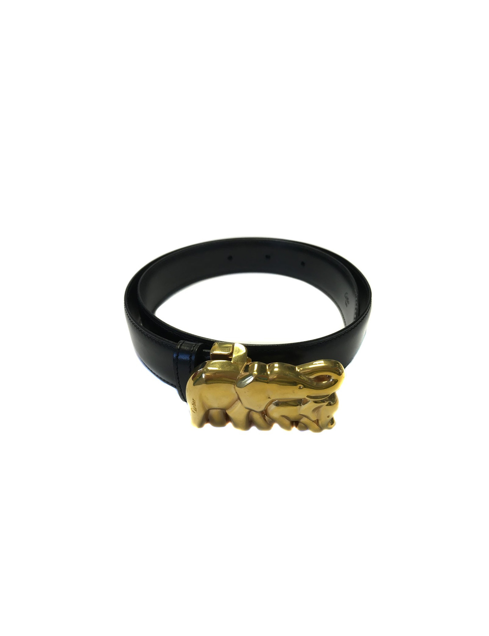 Superbe ceinture CARTIER en cuir noir et boucle éléphants en métal doré. En excellent état. Infimes griffures au dessus des trous.