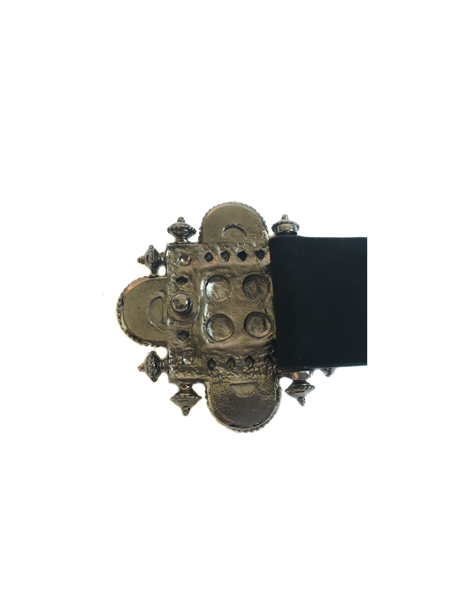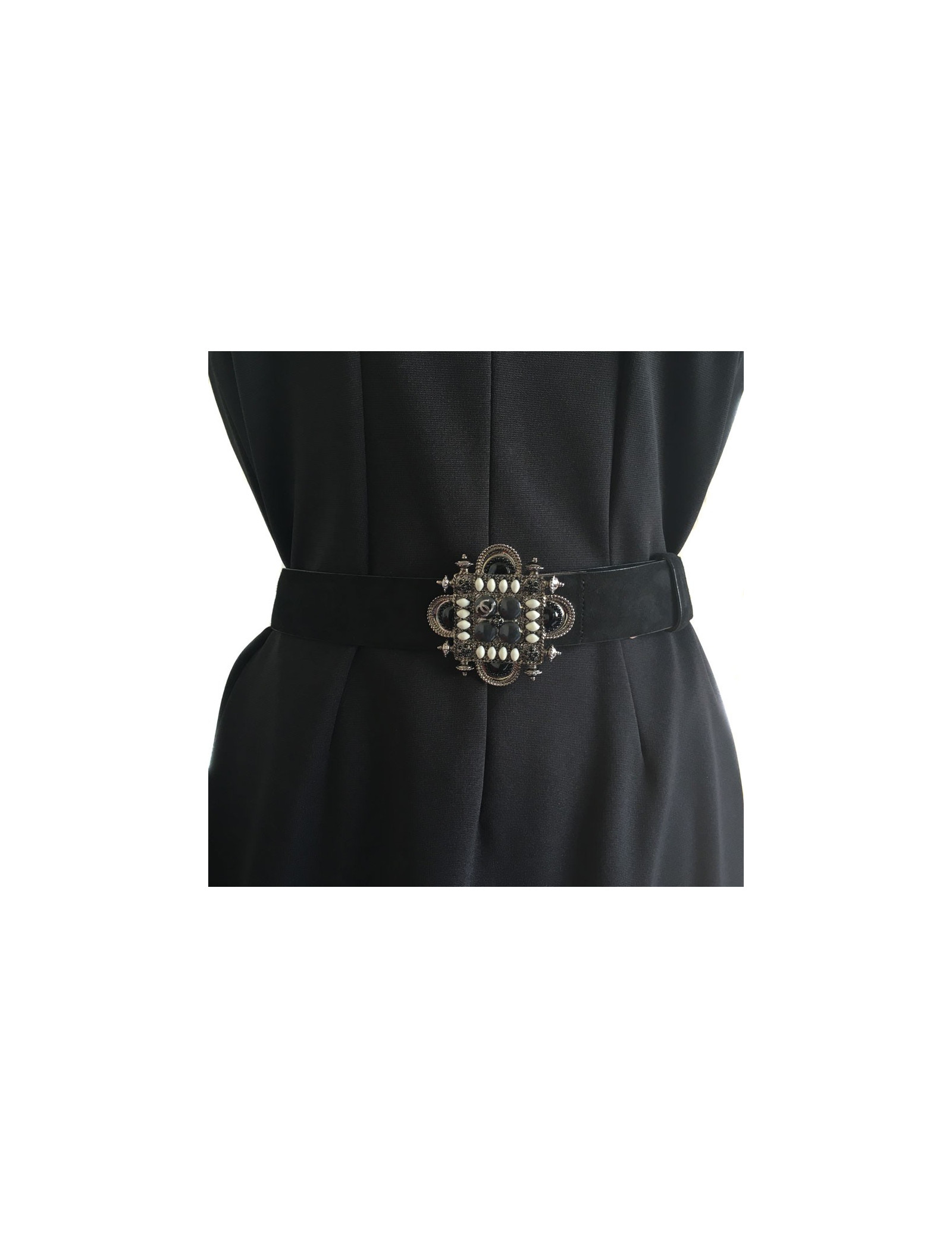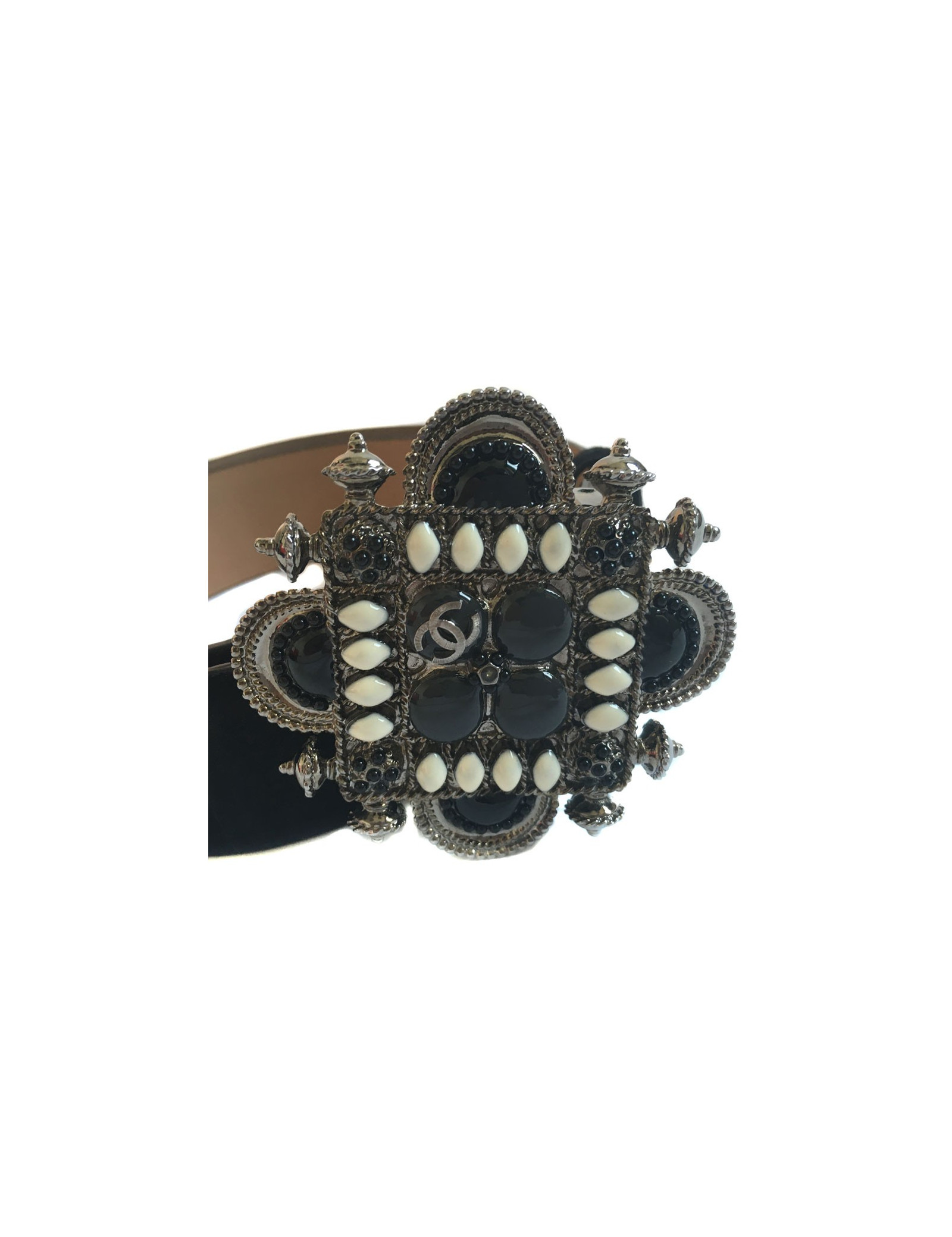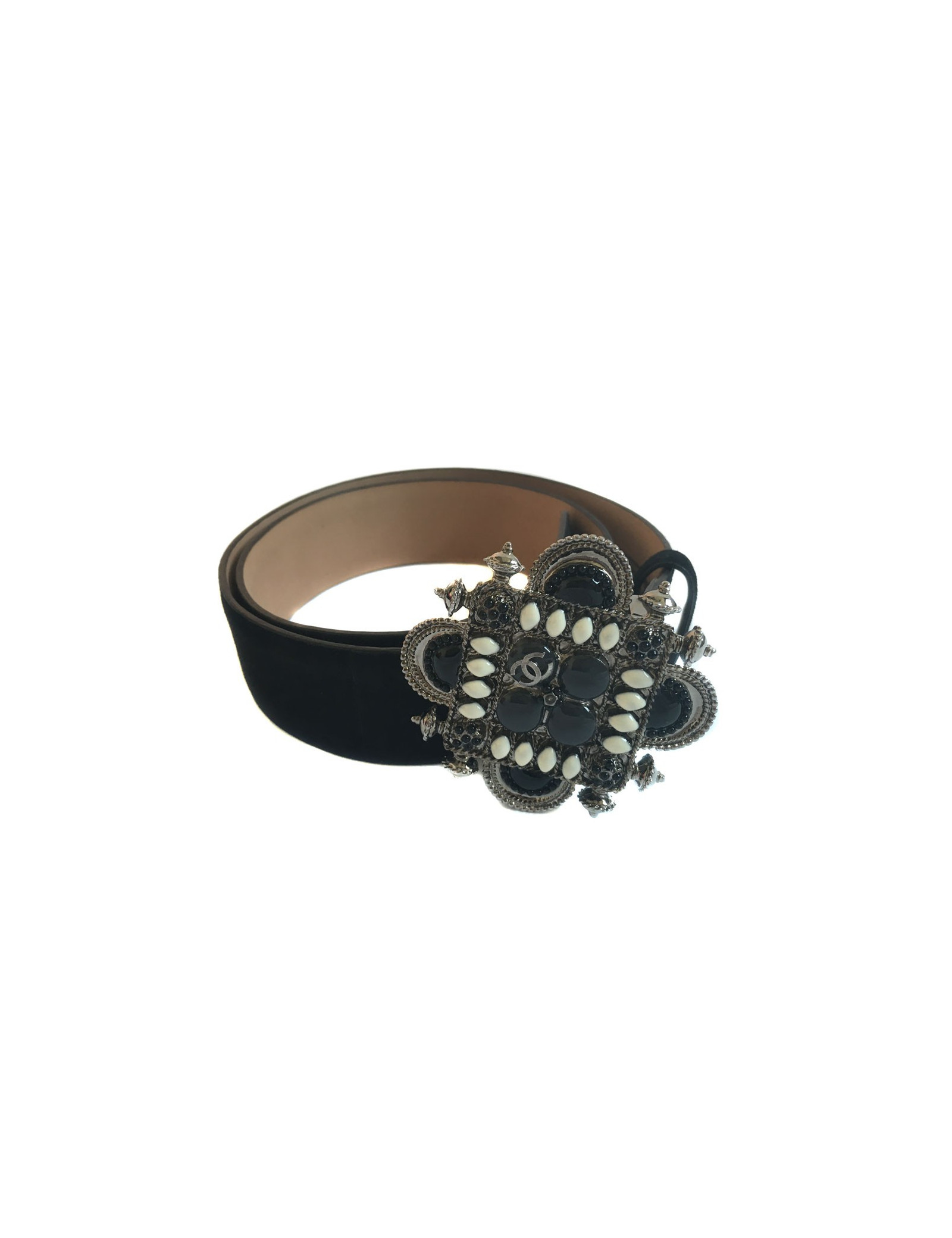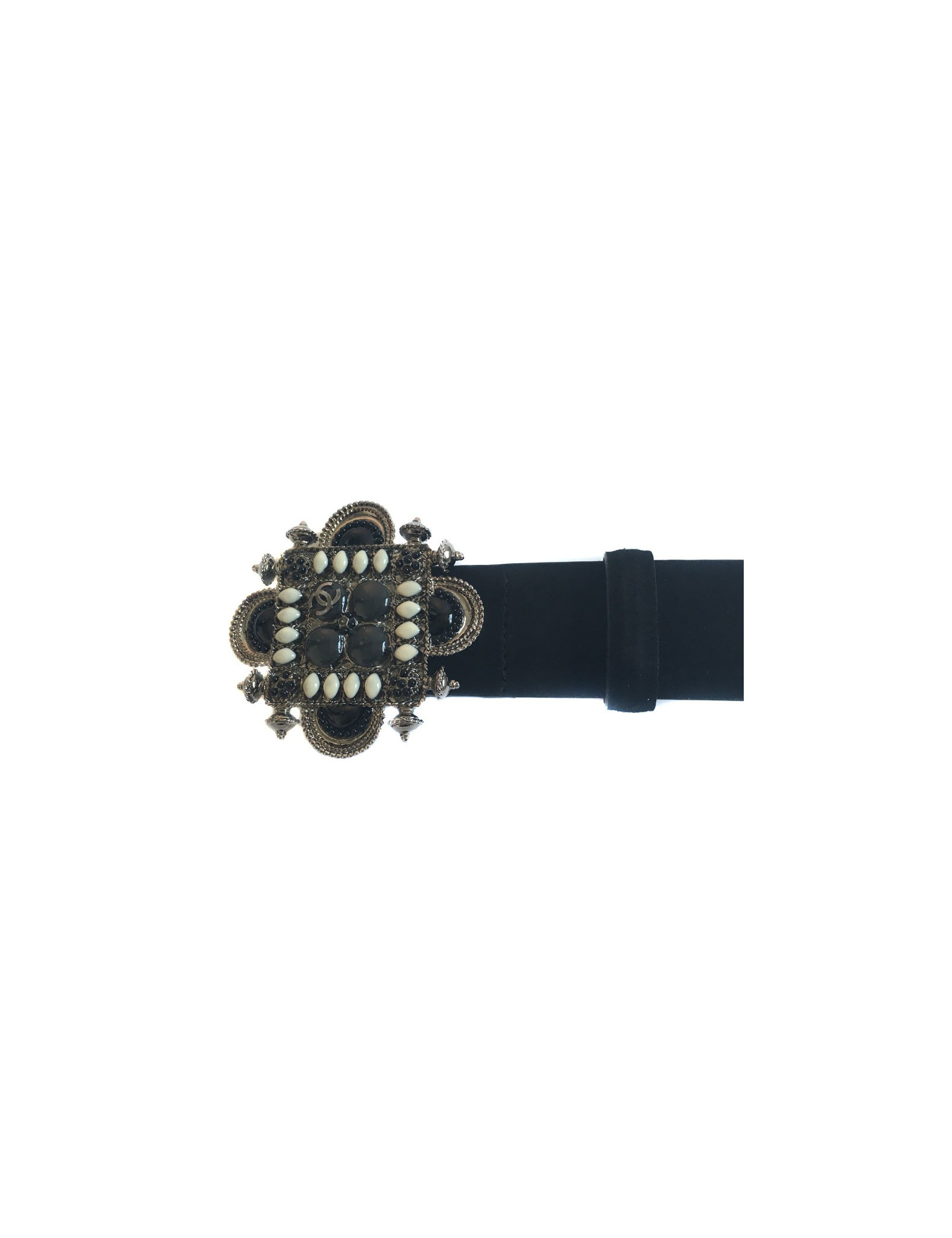 Ceinture Chanel T80 bijou émaillé noir, gris et ivoire monté sur métal argenté. Ceinture en suède noire. État neuf. Issue de la Collection Croisière de 2011.