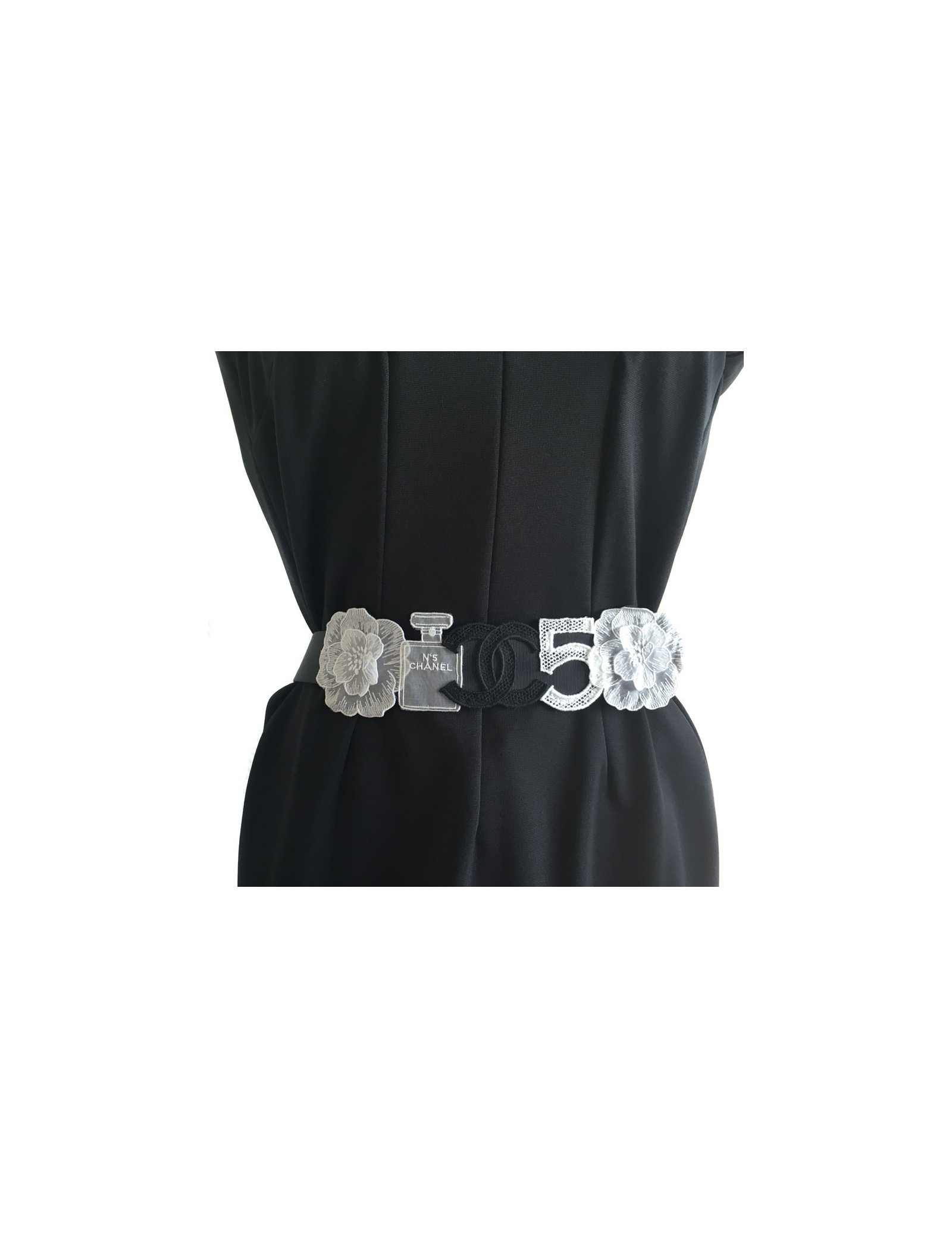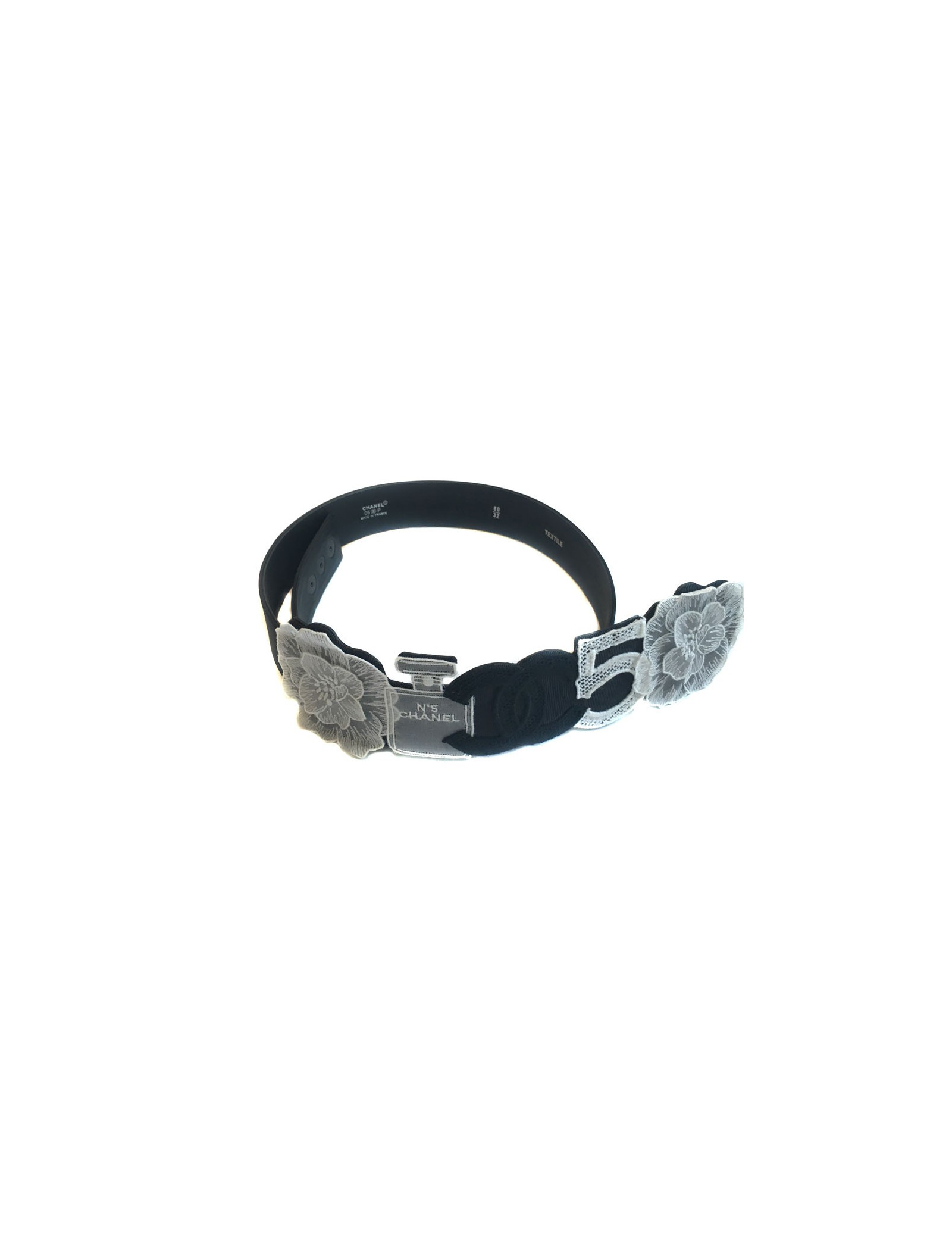 Collector! Ceinture Chanel T80, en gros grain noir, ornée des codes de la Maison en broderie coton noir ou blanc : Camélias, bouteille de Chanel n°5, CC, 5. État neuf, aucune trace d'usure. Elle se ferme par 3 boutons pressions.
