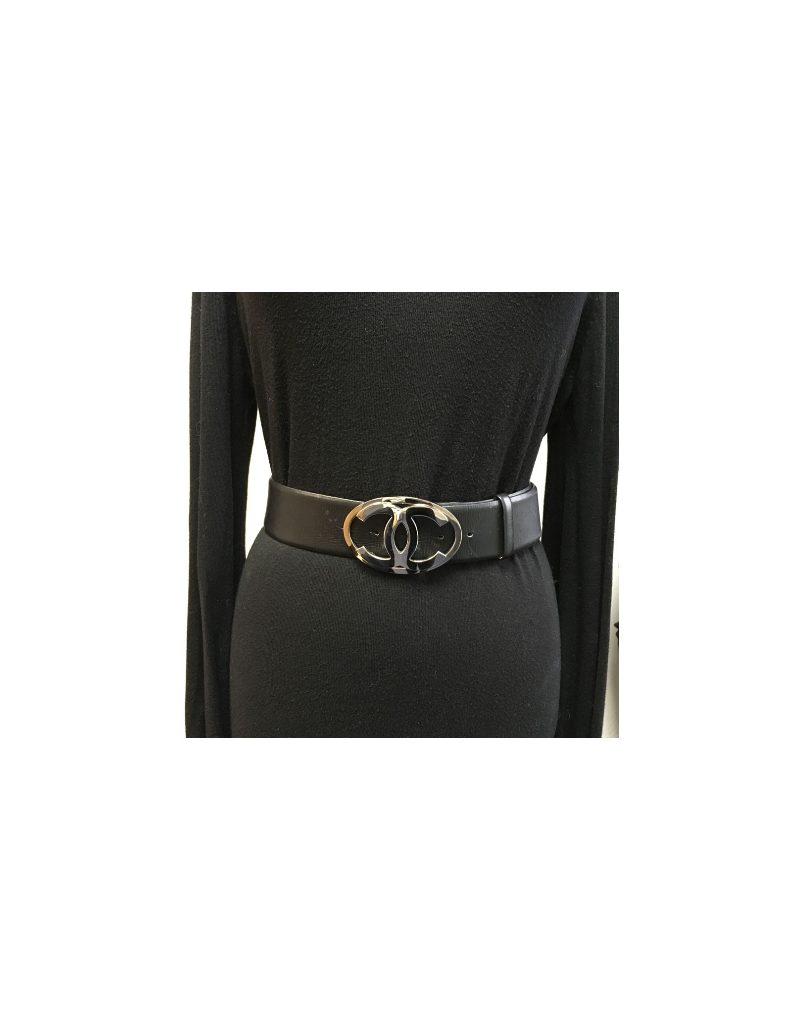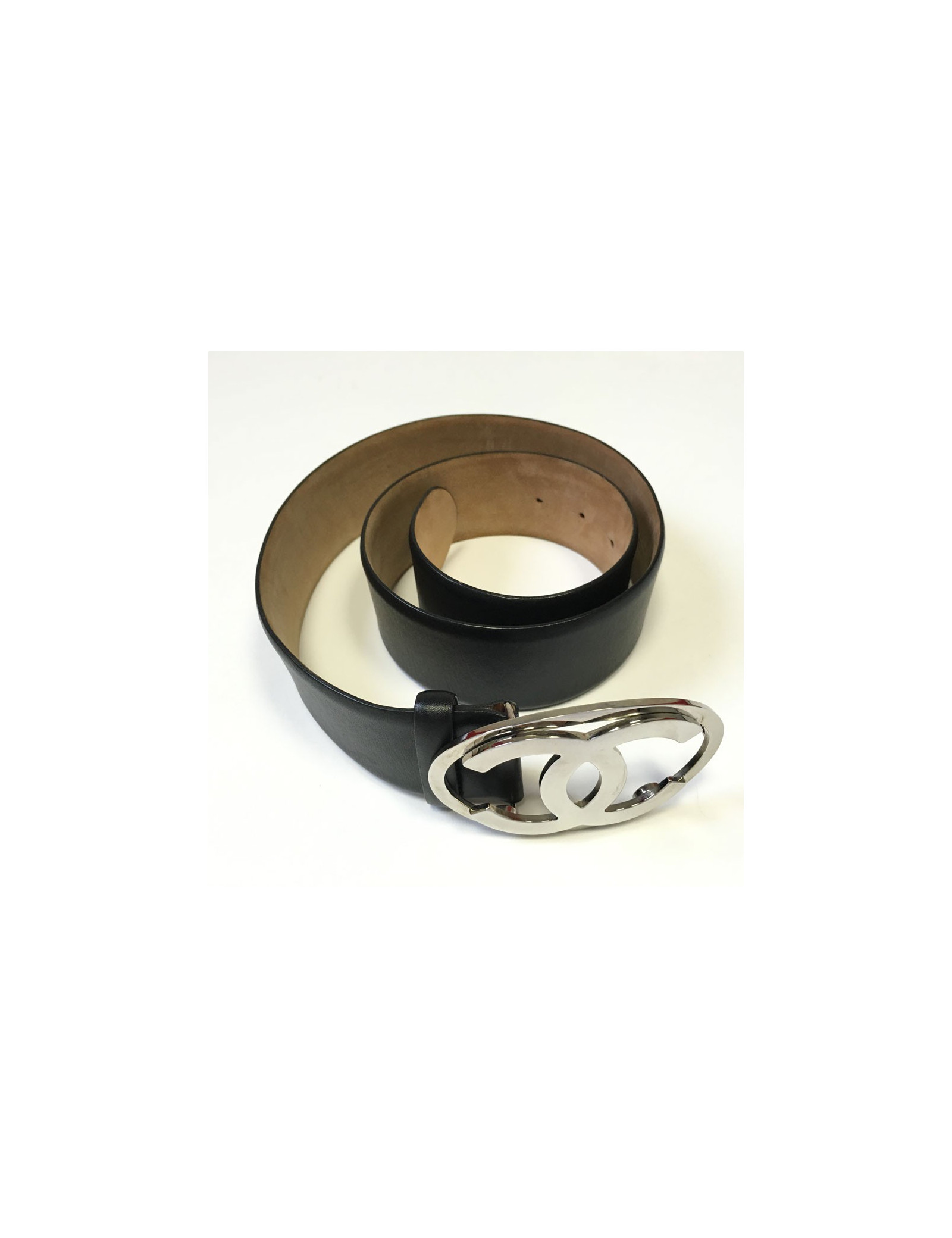 Ceinture CHANEL en cuir noir et boucle CC en métal argenté.