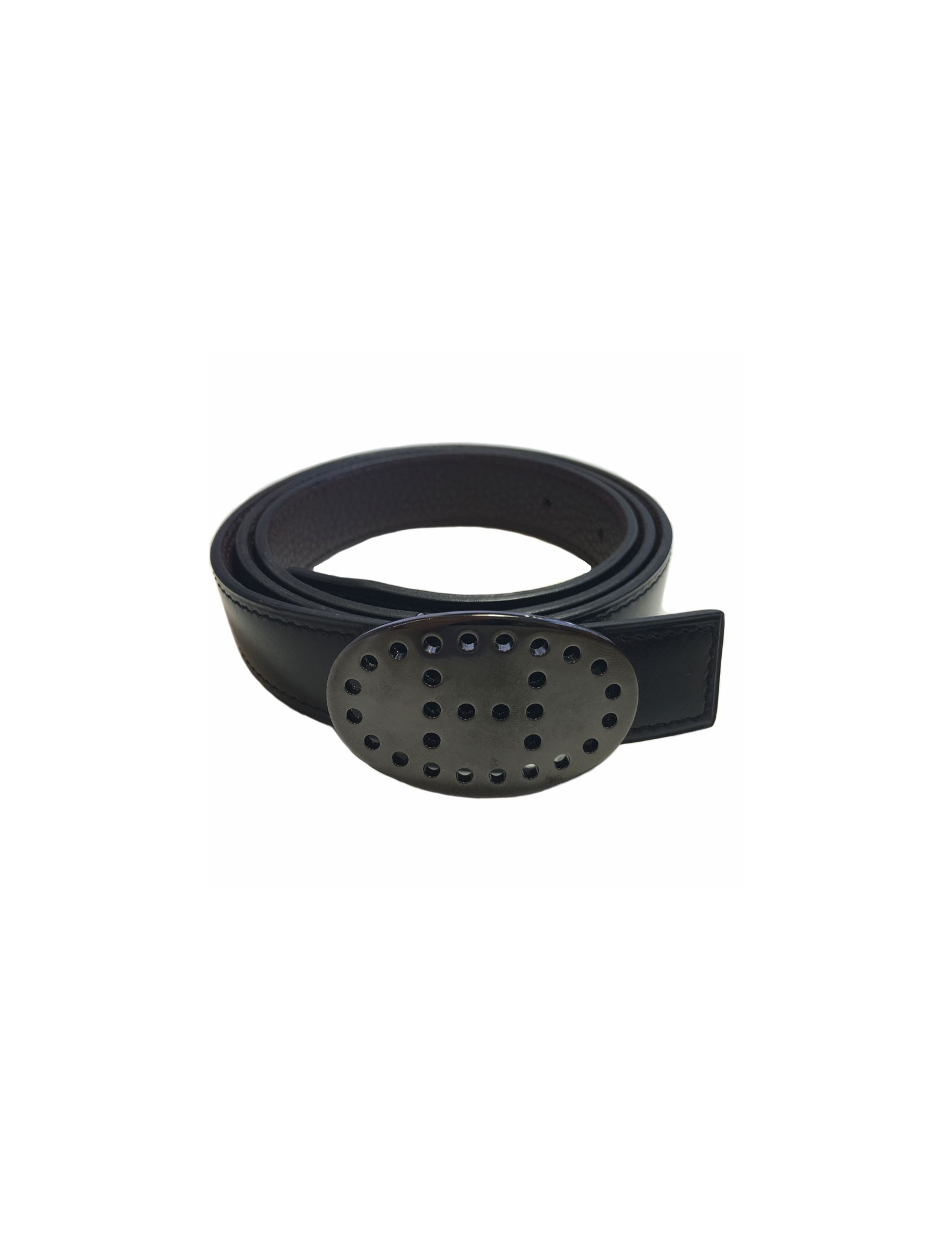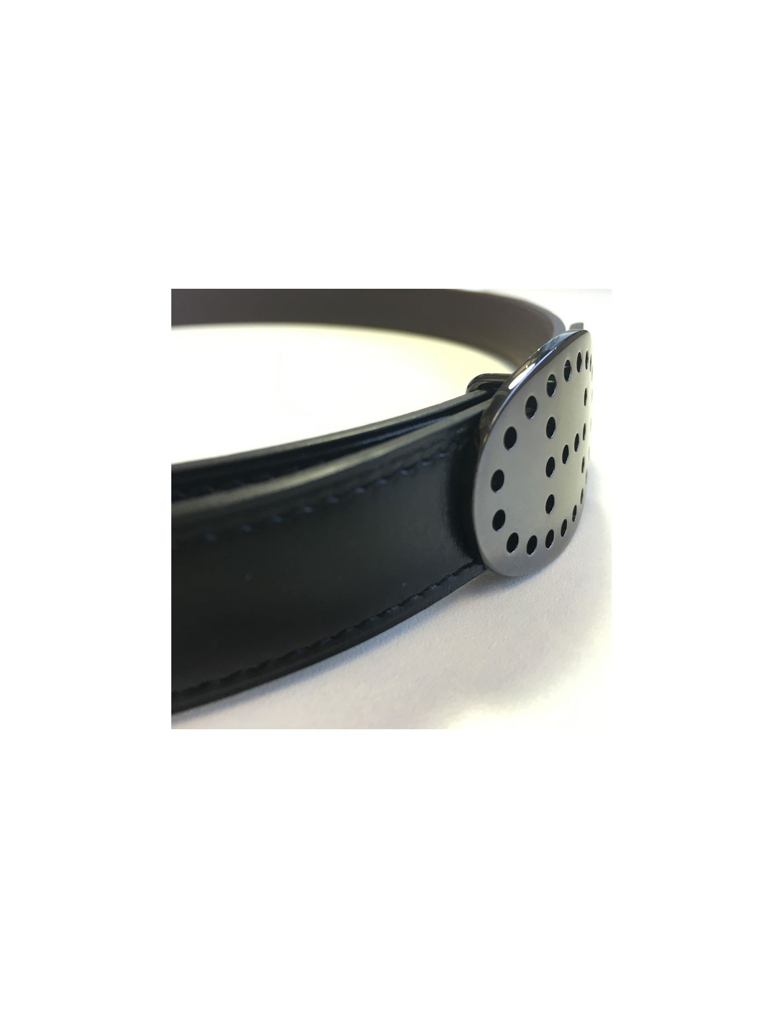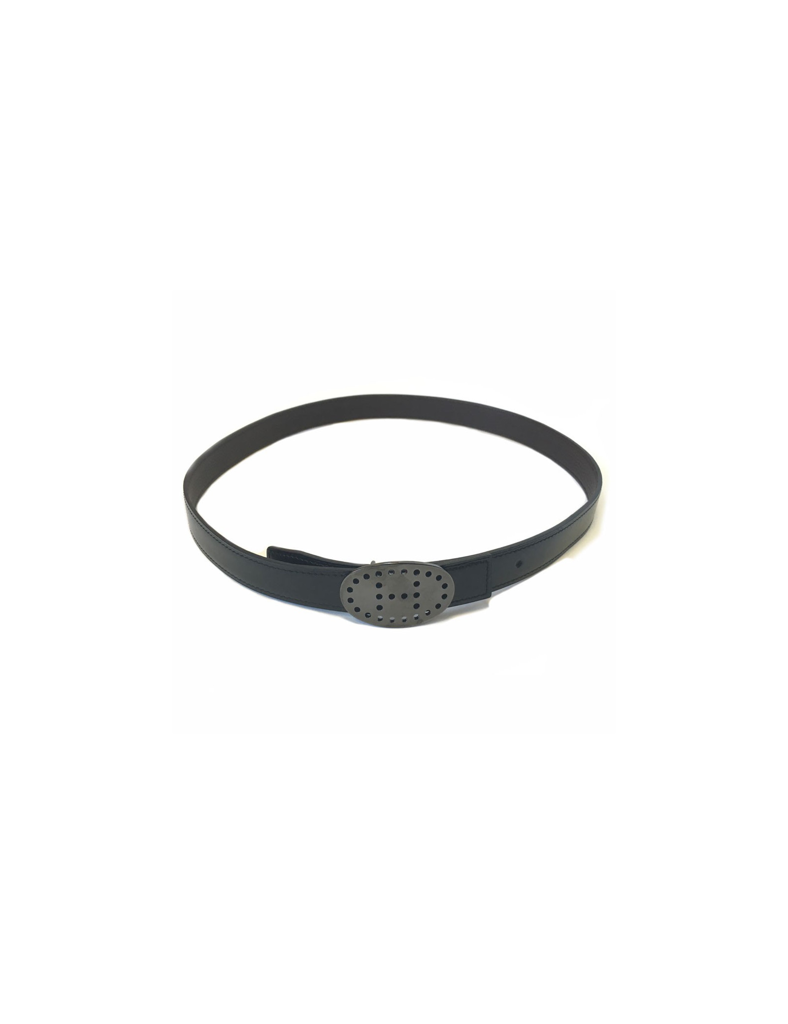 Ceinture HERMES réversible en cuir box noir et cuir veau grainé marron. Boucle en métal argenté noirci. H perforé sur la boucle. ceinture en parfait état.
