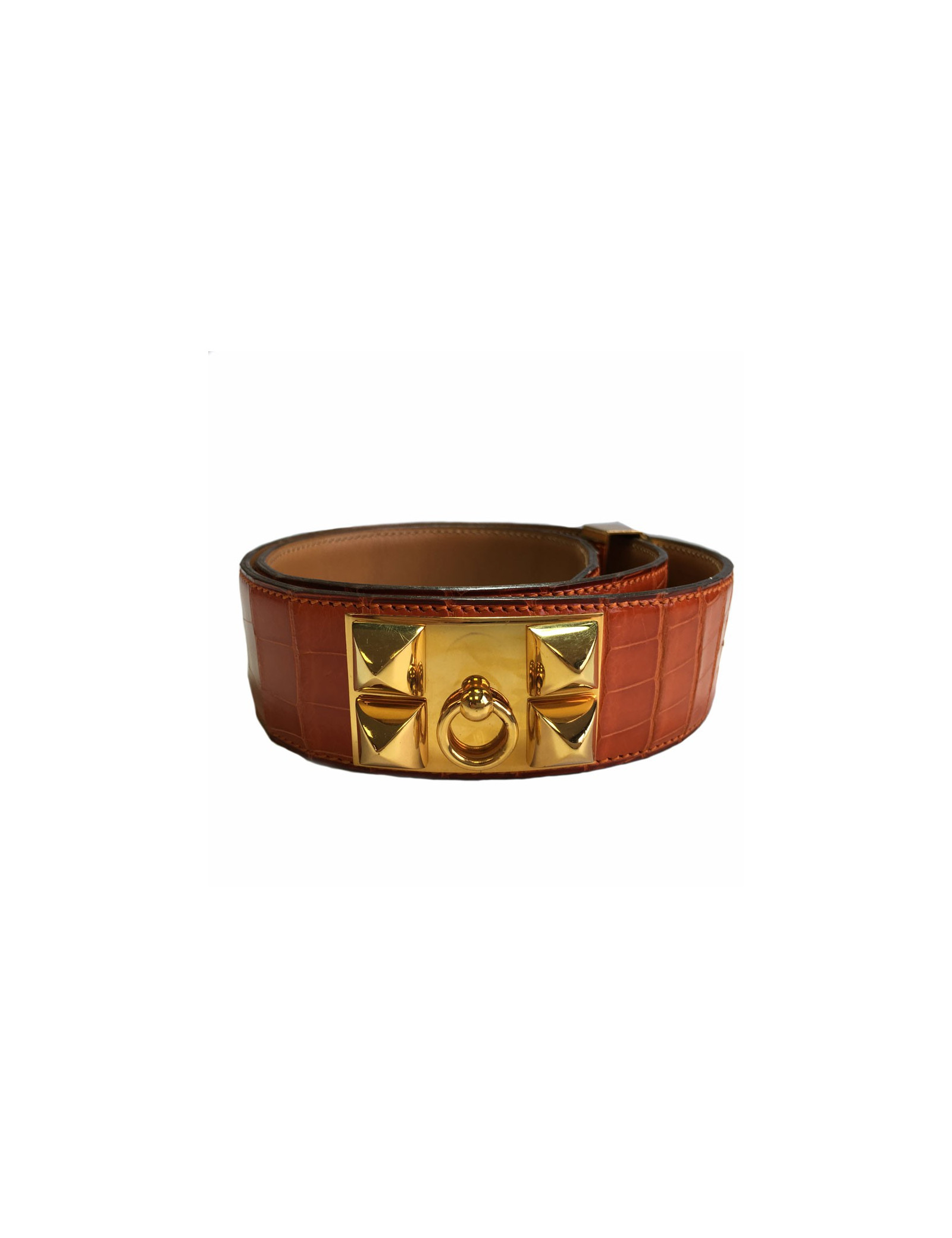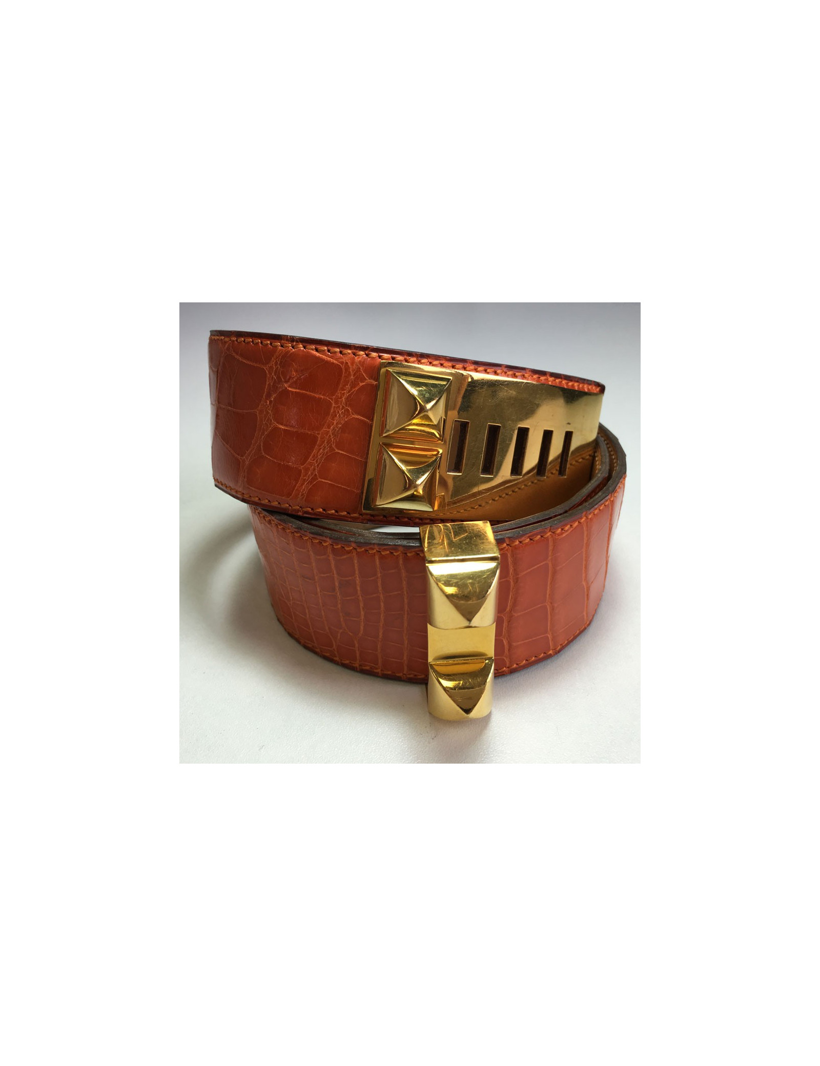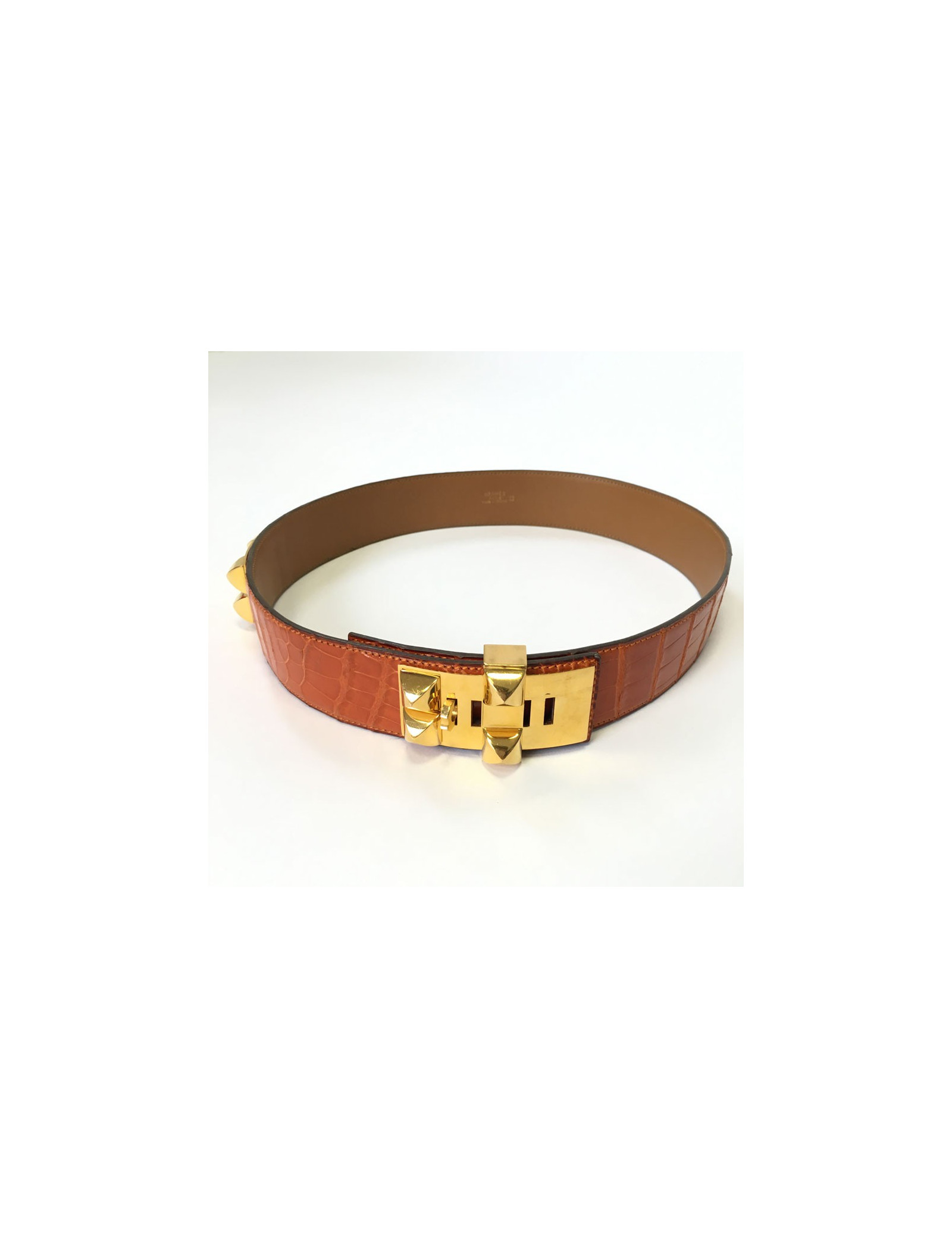 Ceinture HERMES CDC en crocodile orange. Taille 76. En très bon état. Quelques micros rayures sur la bijouterie dorée, infimes traces sur le cuir marron à l'intérieur. Lettre X dans un rond.