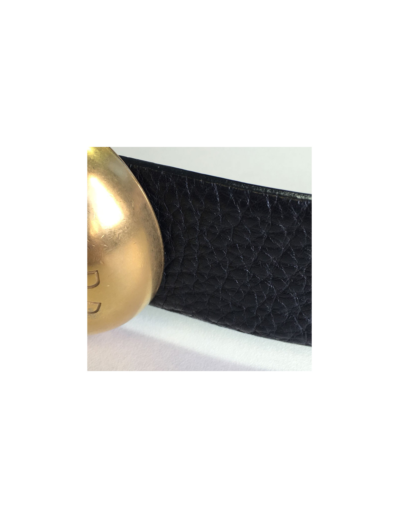 Ceinture DOLCE & GABBANA en cuir noir, boucle demis sphère ronde dorée. Inscription de la marque sur la boucle.