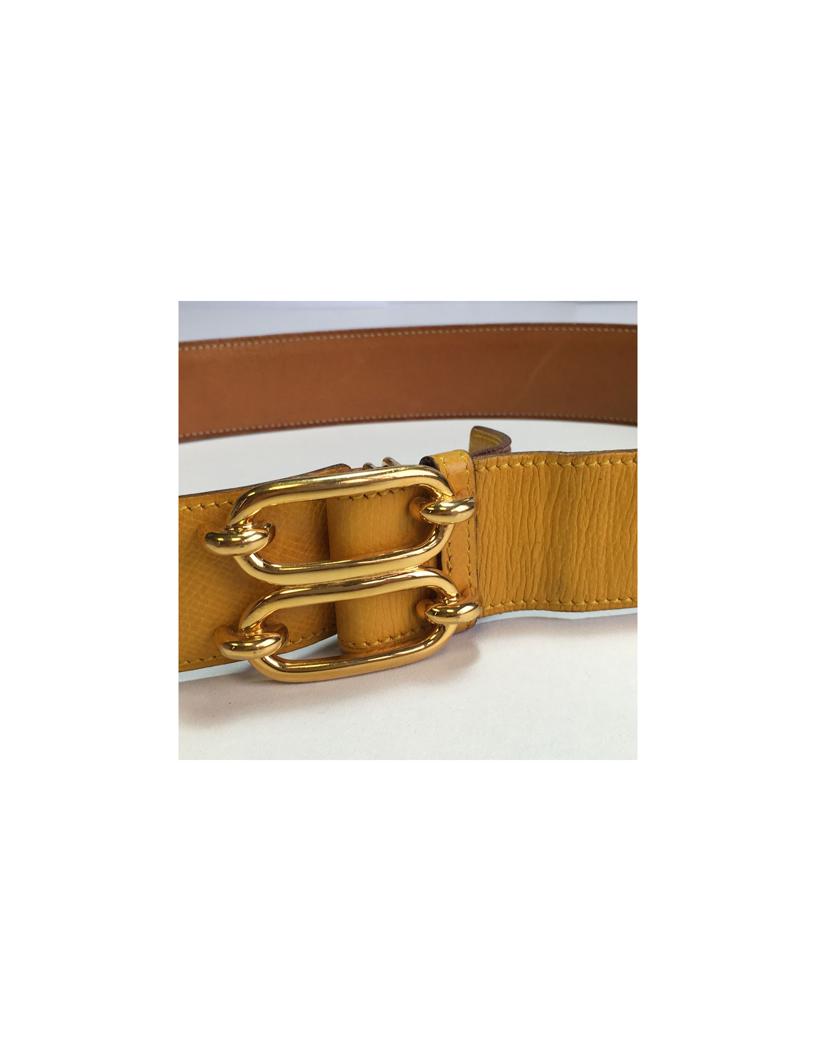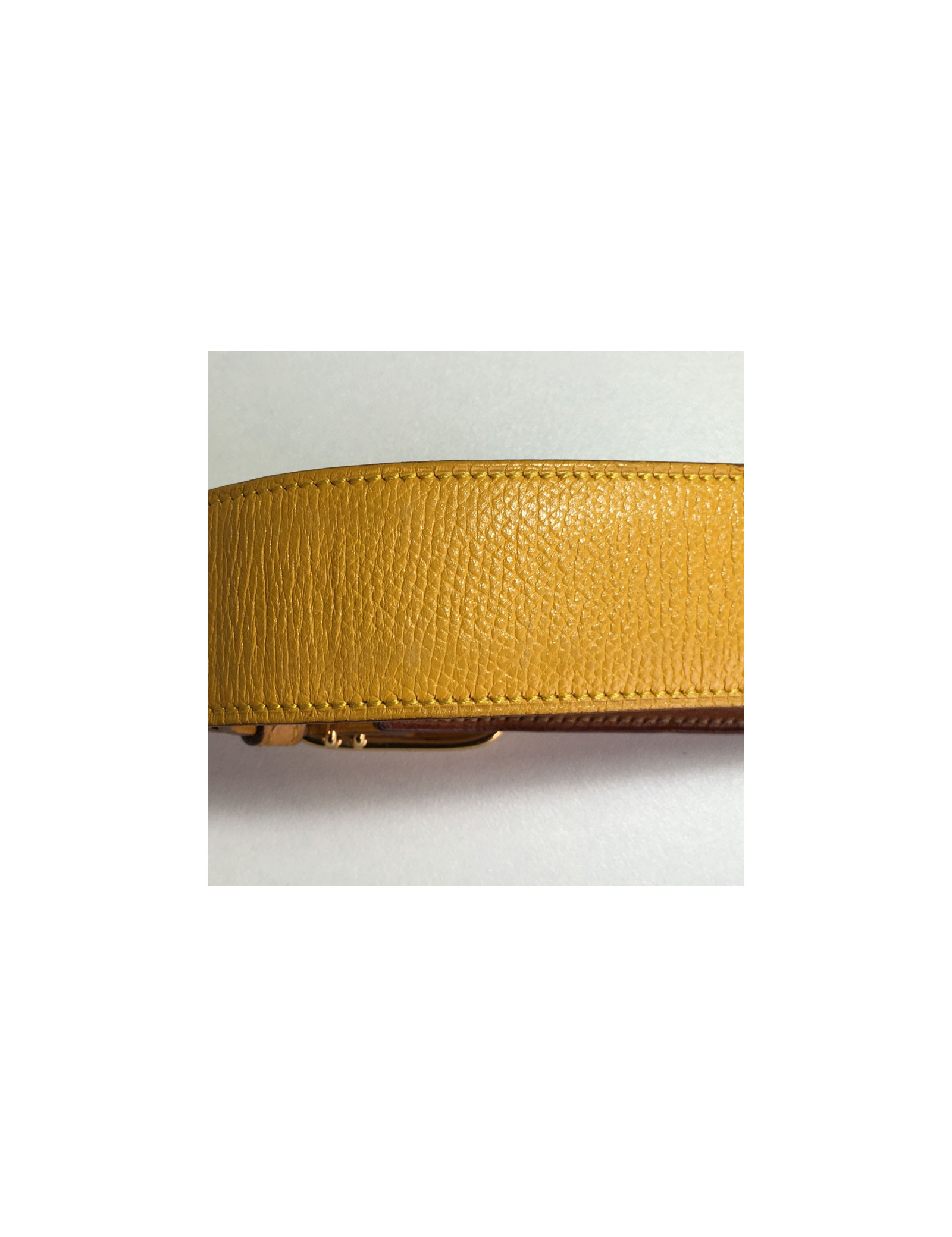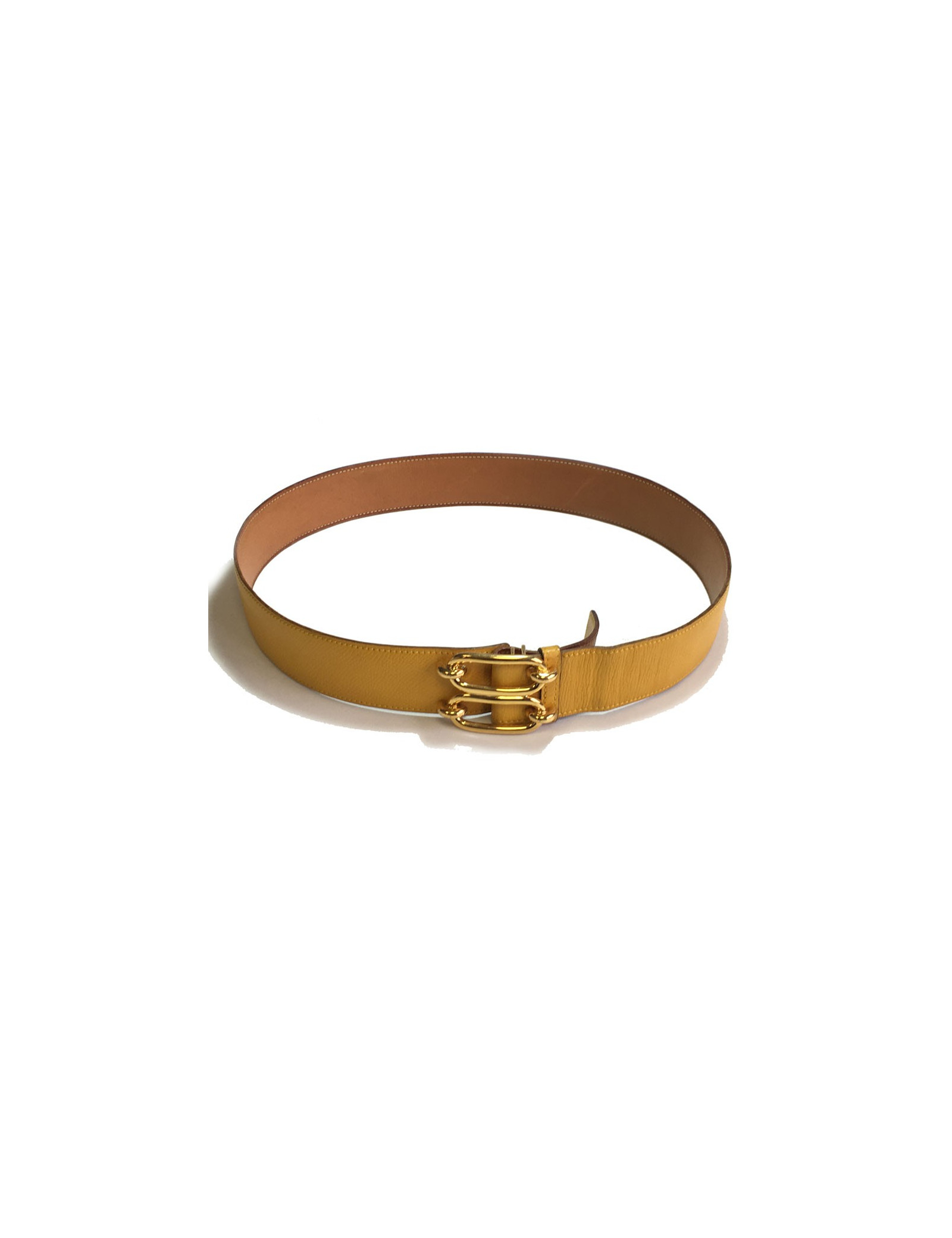 Ceinture Hermès vintage en cuir courchevel jaune et cuir lisse gold (réversible), petits plis d’usure au niveau de la boucle côté jaune sinon rien d’autre à signaler. Côté gold, une légère trace sur le milieu. Fermoir en laiton doré impeccable.