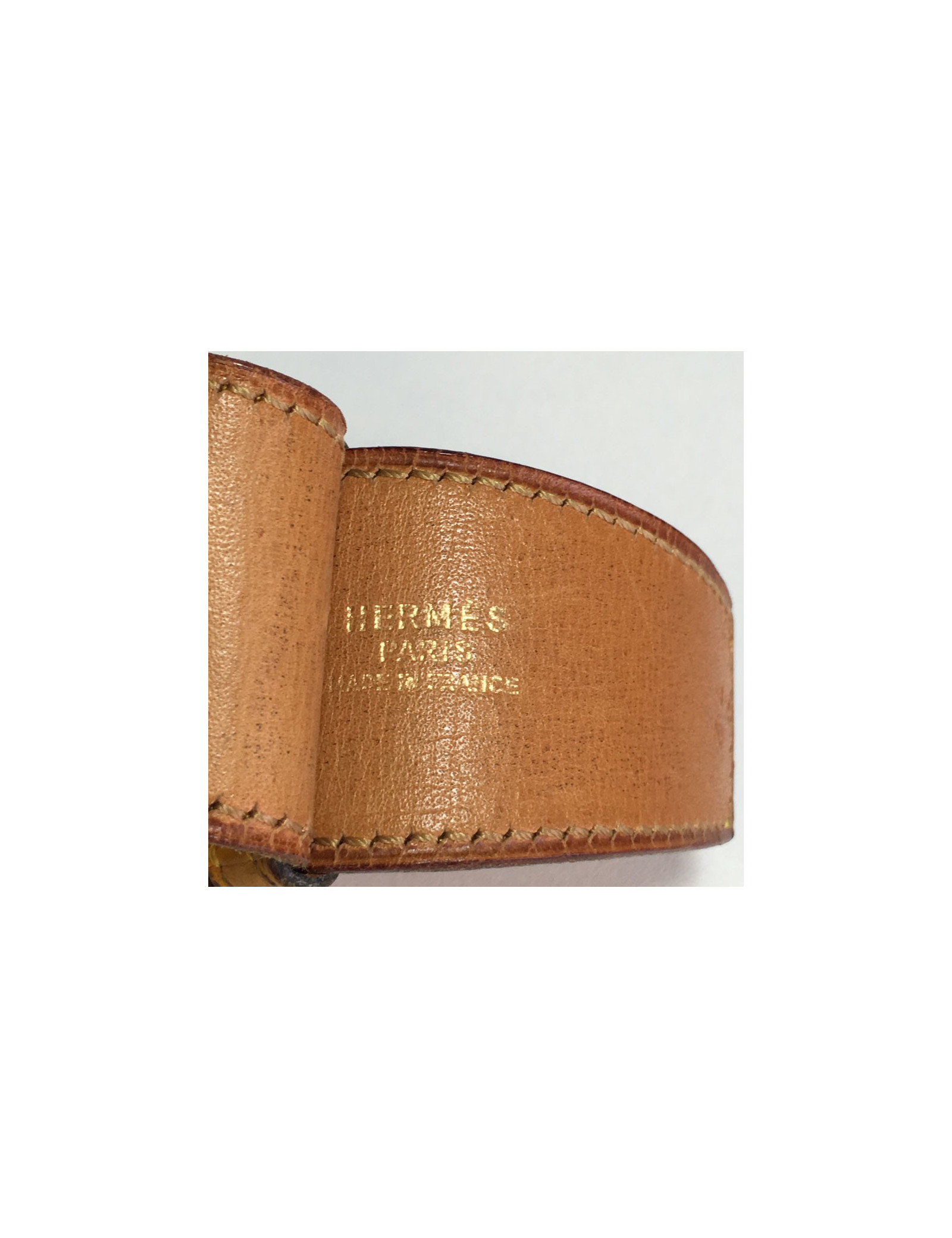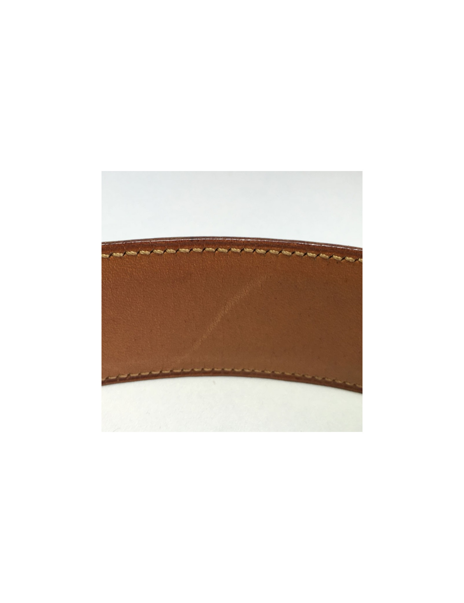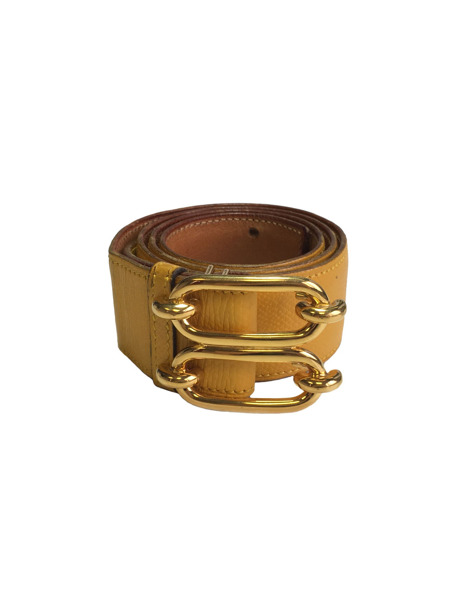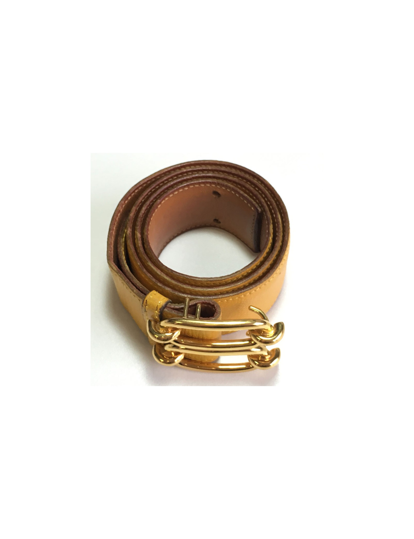 Ceinture Hermès vintage en cuir courchevel jaune et cuir lisse gold (réversible), petits plis d’usure au niveau de la boucle côté jaune sinon rien d’autre à signaler. Côté gold, une légère trace sur le milieu. Fermoir en laiton doré impeccable.