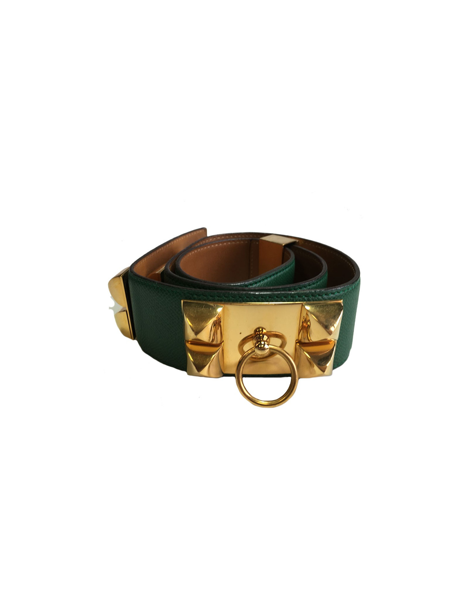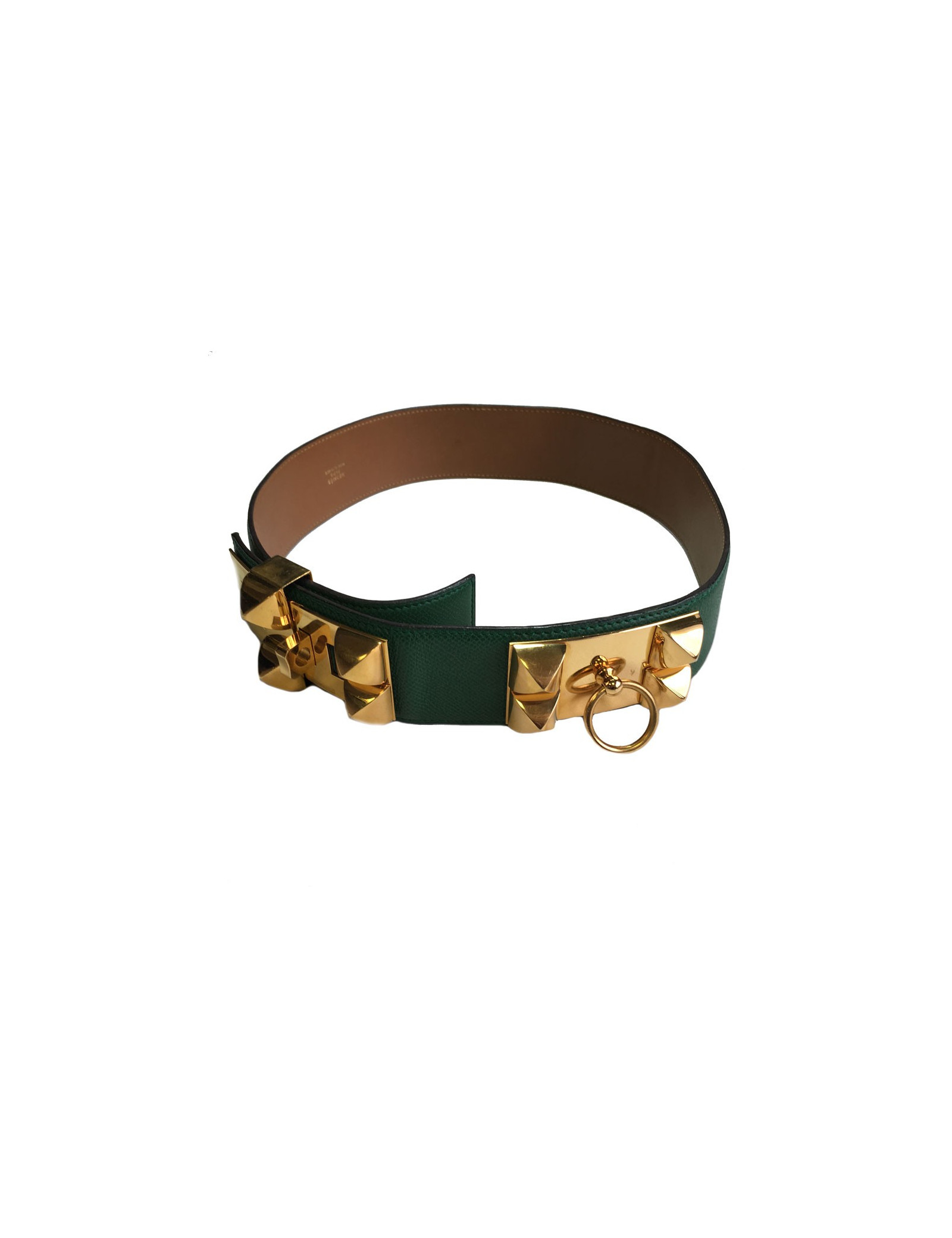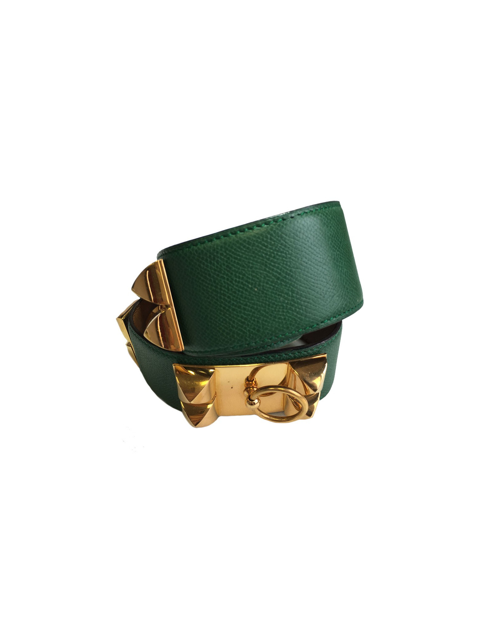 Ceinture Médor Hermès T70 en cuir courchevel vert et bijouterie dorée.