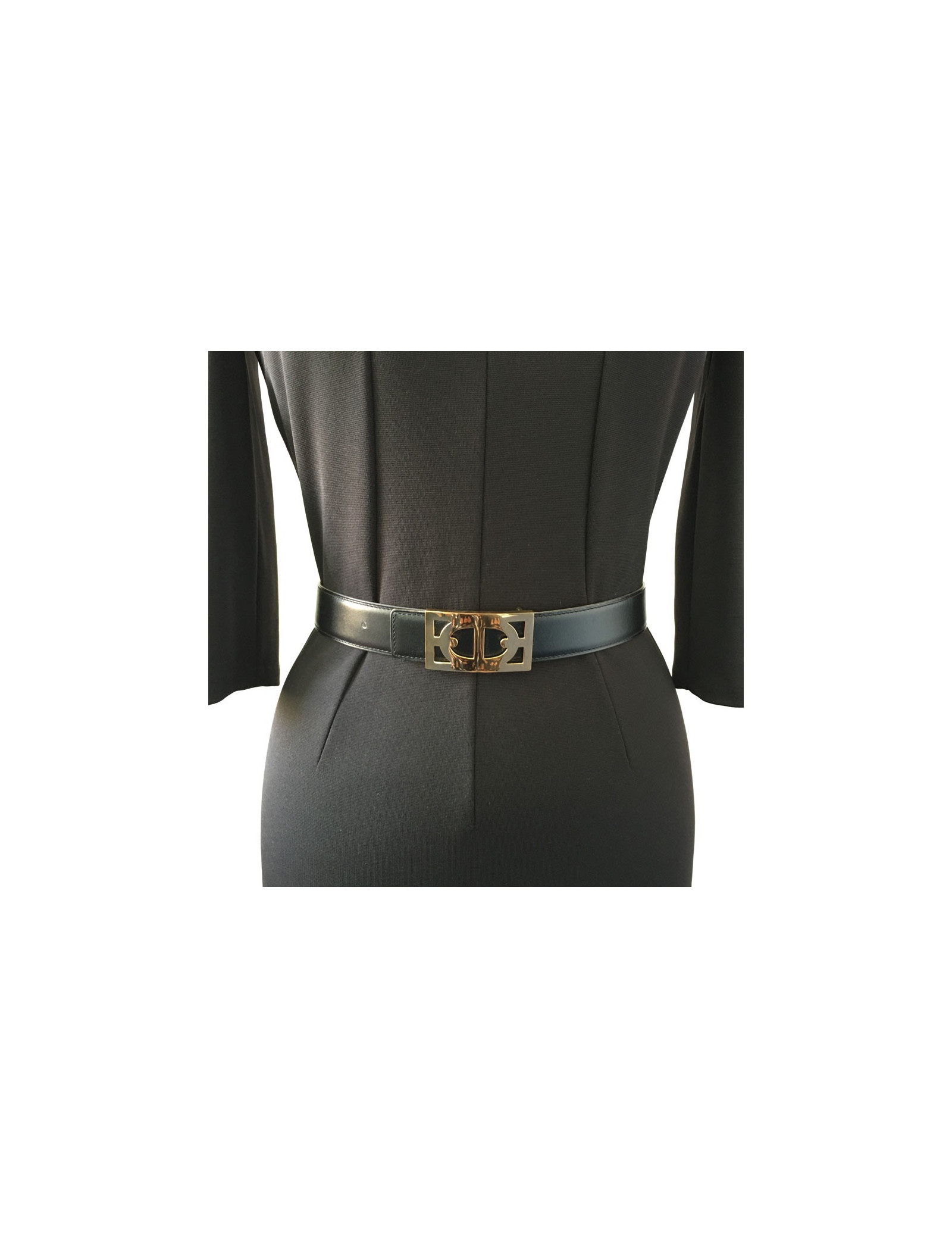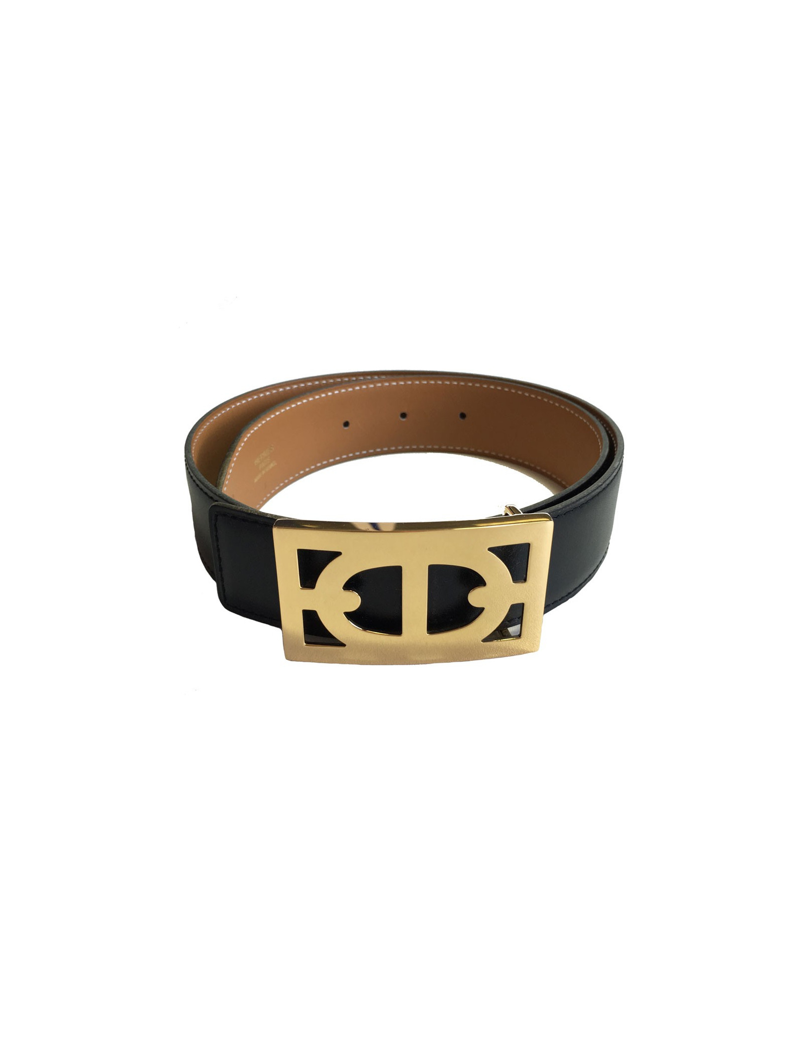 Ceinture HERMES en cuir lisse noir et boucle en métal doré T65