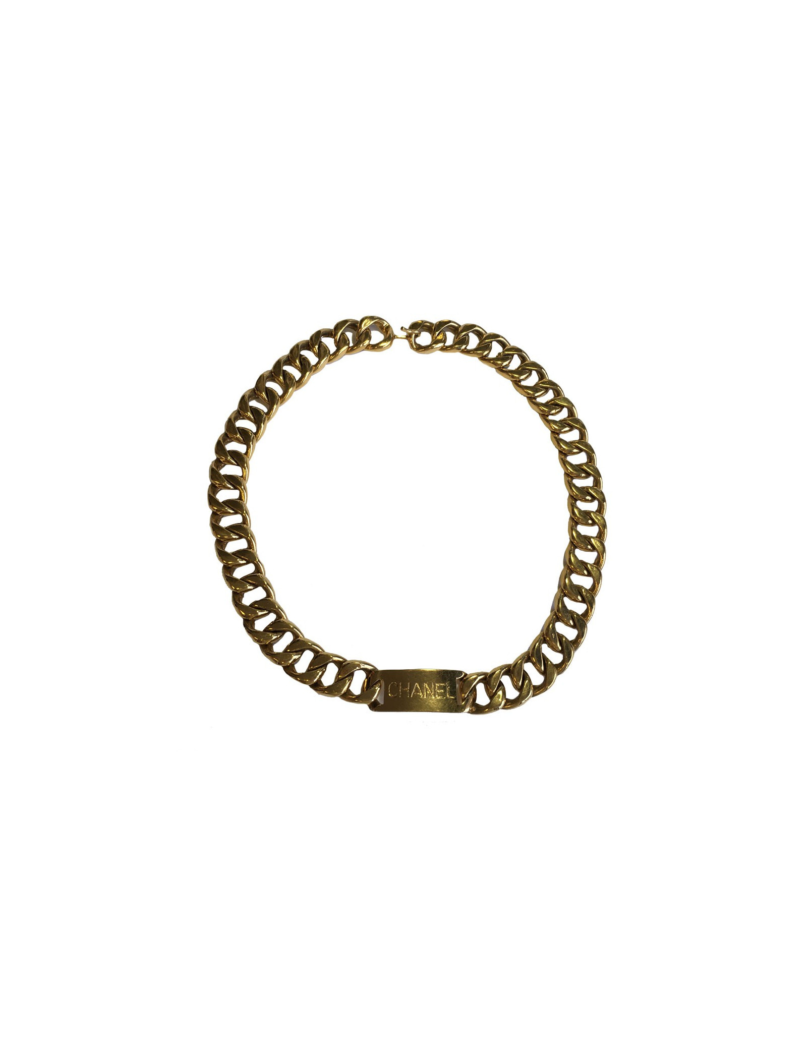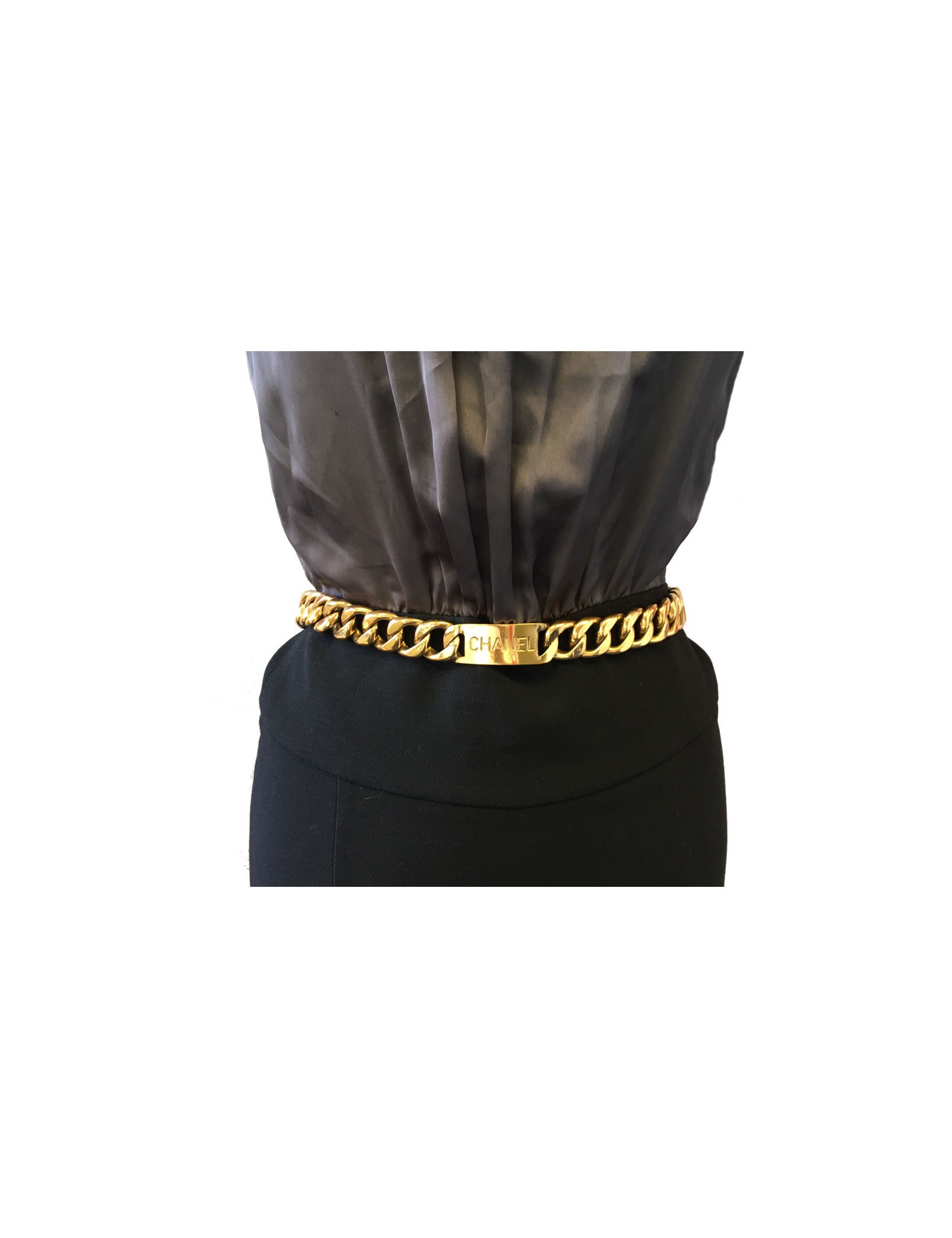 80's!! Ceinture CHANEL 80’ chaine à grosse maille en métal doré. Au centre une plaque avec la marque CHANEL gravée sur le devant.