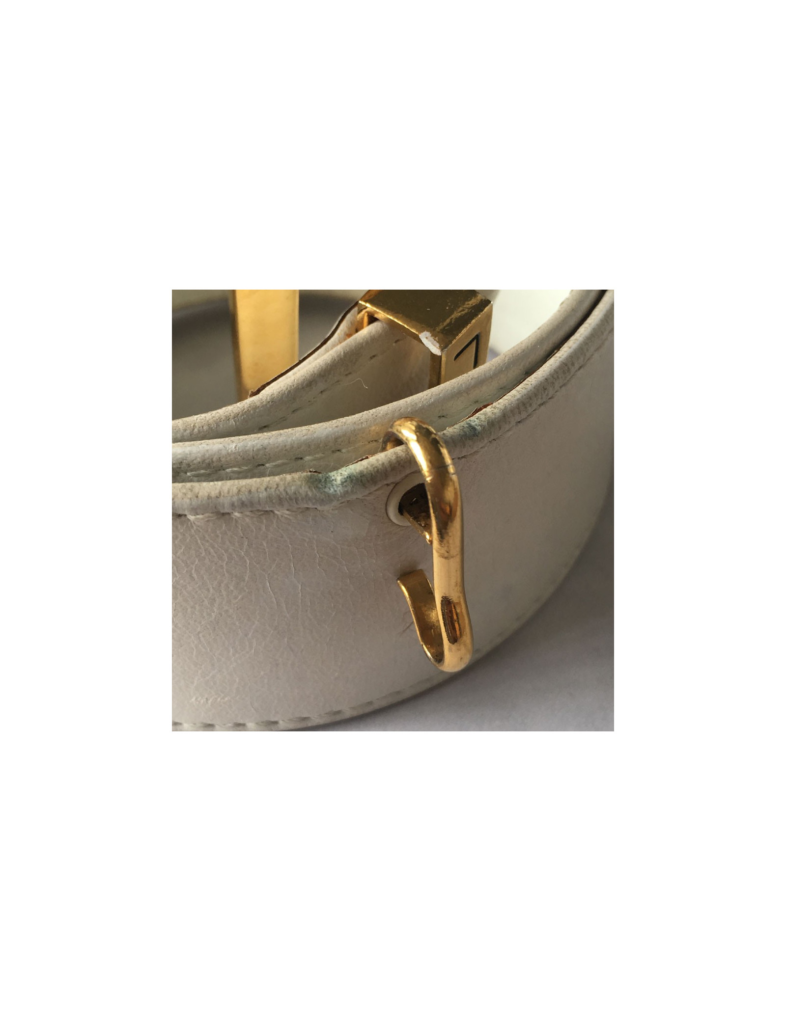 Ceinture Chanel en cuir blanc et chaîne en métal doré. Fermoir en métal doré. CHANEL inscrit sur le fermoir. Une pièce dorée termine la ceinture.