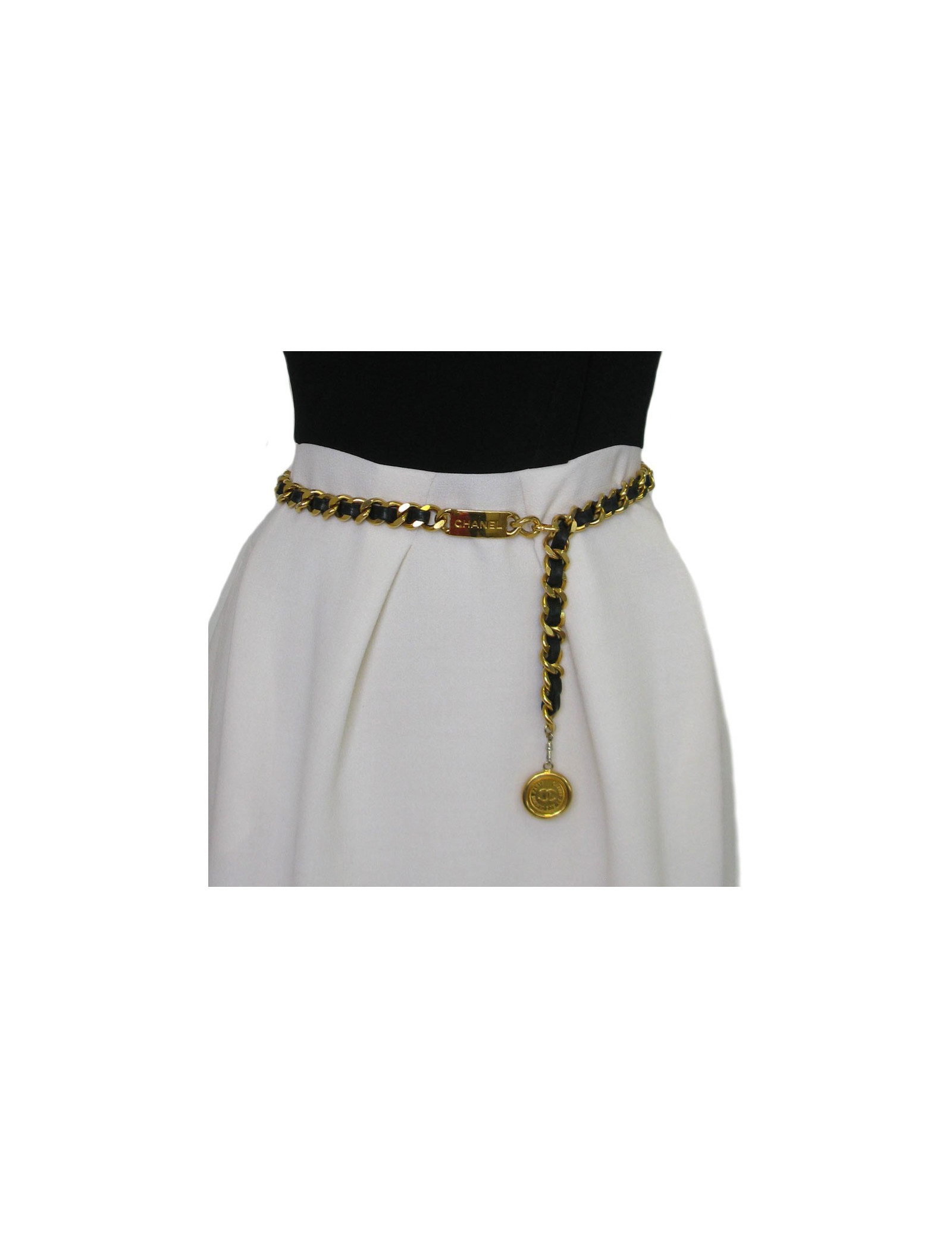 Très belle ceinture Chanel, chaîne en métal doré entrelacée de cuir noir. CHANEL gravé sur une plaque en métal doré. Une pièce
