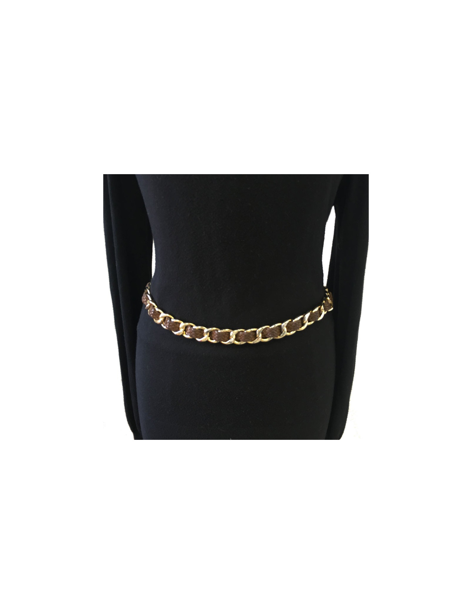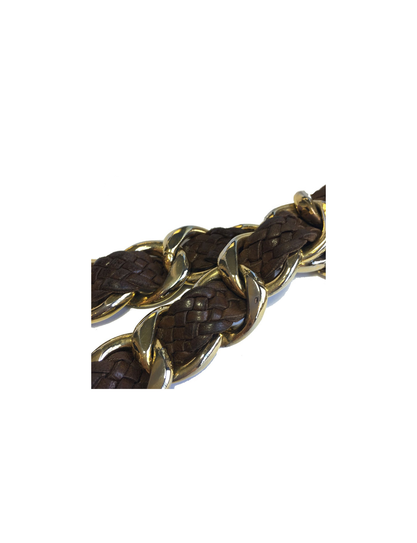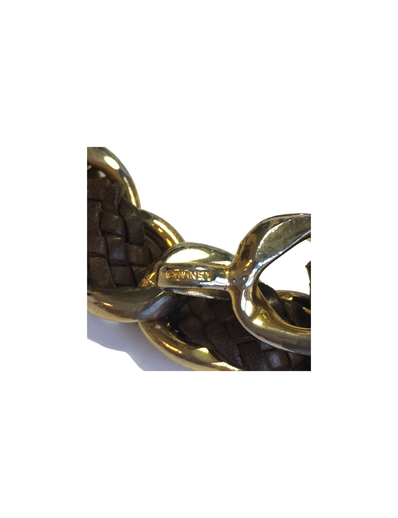 Belle ceinture Chanel en métal doré entrelacé de cuir tressé marron. Ceinture vintage.