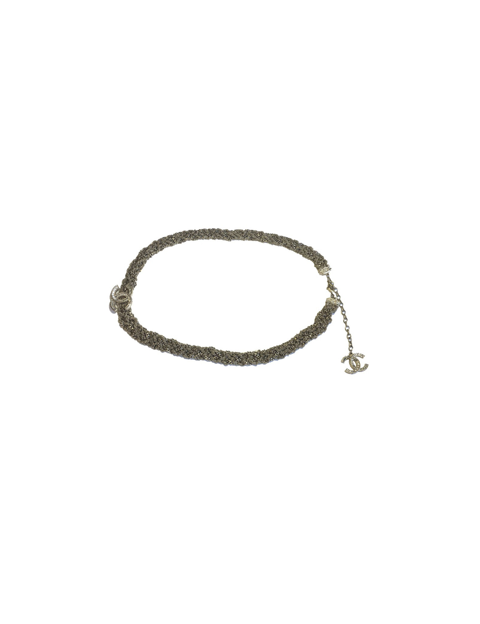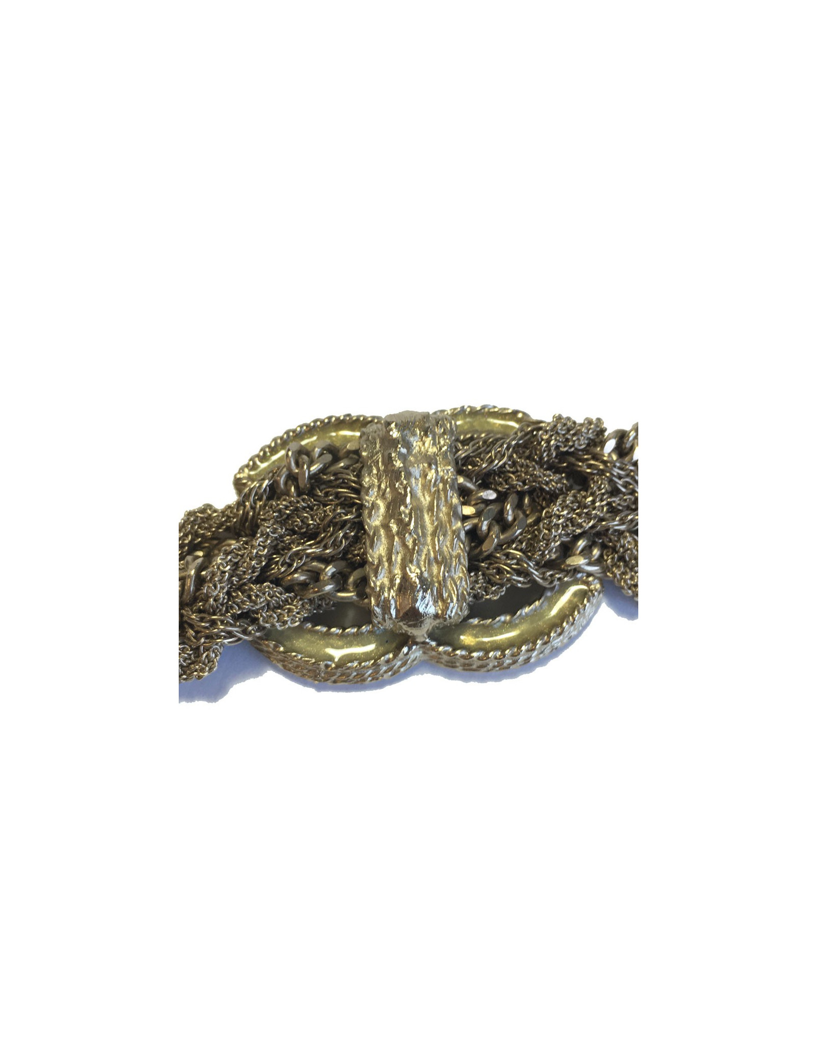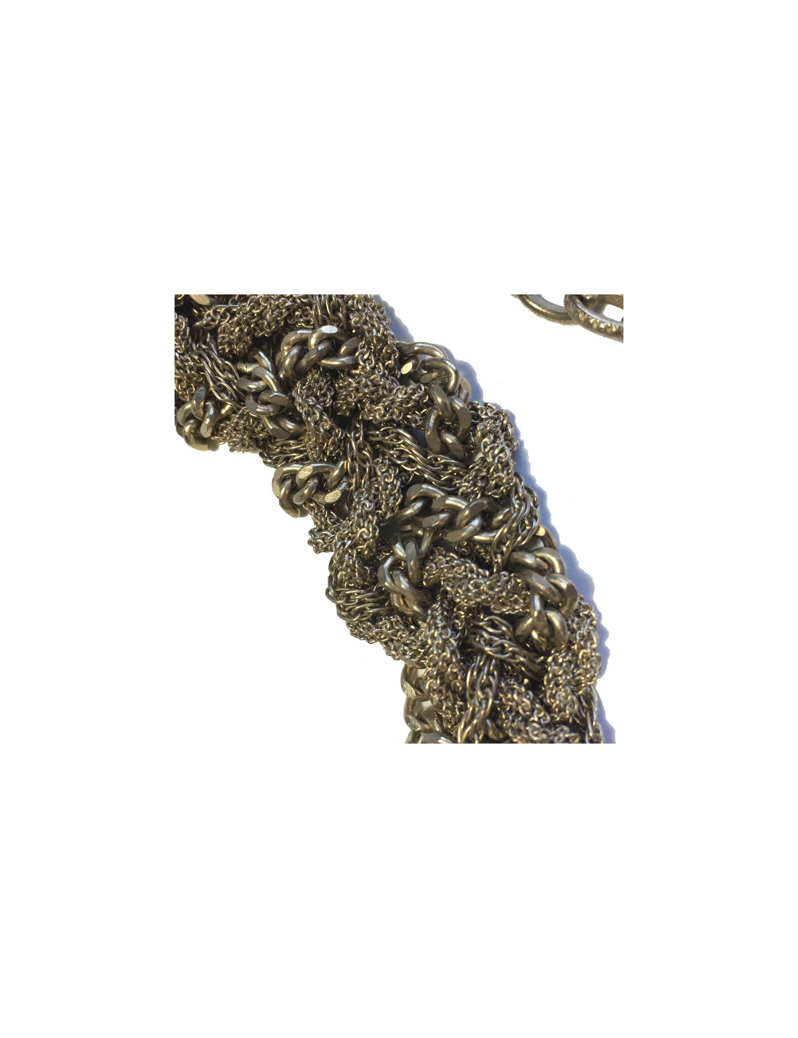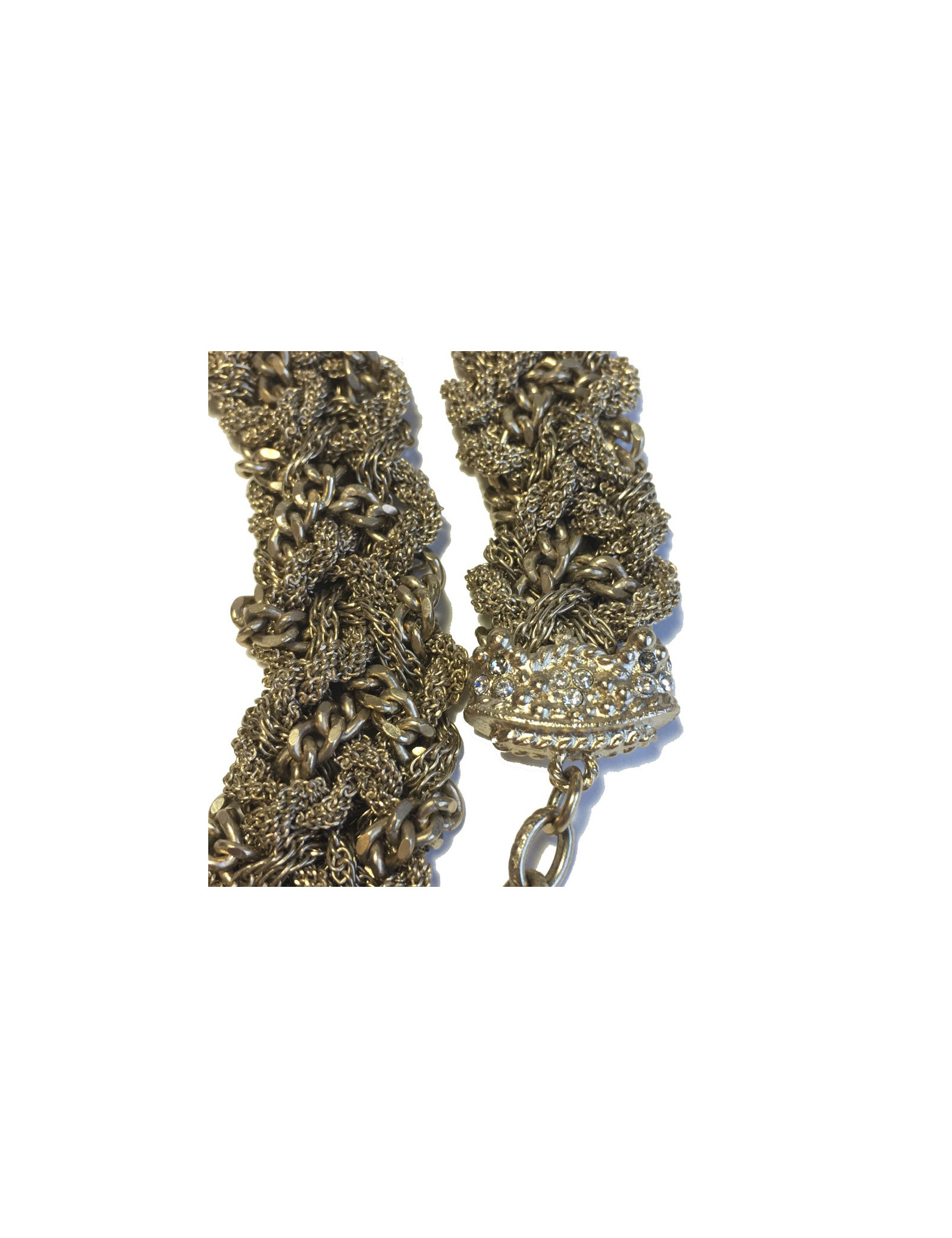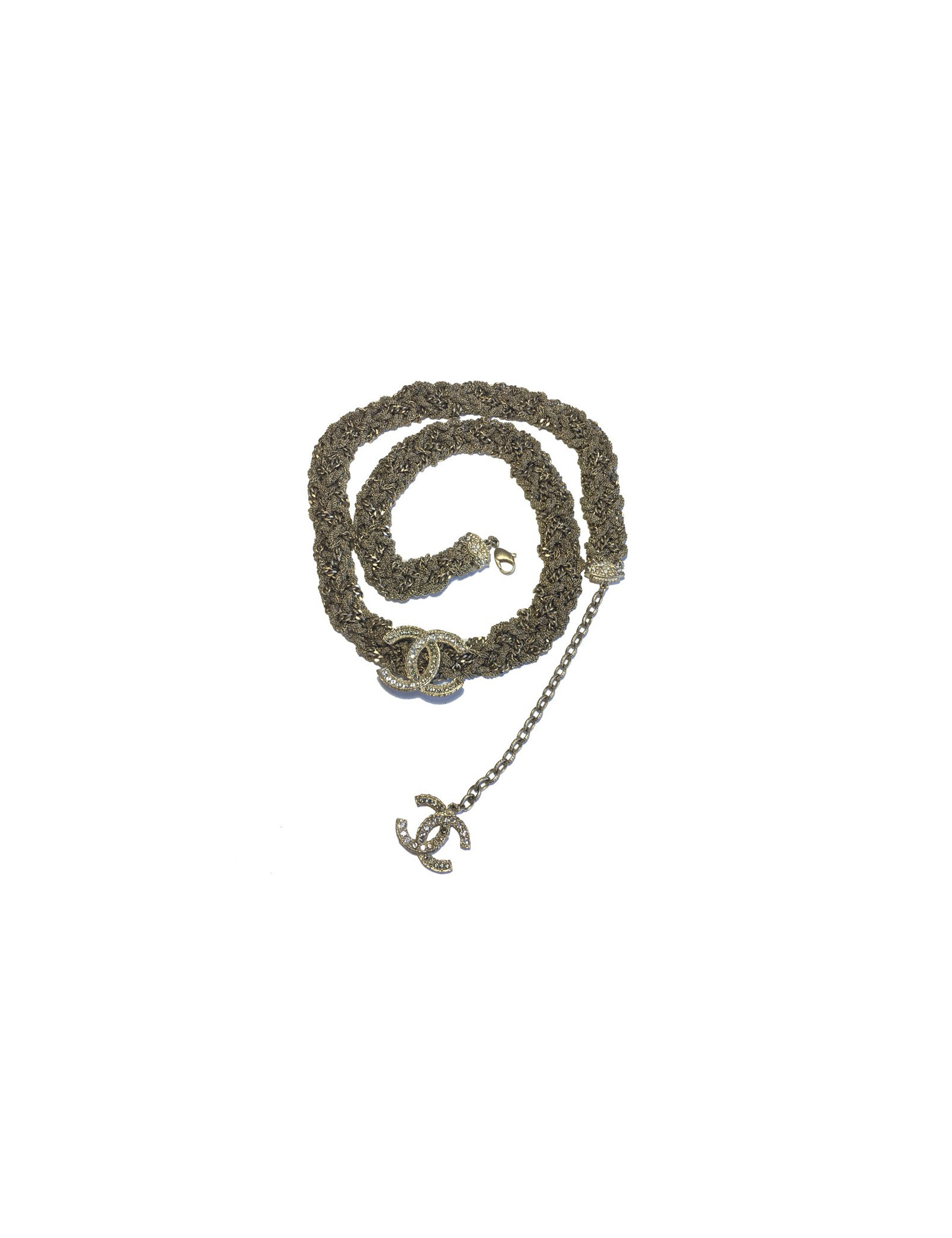 Magnifique ceinture Chanel, différentes chaînes entrelacées en métal de couleur or pâle. Elle est agrémentée de deux beaux double C en métal doré, sertis de strass. C'est une série limitée.