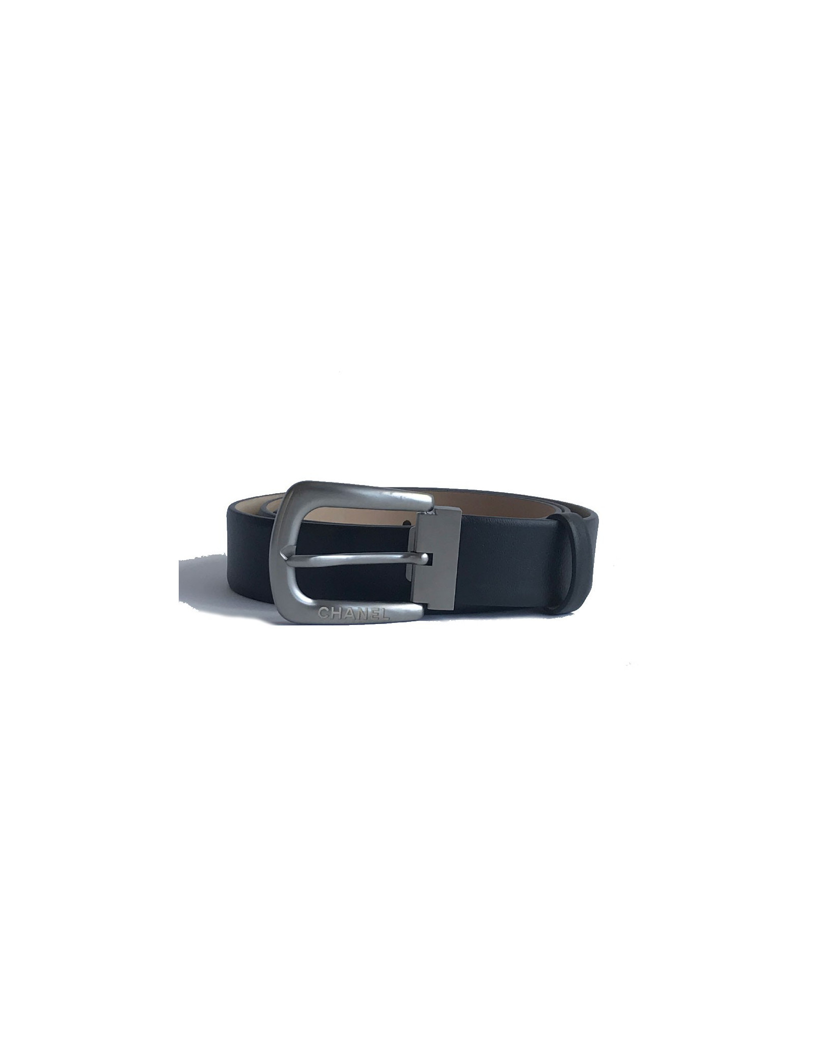 Ceinture Chanel en cuir lisse noir, intérieur en cuir naturel. Boucle en métal argent mat. Inscription CHANEL sur le bas de la boucle. Taille 95/38. Fabrication italienne.